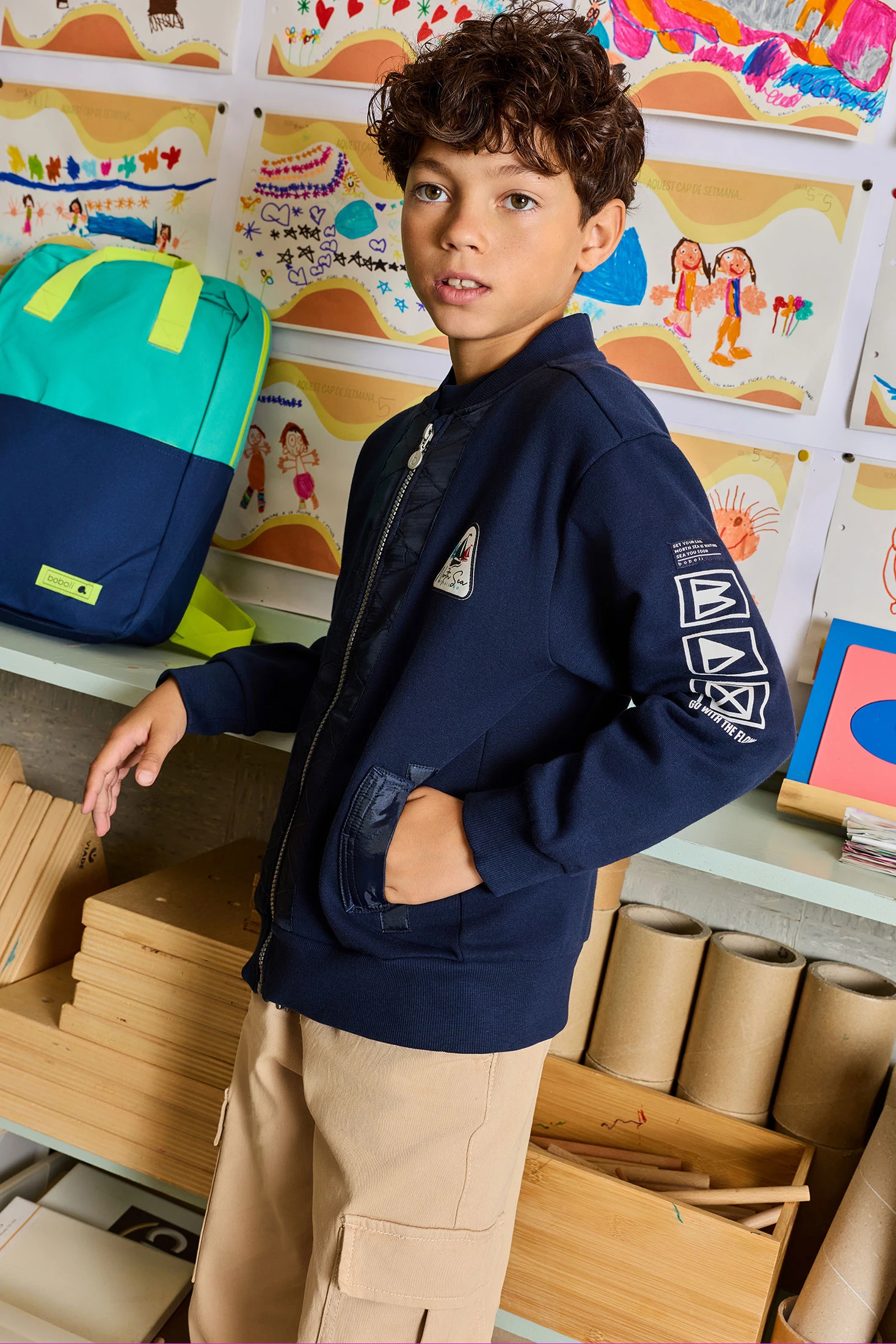 Casaco de pelúcia para menino em azul-marinho, ideal para as temporadas de outono e inverno graças ao seu tecido quente e confortável. Possui fecho de zíper e mangas compridas para um ajuste seguro, disponível em tamanhos de 2 a 14. Perfeito para combinar com jeans ou calças casuais, adiciona um estilo clássico e versátil ao guarda-roupa infantil.