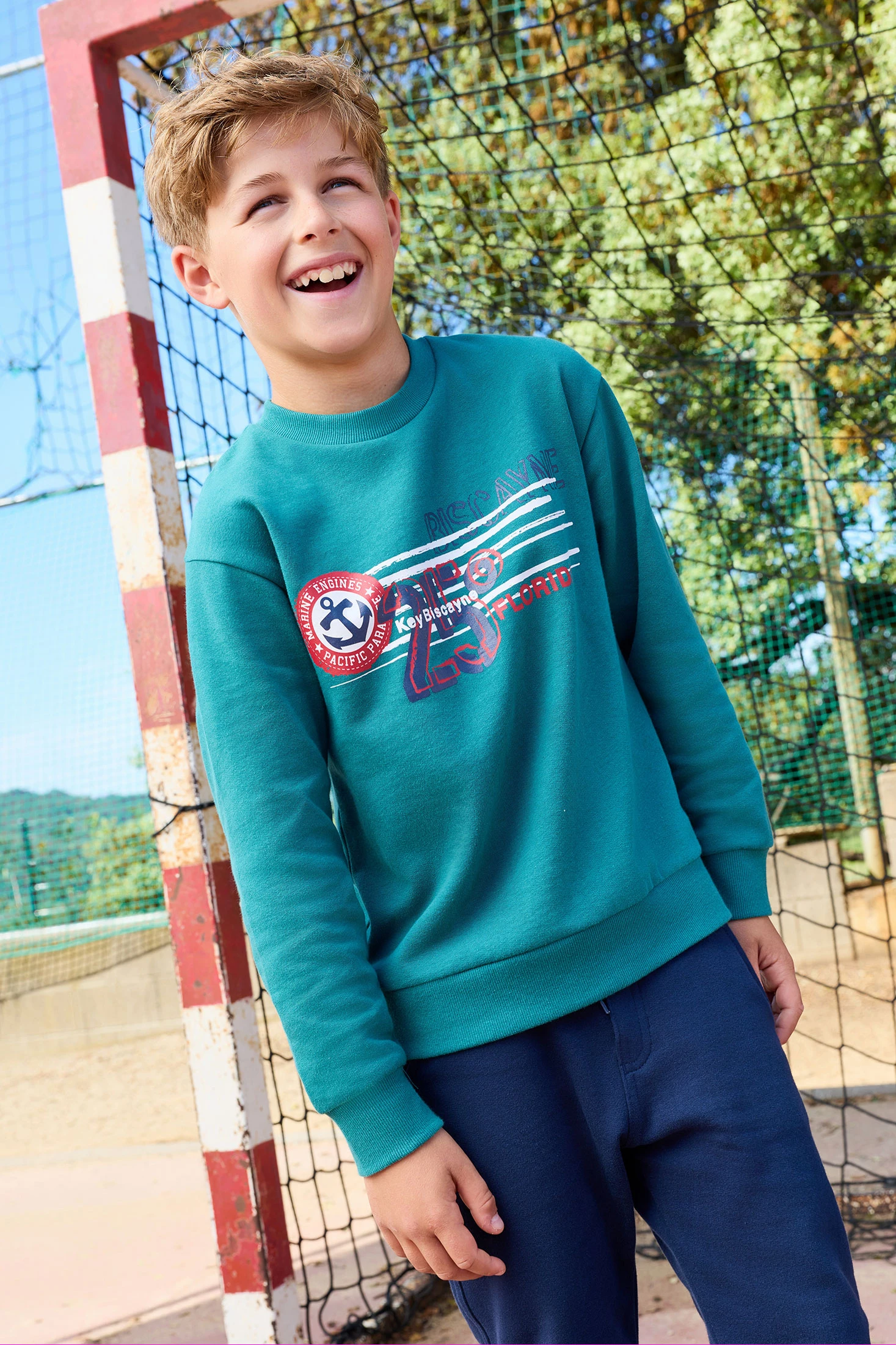 Conjunto de algodão verde para menino, ideal para os meses de outono e inverno. Inclui uma camisola quente acompanhada de calças, ambas confeccionadas num tecido de malha que garante conforto e suavidade durante todo o dia. O design moderno da camisola oferece um estilo atual, enquanto as calças permitem um ajuste confortável e versátil. Disponível em tamanhos de 2 a 14 anos, este conjunto é essencial para o dia-a-dia, permitindo combinações fáceis com outras peças para um look casual. Perfeito para manter os pequenos aquecidos e confortáveis durante as suas aventuras outonais e invernais.