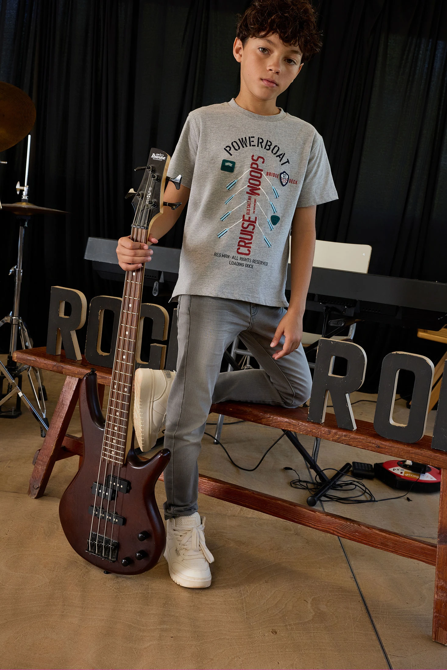 Camiseta de algodão cinza para menino, peça essencial em qualquer guarda-roupa infantil, combina conforto com um estilo clássico e versátil. Fabricada em um tecido de malha suave, assegura uma sensação de conforto em contacto com a pele e permite liberdade de movimento. O seu tom bege neutro é ideal para combinar com uma variedade de cores e estilos, sendo apropriada para todas as estações. Apresenta um design de gola redonda que se adapta tanto a situações casuais como a eventos mais formais. Disponível em tamanhos que vão dos 2 aos 14 anos, pode ser facilmente combinada com jeans ou calças para um estilo descontraído e elegante.