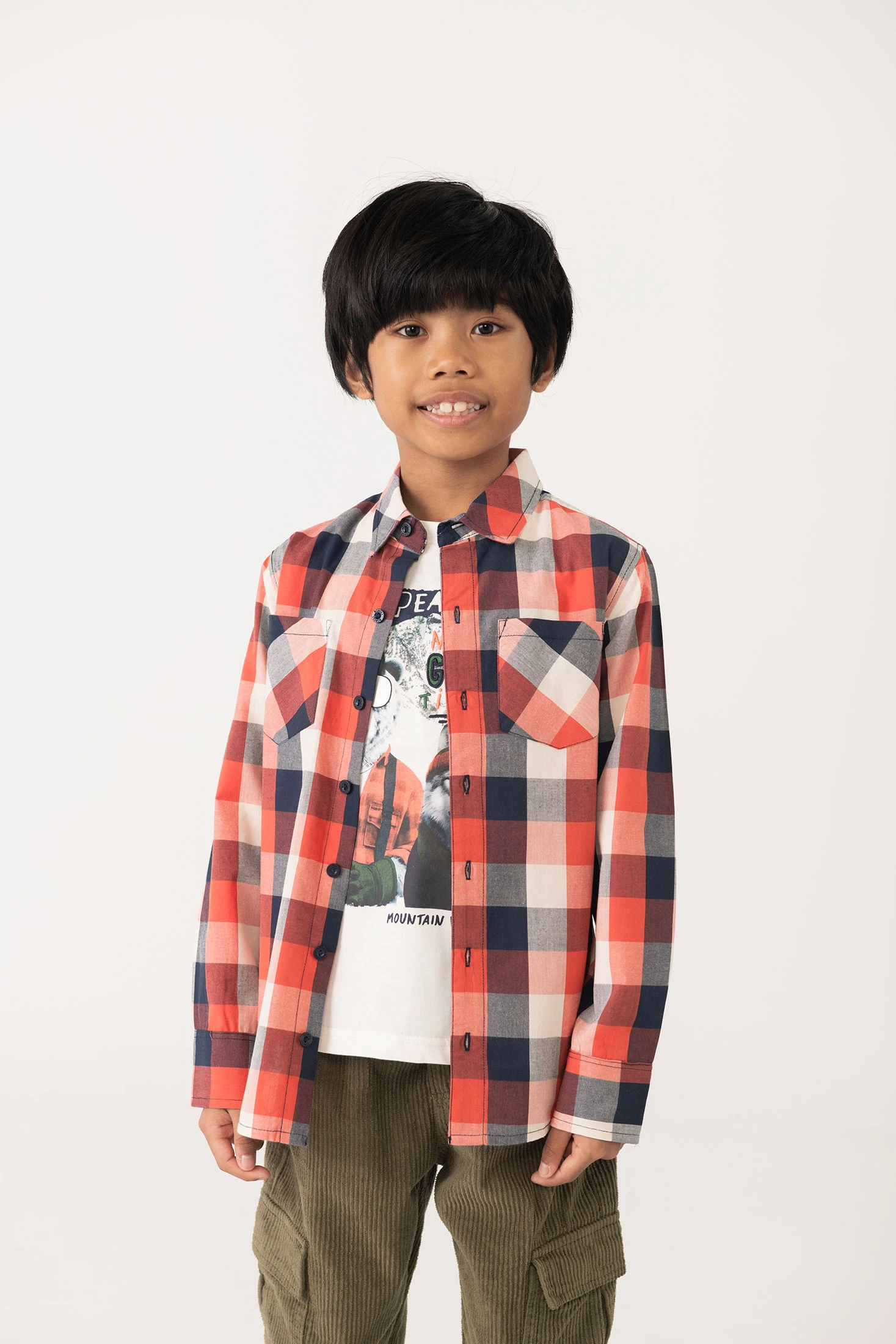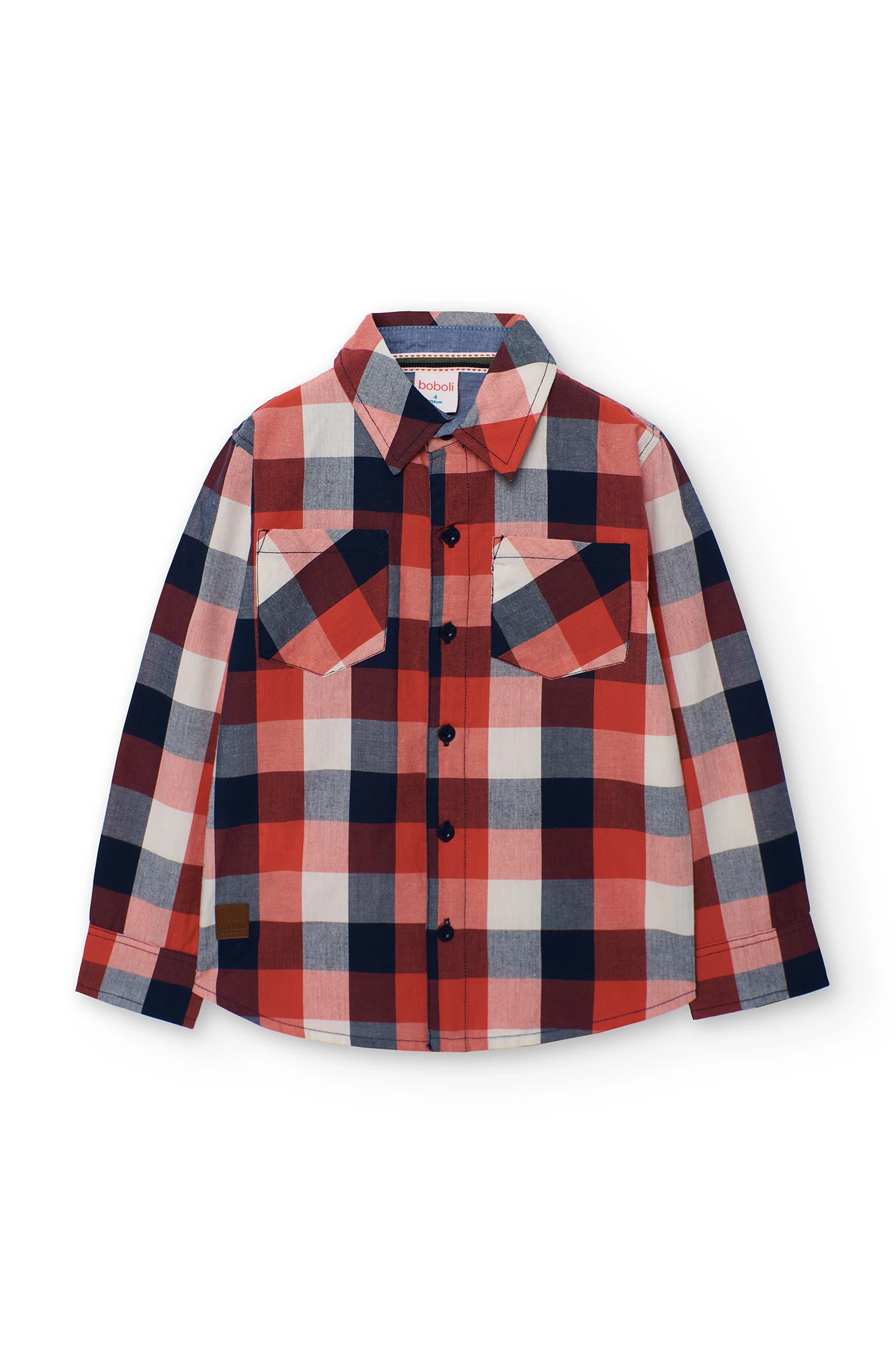 Camisa para criança com design clássico de quadrados em tons de vermelho, azul-marinho e branco, ideal para as temporadas de outono e inverno. Feita de algodão suave, oferece conforto e calor nos dias frescos. Possui uma gola tradicional com botões e dois bolsos no peito, proporcionando um toque prático e elegante. Disponível em tamanhos de 2 a 14 anos, combina facilmente com calças de ganga para um look casual ou com calças de vestir para ocasiões mais formais.