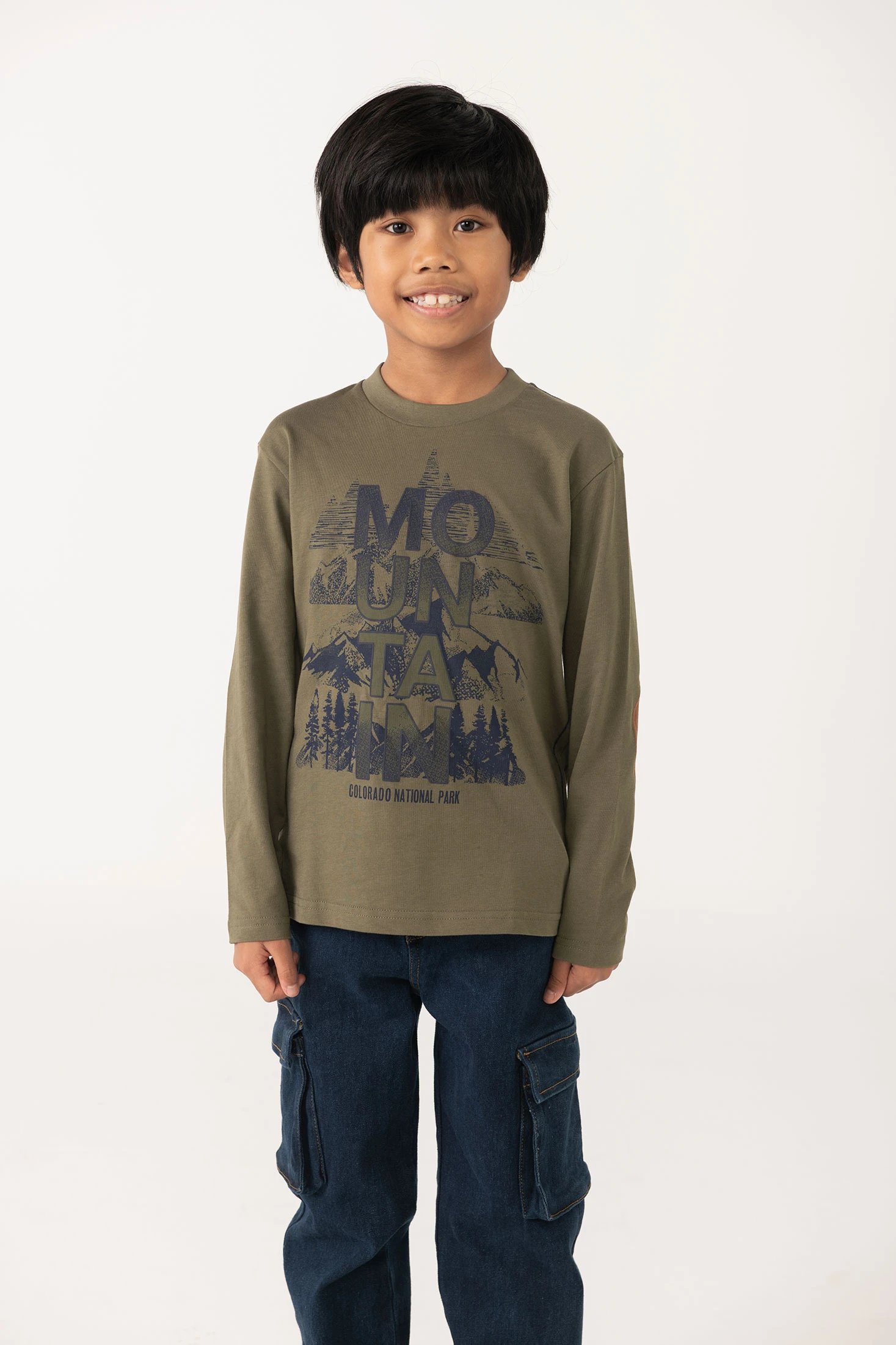 T-shirt de algodão verde para menino com estampado de montanhas, ideal para outono e inverno. Confeccionada num tecido de malha suave, oferece conforto e calor nos dias frios. A sua cor verde oliva e o design inspirado no parque natural do Colorado proporcionam um estilo aventureiro. Gola redonda que facilita o uso diário e disponível em tamanhos de 2 a 14 anos. Combina perfeitamente com jeans ou calças casuais para um look relaxado e explorador.