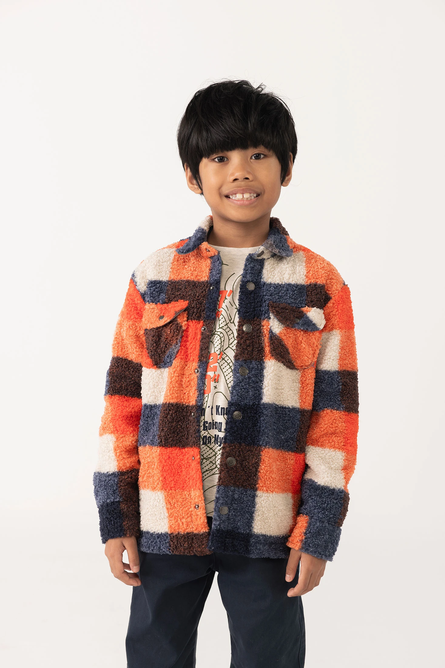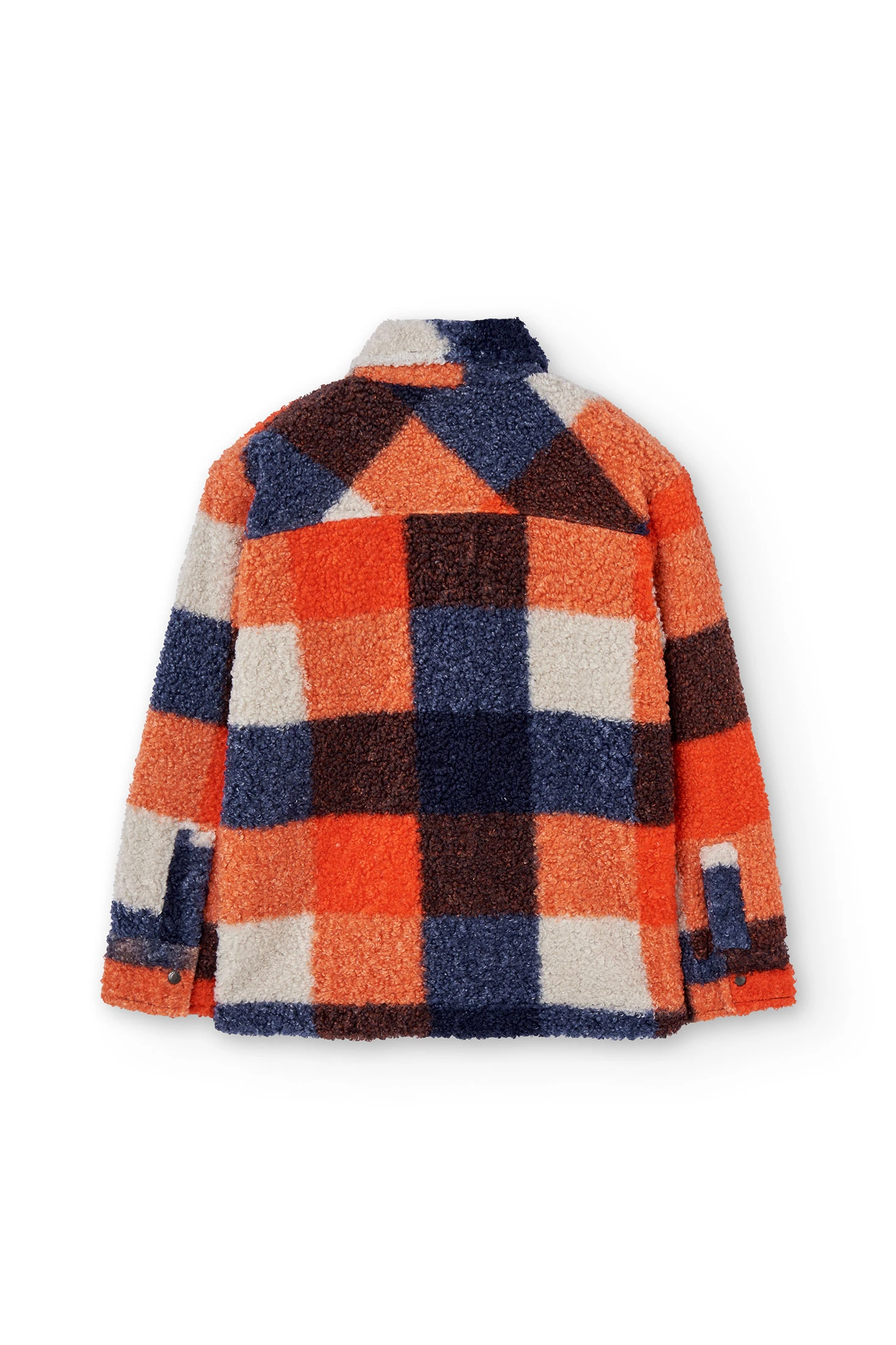Casaco de carneiro perfeito para a temporada de outono e inverno, proporcionando calor e um estilo único. Estampado aos quadrados em tons de azul, laranja e branco oferece um design moderno e atraente. Dotado de uma gola clássica e fecho frontal com botões de pressão, é ideal para várias ocasiões. As mangas compridas garantem proteção nos dias frios, e o material suave de carneiro assegura máxima comodidade. Disponível em tamanhos que vão dos 2 aos 14 anos, este casaco torna-se um complemento colorido do guarda-roupa infantil.