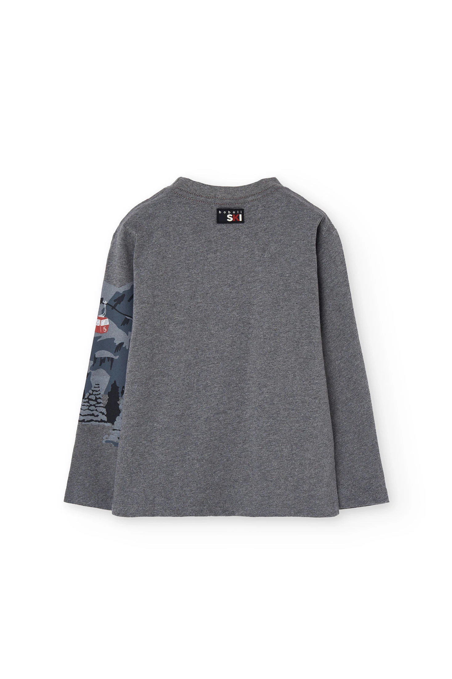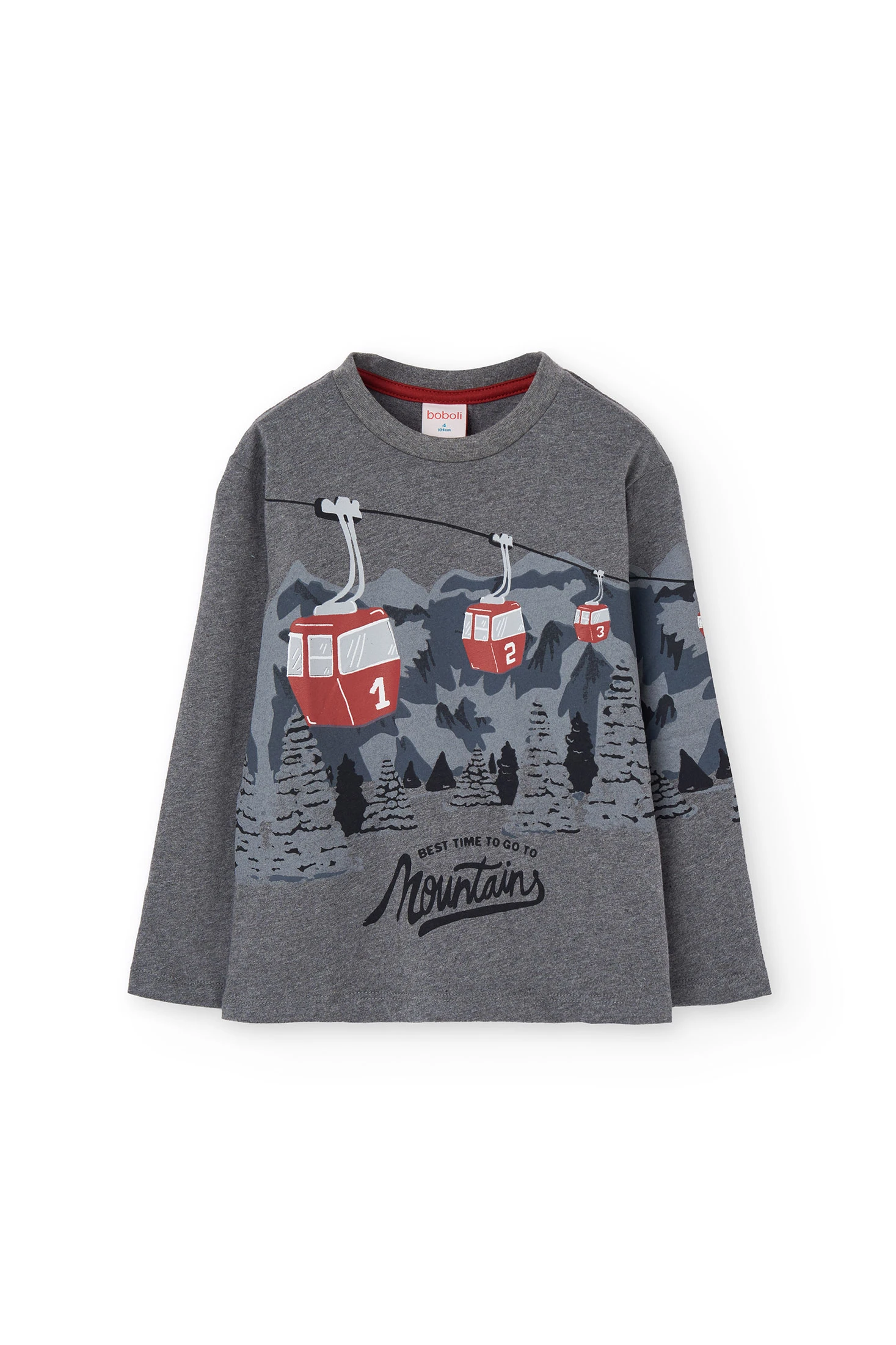Camiseta de algodão para menino em cor cinza escuro, desenhada com um encantador estampado de teleféricos em vermelho. Ideal para as estações de outono e inverno graças ao seu tecido quente e confortável, perfeita para pequenos aventureiros. Confeccionada num material suave, apresenta uma gola redonda e mangas compridas que garantem o conforto diário. Disponível em tamanhos de 2 a 14 anos, combina facilmente com qualquer roupa, adicionando um toque moderno e divertido ao guarda-roupa infantil.
