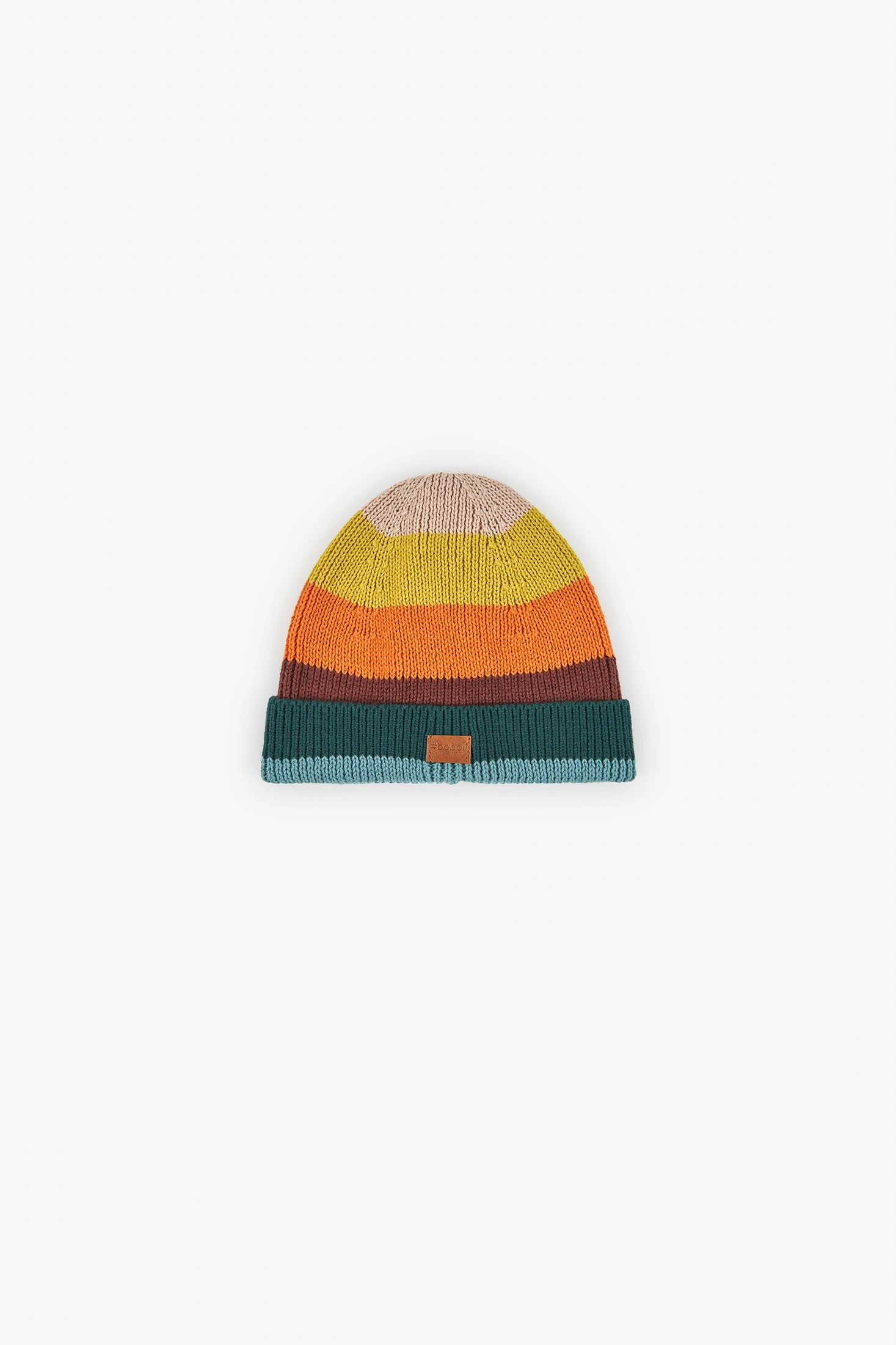 Gorro de malha bege com riscas multicolores, perfeito para manter as crianças aquecidas nos meses mais frios. O seu design combina tons bege, amarelo, laranja, castanho e verde, acrescentando um toque divertido e colorido ao vestuário de inverno. Fabricado com um tecido suave e quente, garante conforto e proteção contra o frio. Disponível em tamanhos de M a XXL, é ideal para crianças a partir de 2 anos. A sua versatilidade permite combiná-lo facilmente com casacos e jaquetas, completando qualquer conjunto de inverno com estilo e calor.