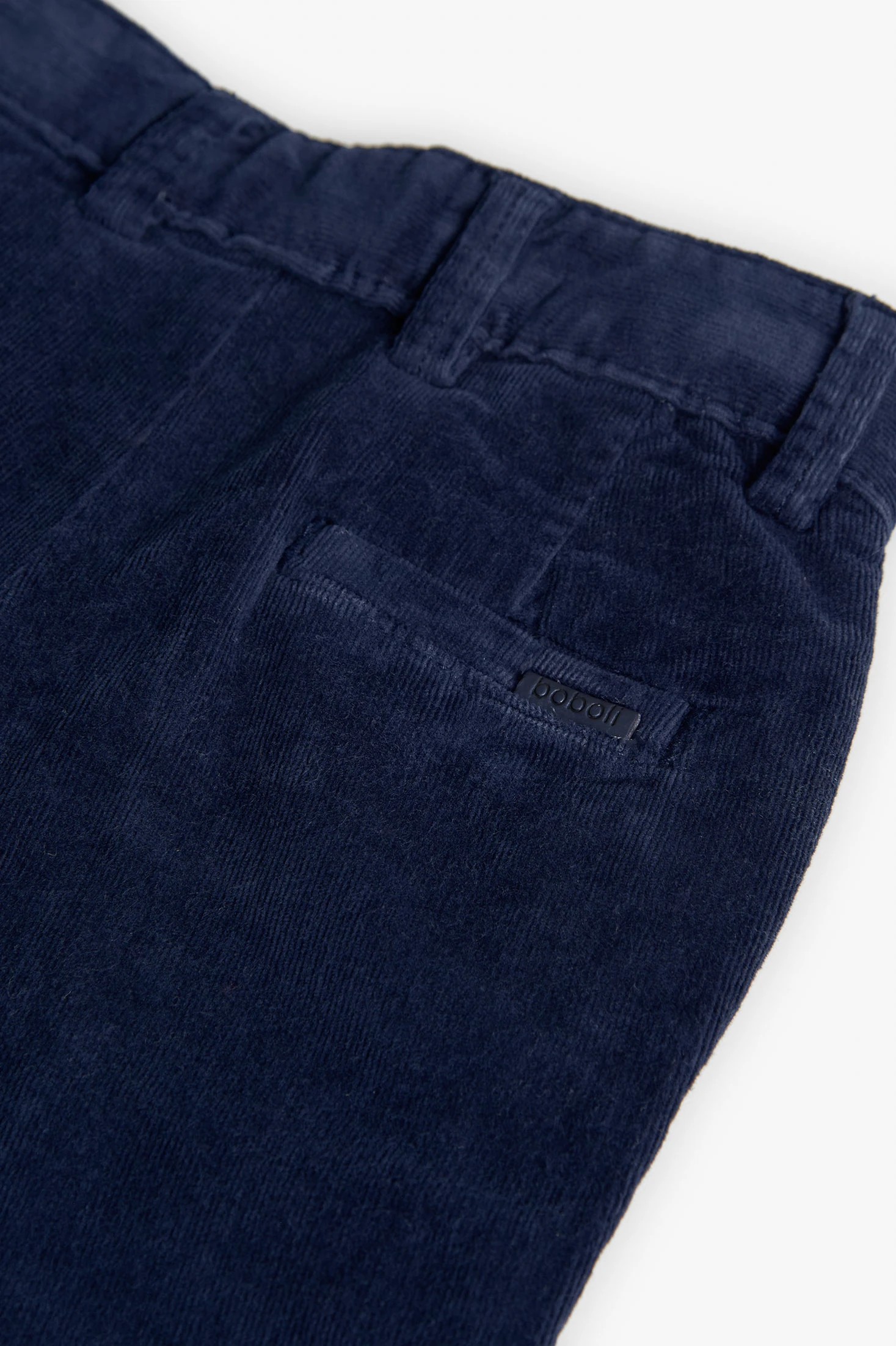 Calça de bombazina fina azul-marinho para menino, perfeita para a temporada de outono e inverno graças ao seu tecido quente e resistente. Design clássico que acrescenta versatilidade, permitindo combinar facilmente com camisas ou camisolas, ideal para ocasiões tanto casuais como mais formais. Fabricada em bombazina fina de alta qualidade, oferece conforto e durabilidade no uso diário. Disponível em tamanhos de 12 meses a 10 anos, adapta-se ao crescimento do seu filho. Inclui uma cintura ajustável que garante um ajuste confortável e seguro, além de detalhes finos que realçam o seu estilo.