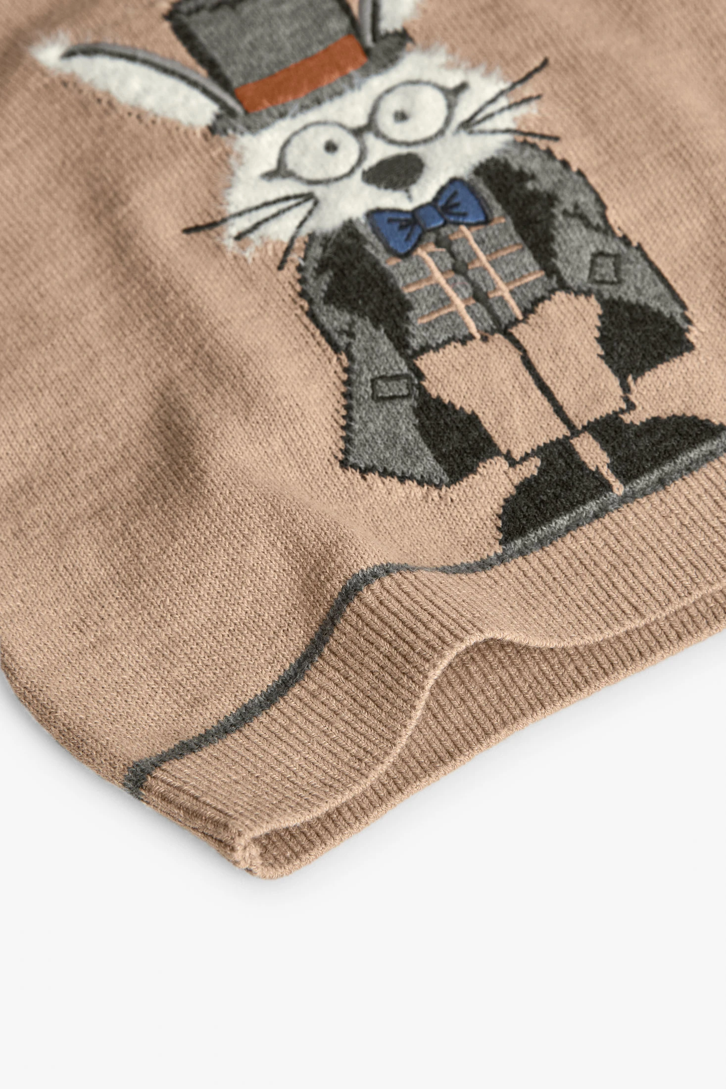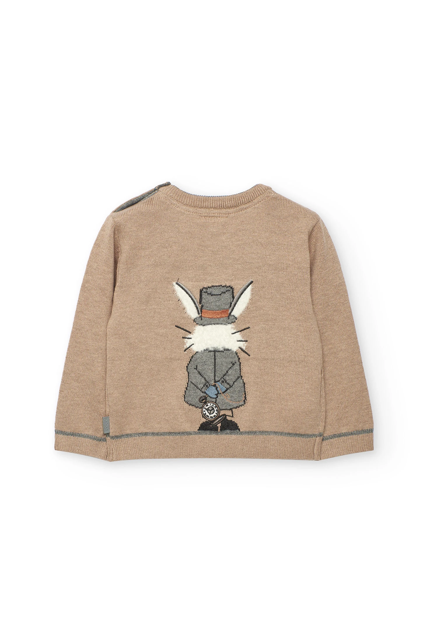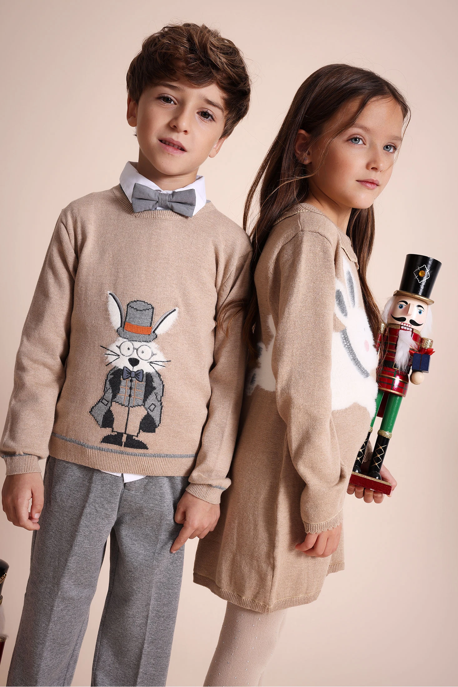 Camisola de malha para menino em cor bege com design de animais, ideal para os meses de outono e inverno. Fabricado em um tecido de malha suave, proporciona grande conforto e calor, adaptando-se perfeitamente aos dias mais frios. Gola redonda e mangas compridas garantem um ajuste confortável, disponível em tamanhos desde 12 meses até 10 anos. Peça versátil que combina facilmente com jeans ou calças, adicionando um toque de estilo terno e divertido ao guarda-roupa dos mais pequenos.
