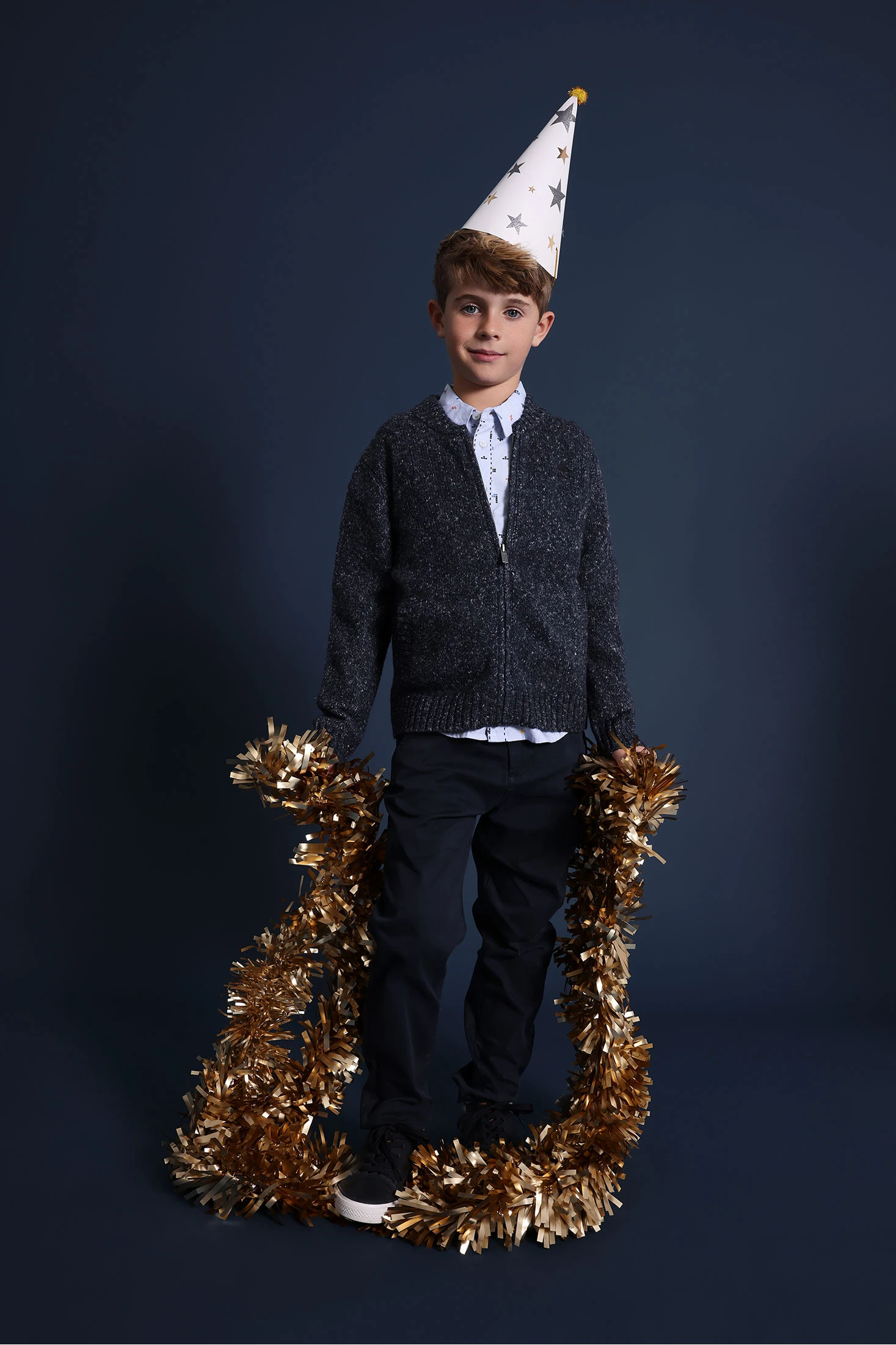 Casaco de malha para menino em azul-marinho, ideal para as temporadas de outono e inverno, combina um estilo moderno com funcionalidade. Confecionado com tecido de malha suave e quente, garante manter o seu filho aquecido durante os dias frios. Inclui fecho de correr e bolsos práticos, proporcionando conforto e um acabamento elegante. Disponível em tamanhos de 2 a 14 anos, esta peça versátil complementa tanto conjuntos casuais como mais formais, assegurando um visual impecável em cada uso.