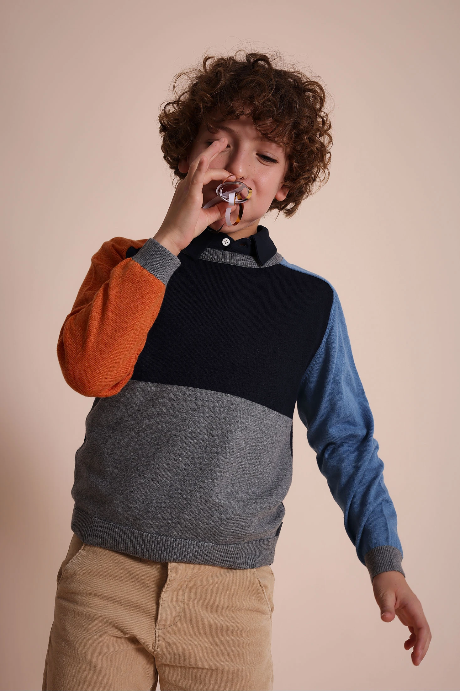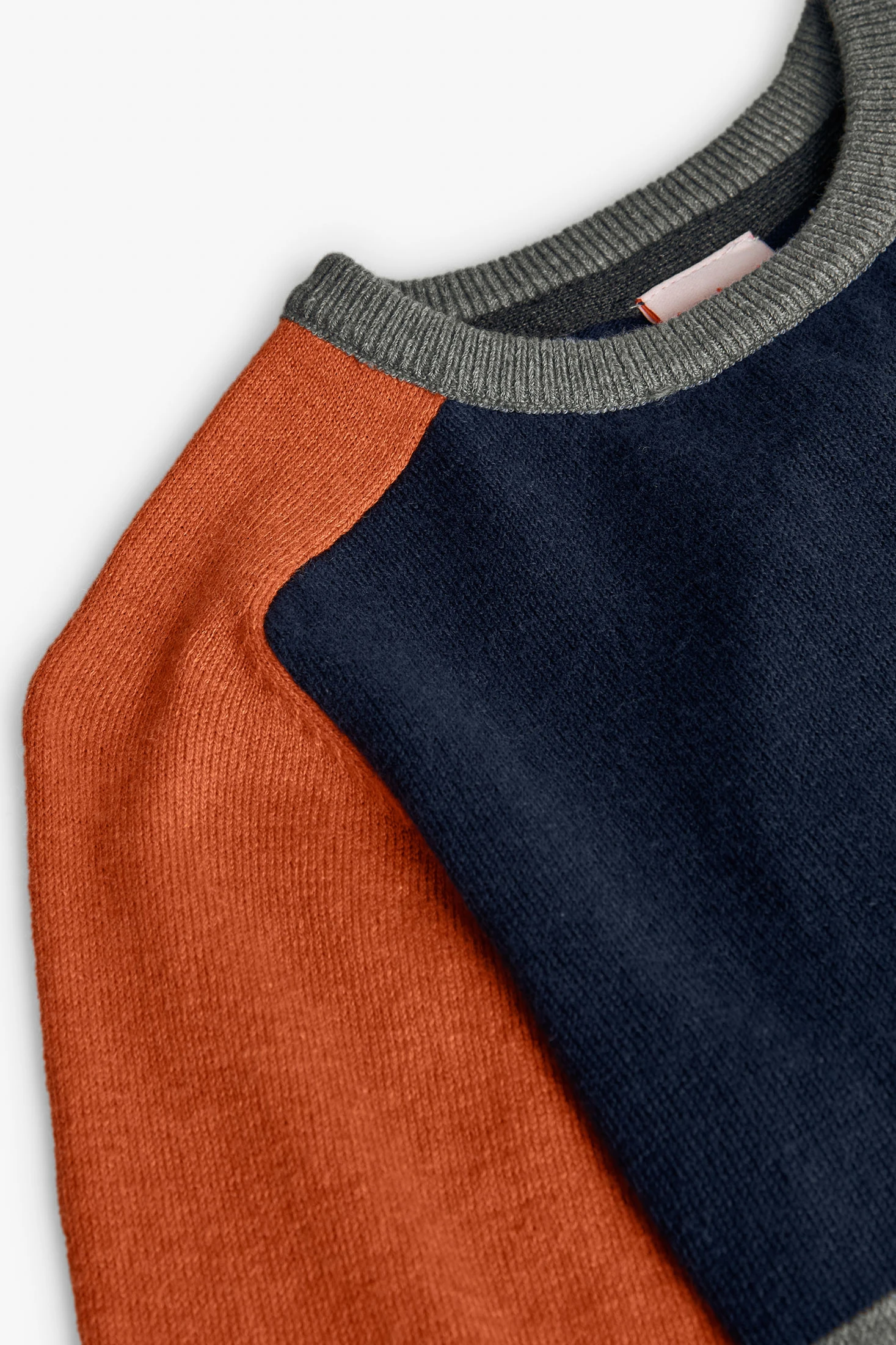 Pulôver de malha para menino em color block, design em tons de azul marinho, cinza, laranja e azul celeste, perfeito para os dias frescos de outono e inverno. Fabricado com uma textura suave e quente, garante conforto e bem-estar durante todo o dia. Incorpora uma gola redonda e mangas compridas para um look clássico e versátil. Disponível em tamanhos que vão dos 2 aos 14 anos, é ideal para combinar com jeans ou calças casuais, adicionando um toque elegante e acolhedor ao guarda-roupa do seu filho.