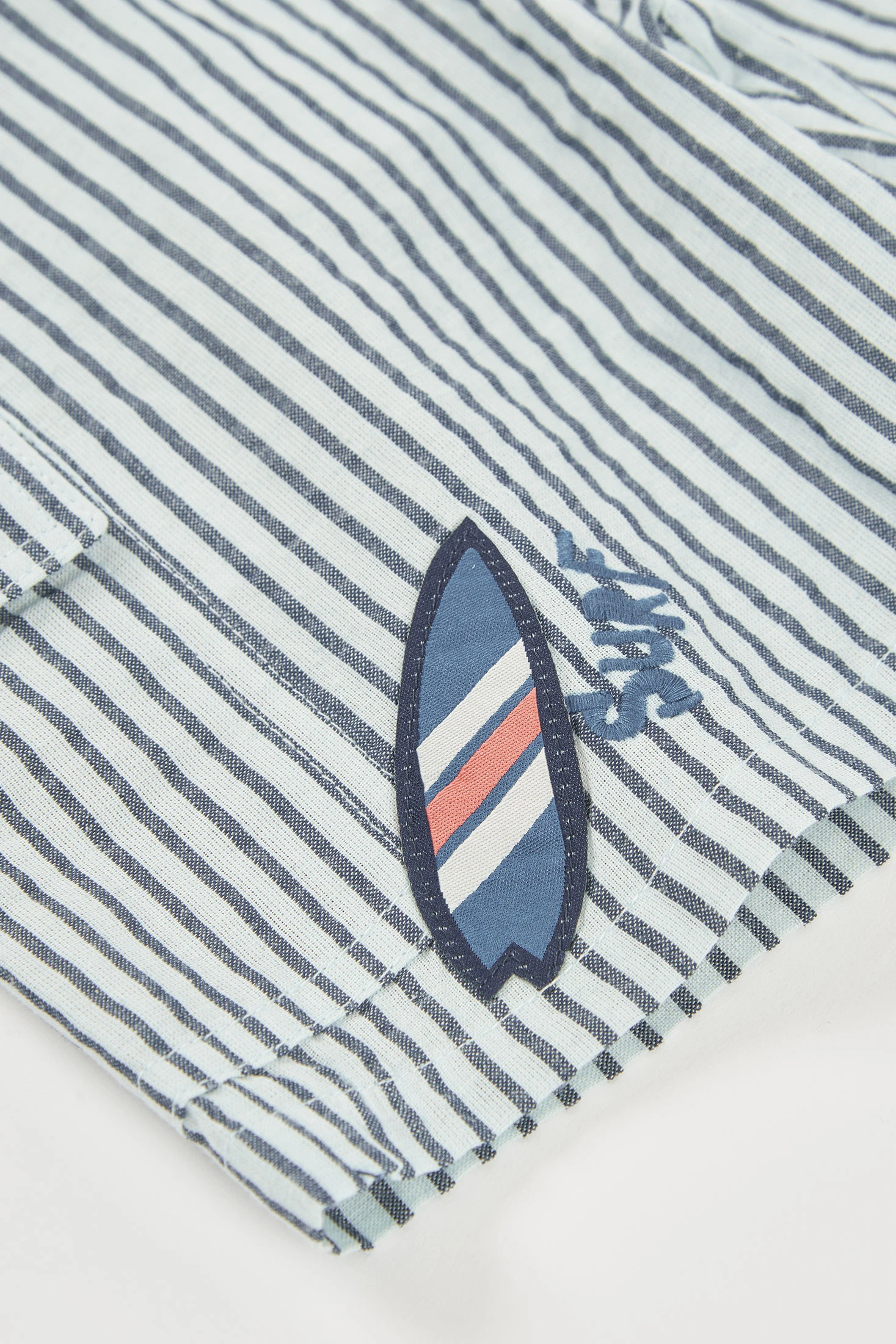 Bermudas de popelina listadas para menino, ideais para o verão, fabricadas num tecido fresco e leve. Apresentam um design de riscas azuis e brancas com remendos decorativos. A cintura elástica com cordão ajustável garante um ajuste confortável. Com bolsos laterais para maior funcionalidade, são perfeitas para um estilo casual e relaxado. Disponíveis em tamanhos de 12 meses até 10 anos, oferecem versatilidade para diferentes idades. Uma opção estilosa para um look de verão.