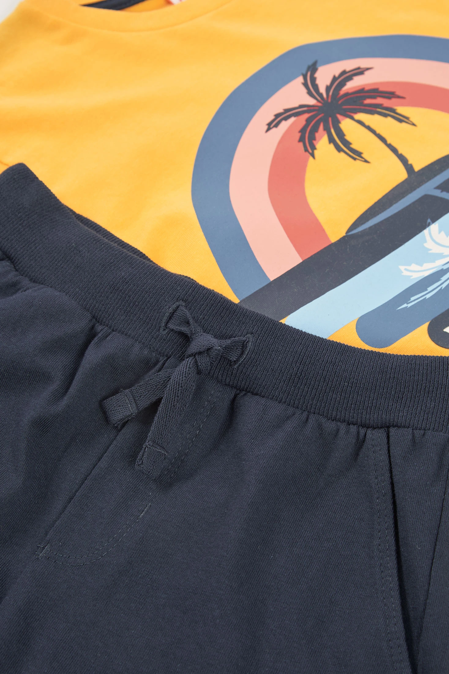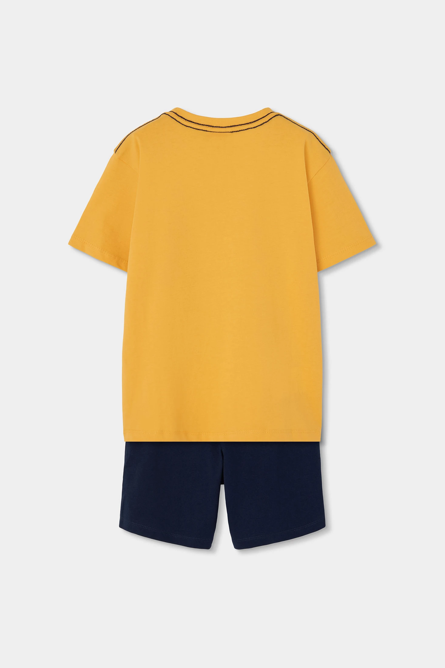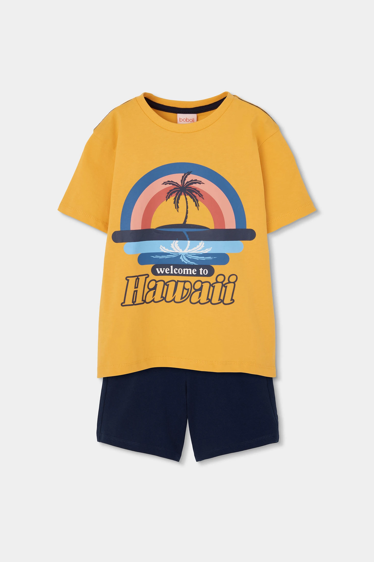 Conjunto de algodão para menino, perfeito para o verão. A camisola é de cor amarela com um estampado tropical em várias cores, proporcionando um ar fresco e divertido. Os calções em azul marinho com cintura elástica com cordão ajustável complementam o look. Ideal para crianças de 12 meses a 10 anos, este conjunto é fácil de combinar e adequado para todo o tipo de atividades ao ar livre, oferecendo conforto e estilo casual.
