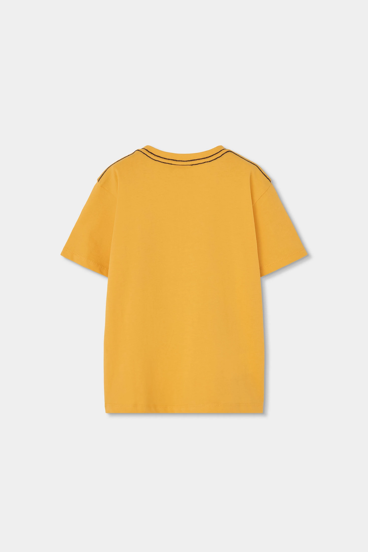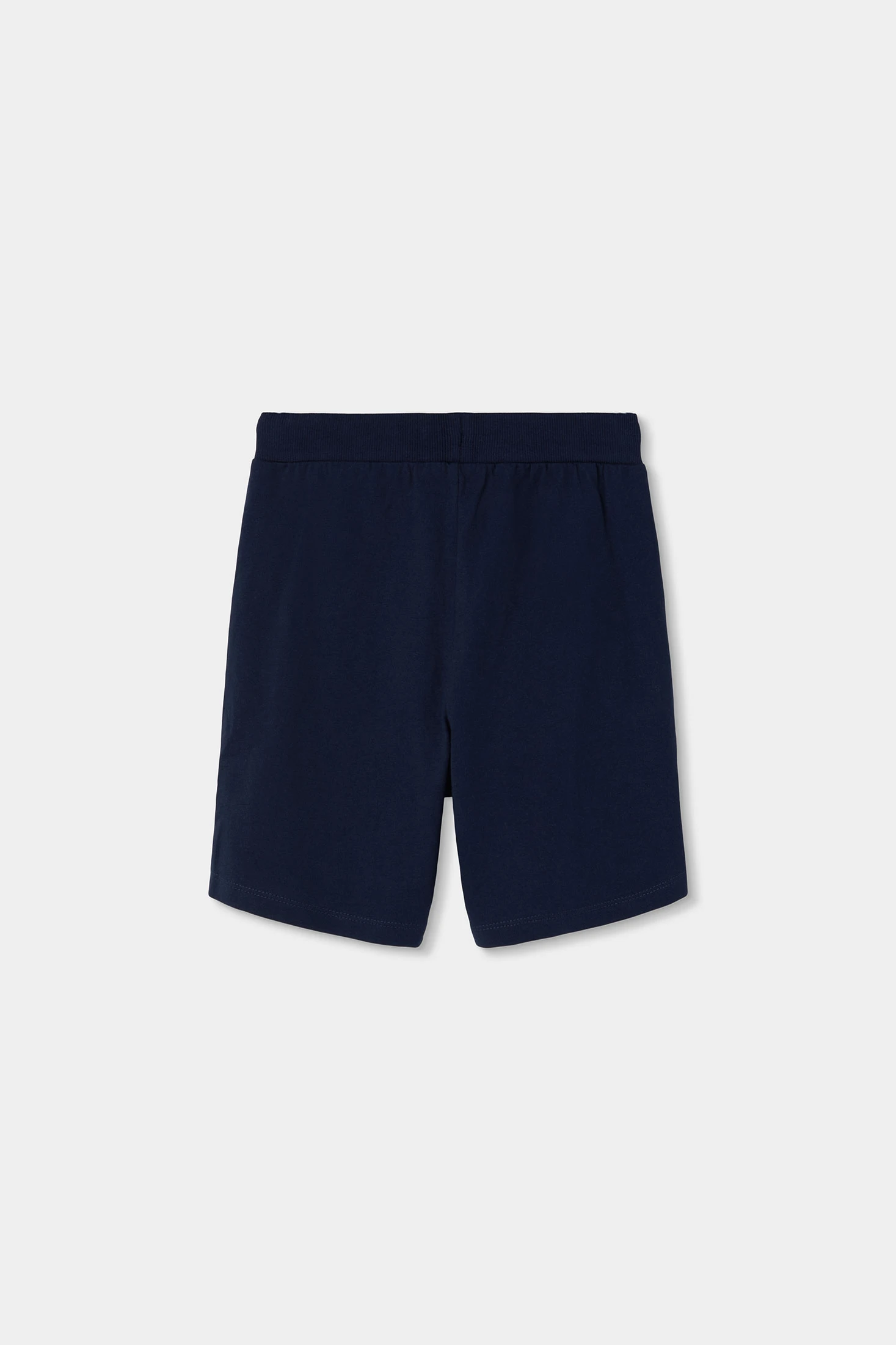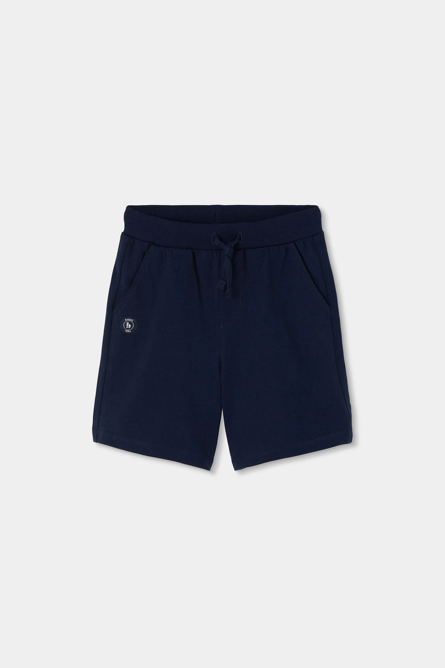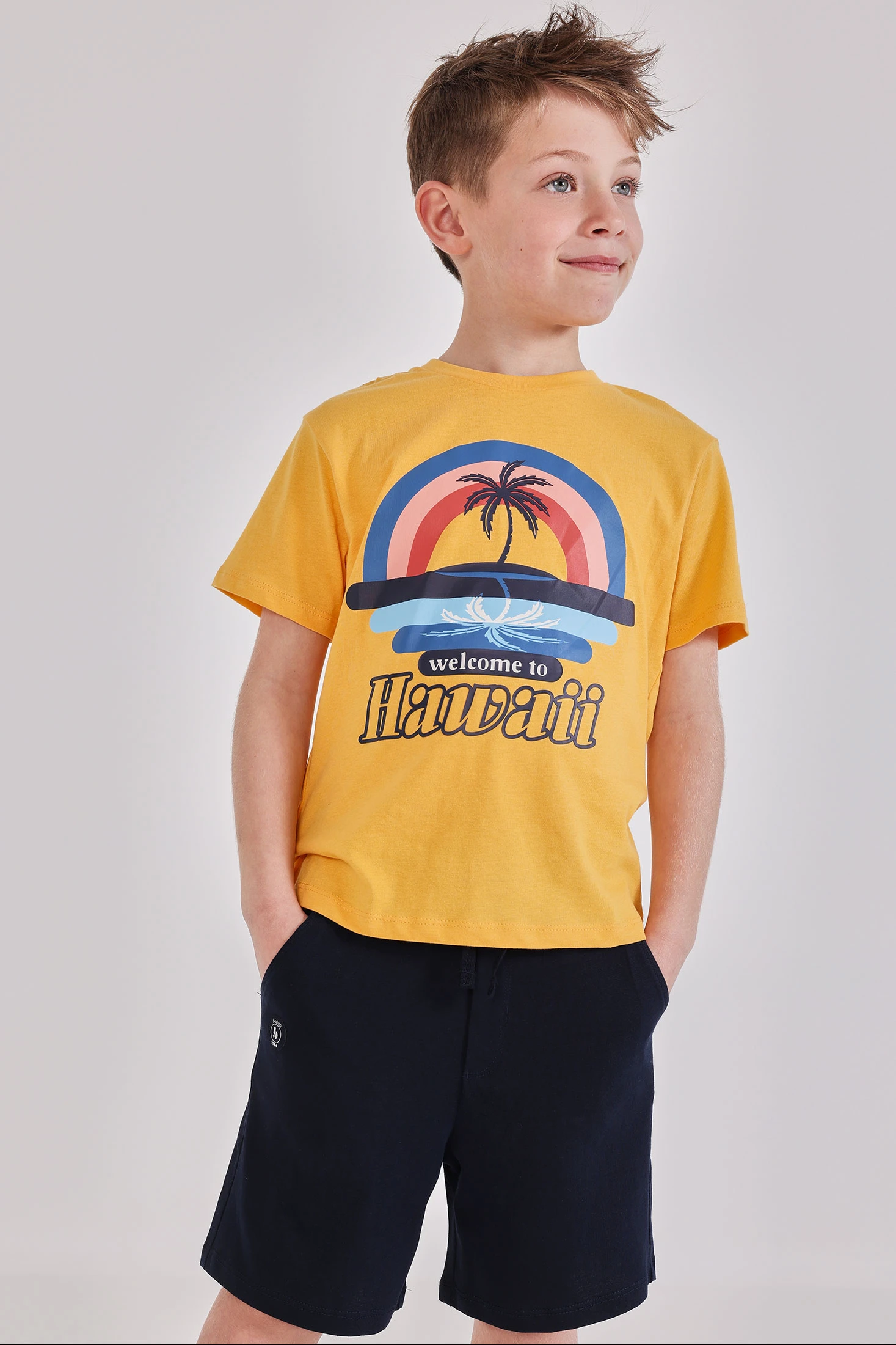 Conjunto de algodão para menino, perfeito para o verão. A camisola é de cor amarela com um estampado tropical em várias cores, proporcionando um ar fresco e divertido. Os calções em azul marinho com cintura elástica com cordão ajustável complementam o look. Ideal para crianças de 12 meses a 10 anos, este conjunto é fácil de combinar e adequado para todo o tipo de atividades ao ar livre, oferecendo conforto e estilo casual.