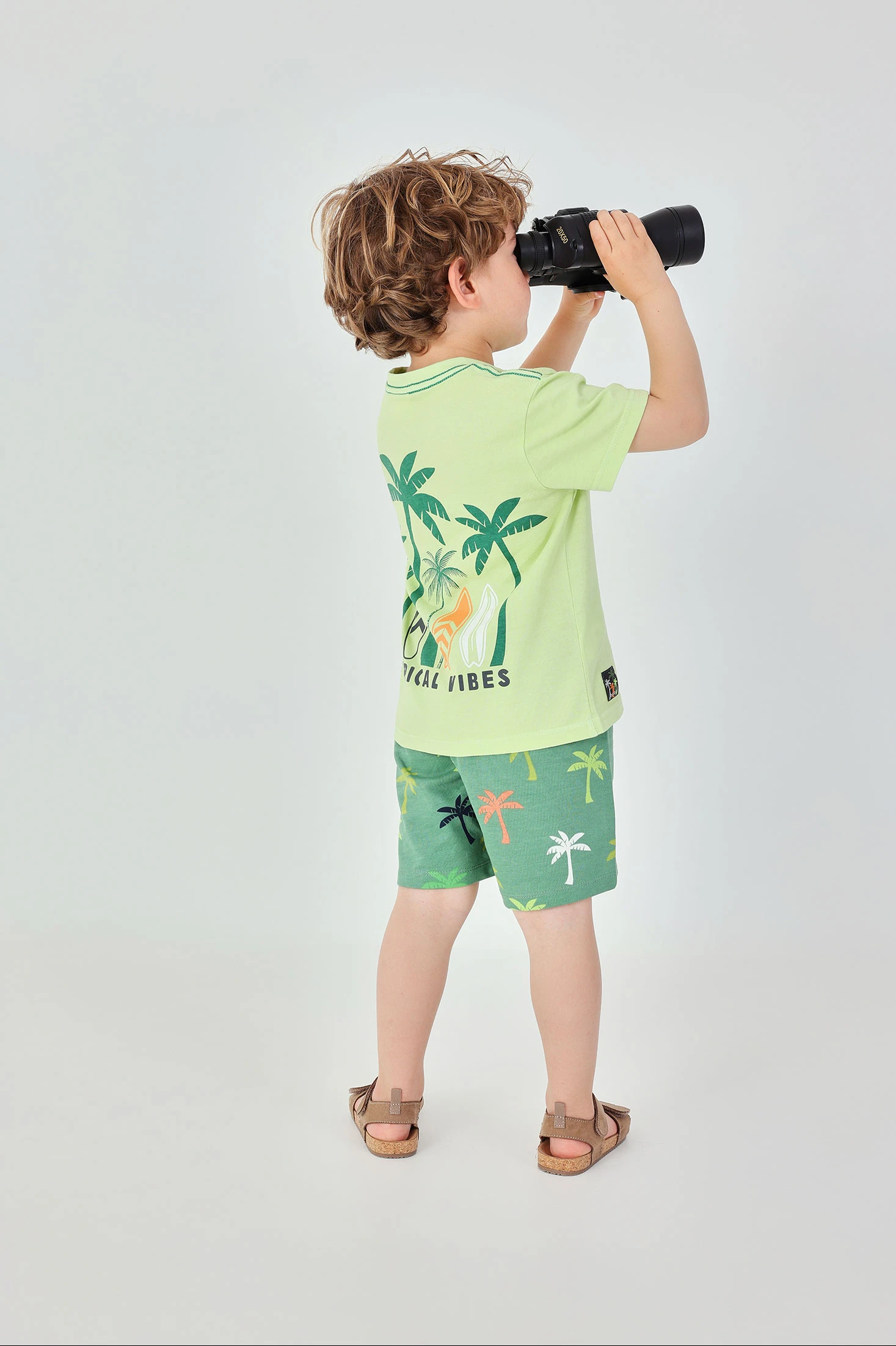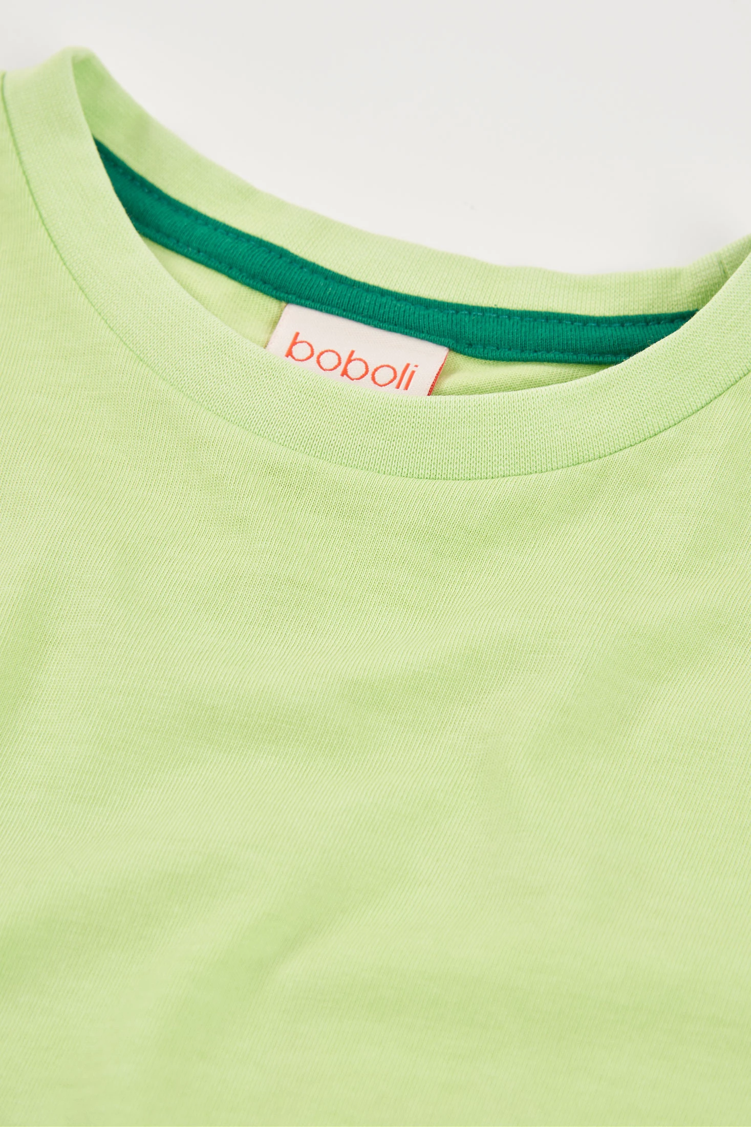 Camiseta de algodão para menino, ideal para as estações quentes. De cor verde claro, apresenta um design simples e um bolso decorativo com palmeiras e a inscrição "Palm Tree". O seu tecido de algodão garante frescura e conforto, perfeito para o uso diário. Disponível em tamanhos desde 12 meses até 10 anos, oferece flexibilidade para se adaptar ao crescimento do seu pequeno. O corte clássico e a gola redonda tornam-na fácil de combinar com diferentes estilos de roupa, acrescentando um toque divertido ao seu visual diário.