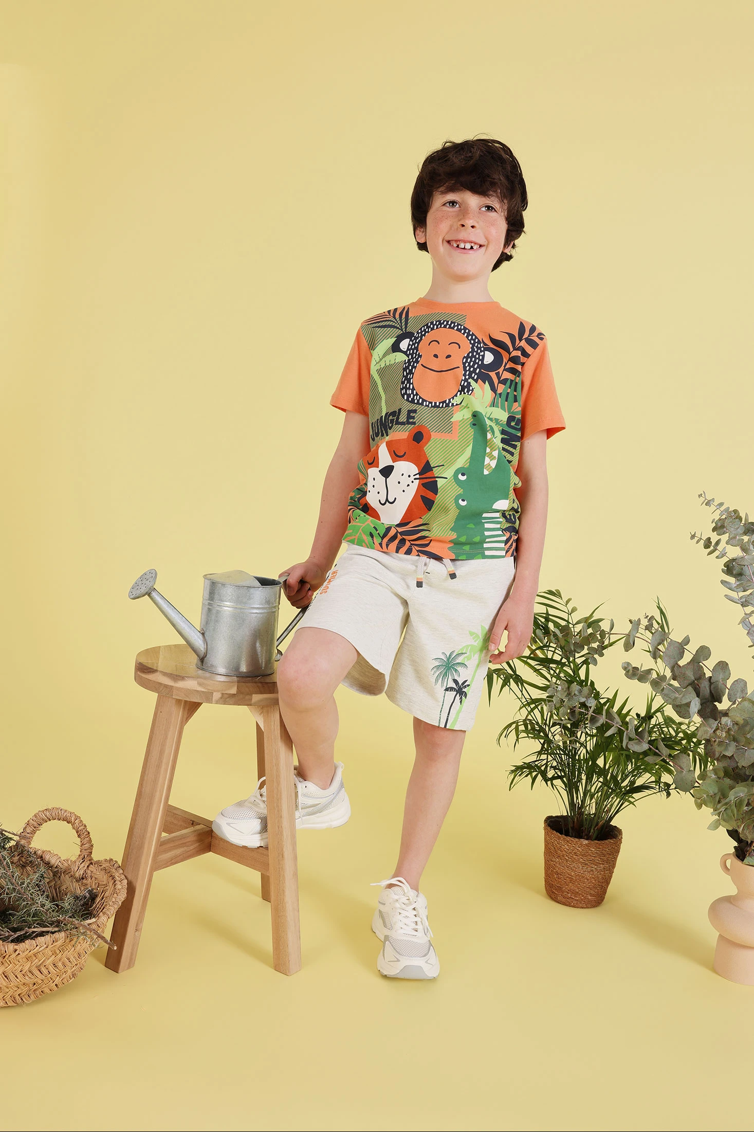 Calções de pelfa em cru vigoré, oferecem conforto e um estilo fresco. O seu design apresenta palmeiras e letras que evocam um ambiente tropical. Confeccionados em pelfa suave, são perfeitos para dias quentes. A cintura elástica com cordão ajustável garante um ajuste confortável. Disponíveis em tamanhos de 12 meses a 10 anos. A cor cru torna-os fáceis de combinar com t-shirts casuais e sweatshirts leves, criando um look descontraído para o verão.