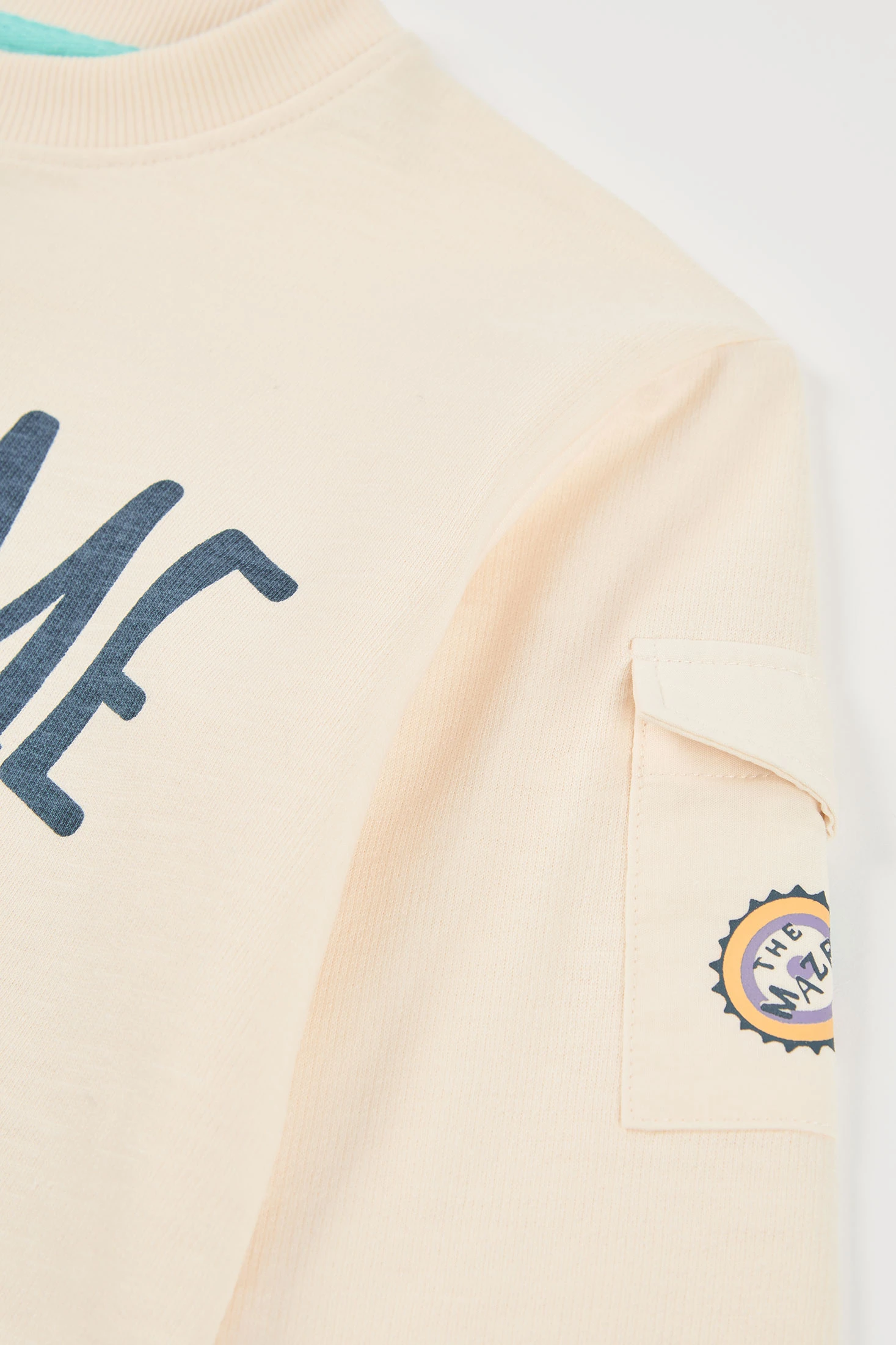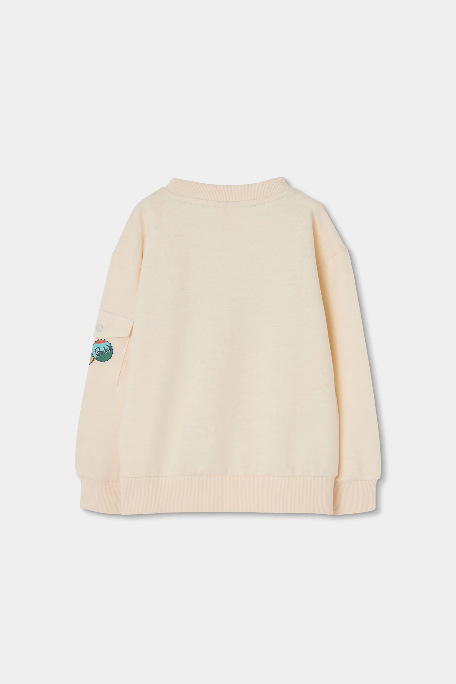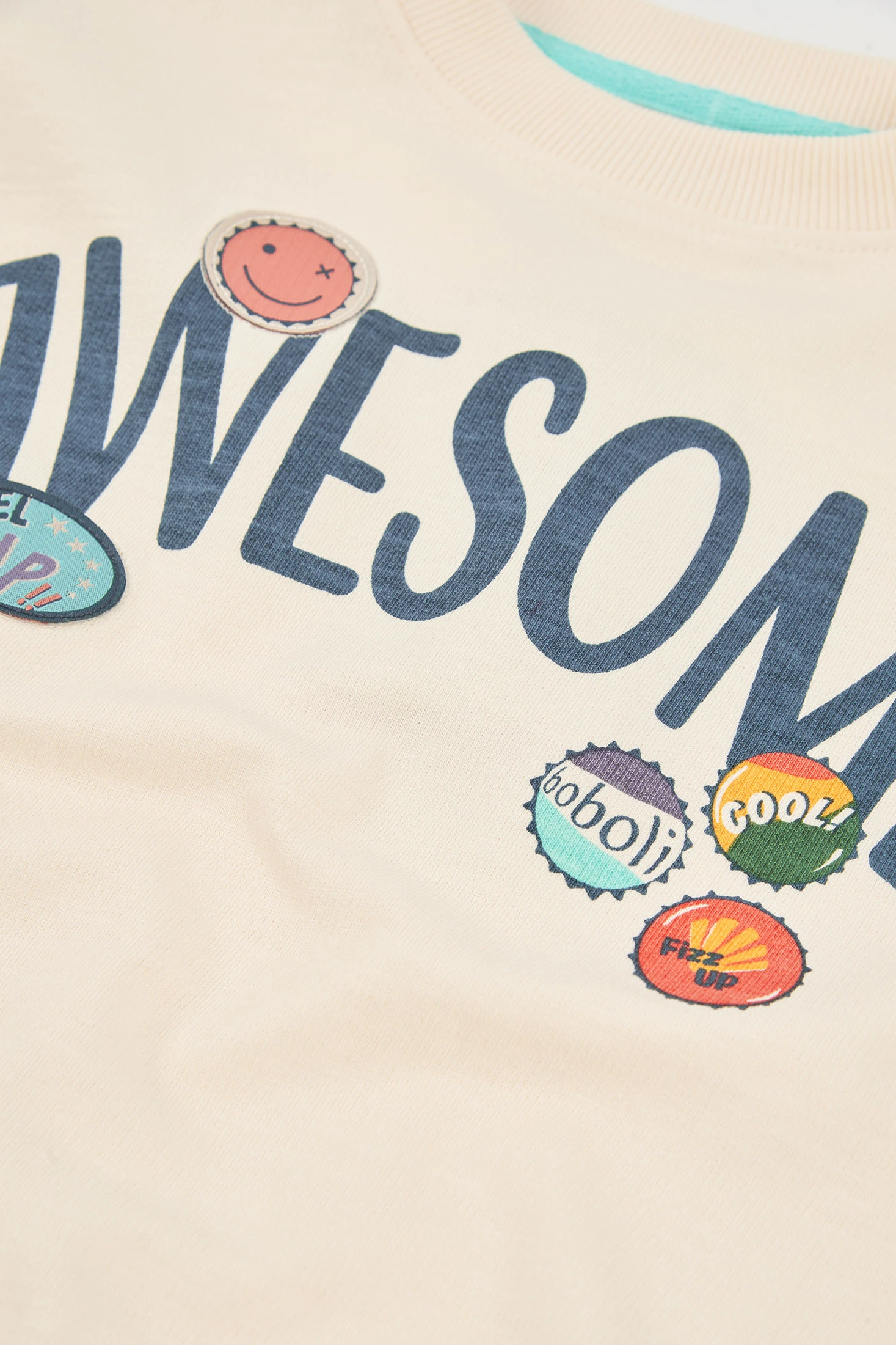 Sweatshirt para crianças ideal para os dias mais frescos de verão e primavera. Confeccionada em tecido de malha suave, oferece conforto e calor. De cor bege claro, apresenta uma estampa divertida com a palavra "AWESOME" e pequenos gráficos coloridos. Ideal para idades de 1 a 10 anos. O seu decote redondo e mangas compridas tornam-na perfeita para combinar com jeans ou calças casuais, adicionando um toque de estilo moderno e alegre.