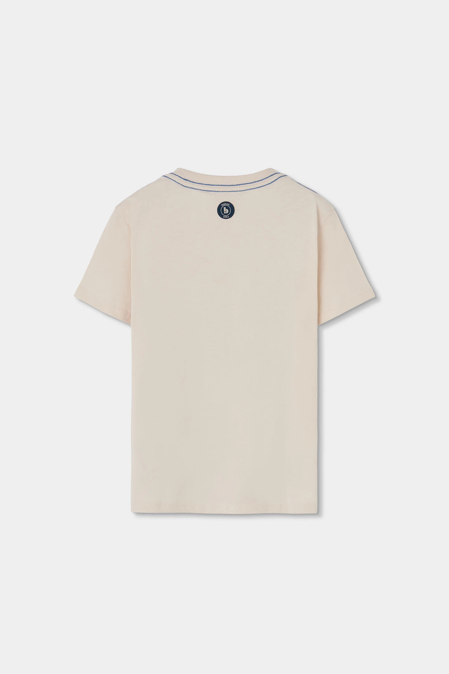 Camisola de algodão cru para menino, ideal para o verão, apresenta um design alegre com um grande desenho frontal de um leopardo com óculos e uma frase inspiradora. O seu tecido de algodão proporciona conforto e respirabilidade, perfeito para o uso diário. Disponível em tamanhos desde 12 meses até 10 anos, adapta-se ao crescimento do seu pequeno. A sua cor neutra permite combiná-la facilmente com calções ou jeans, fazendo desta camisola uma opção versátil e divertida para as aventuras diárias.