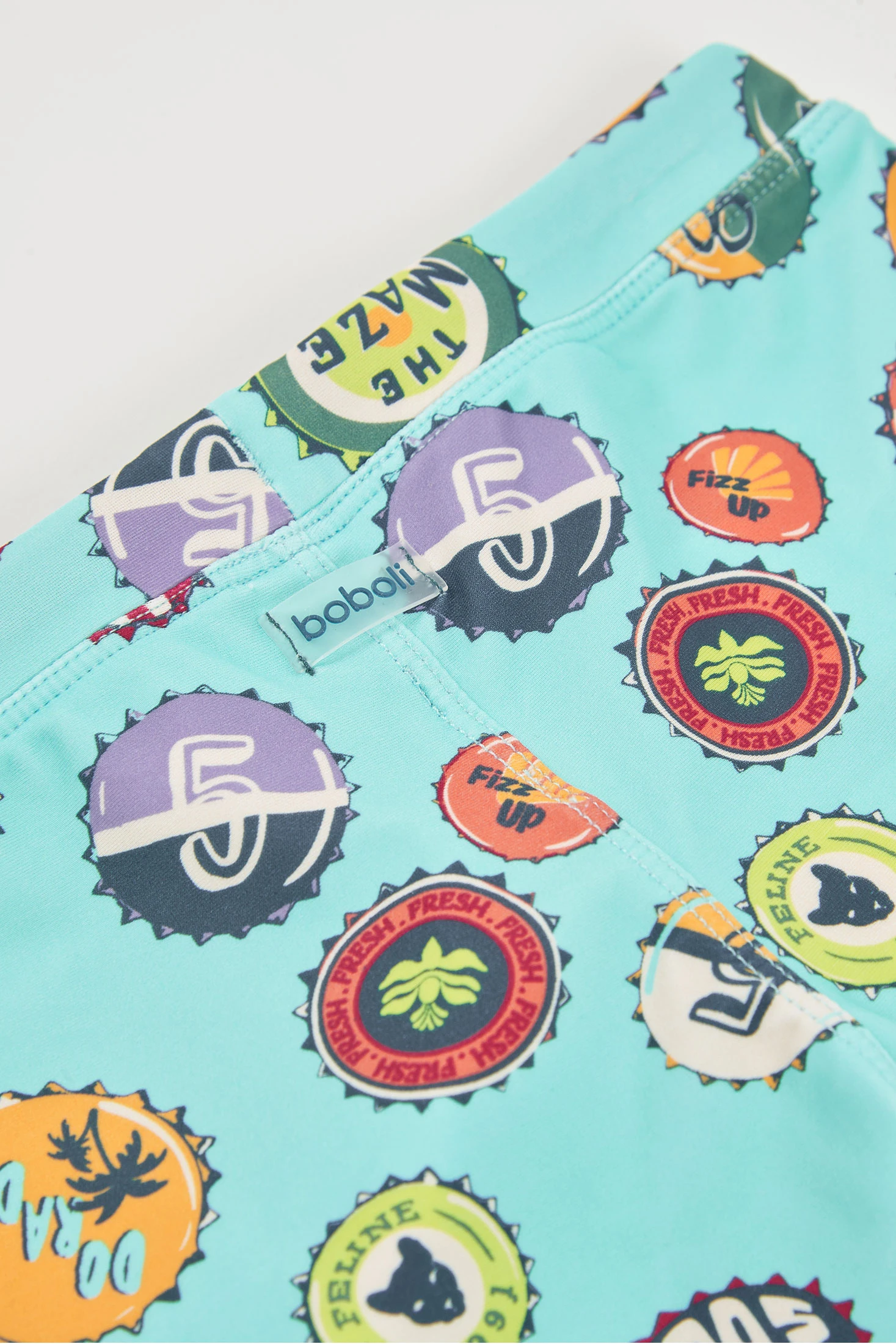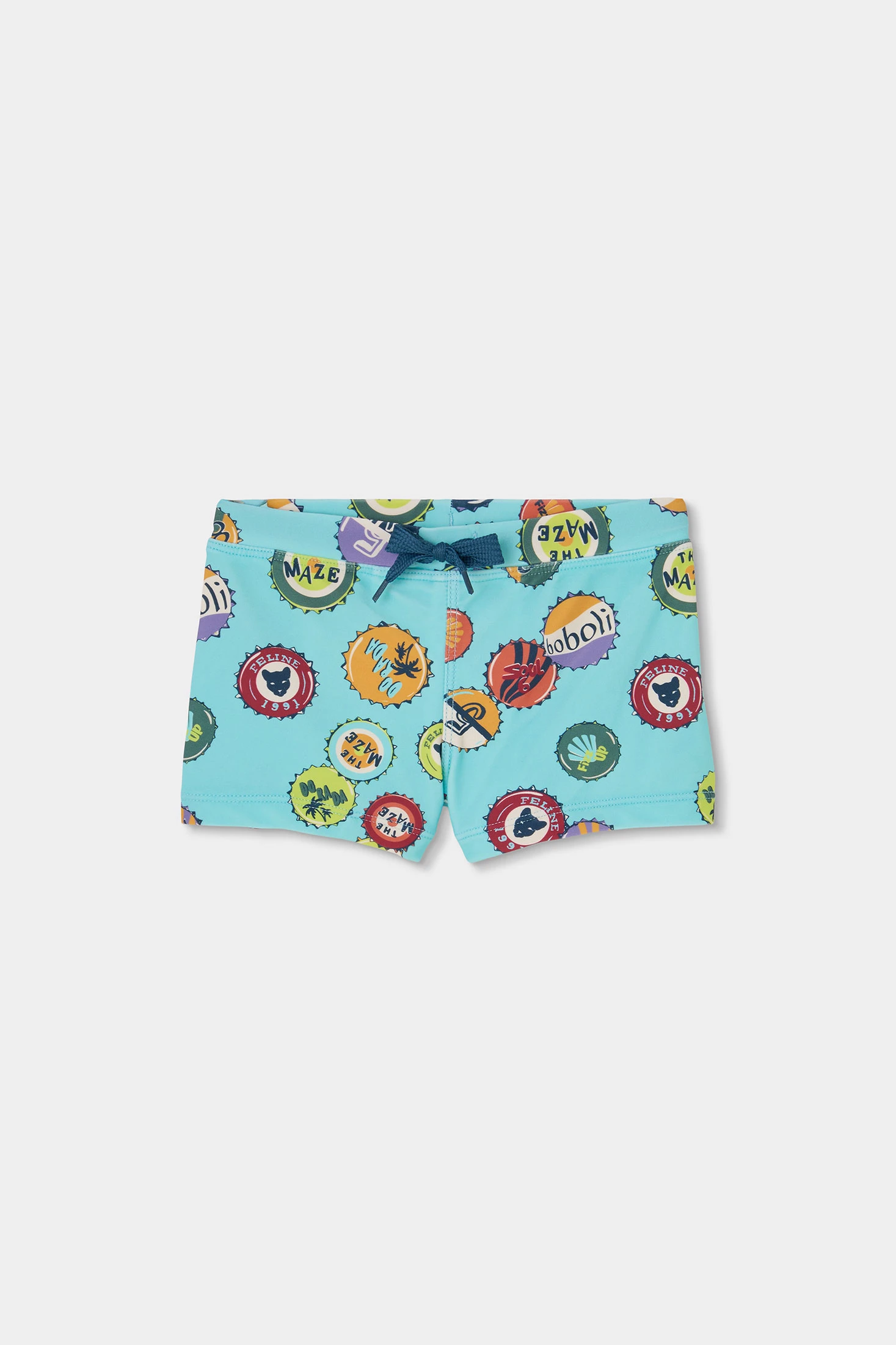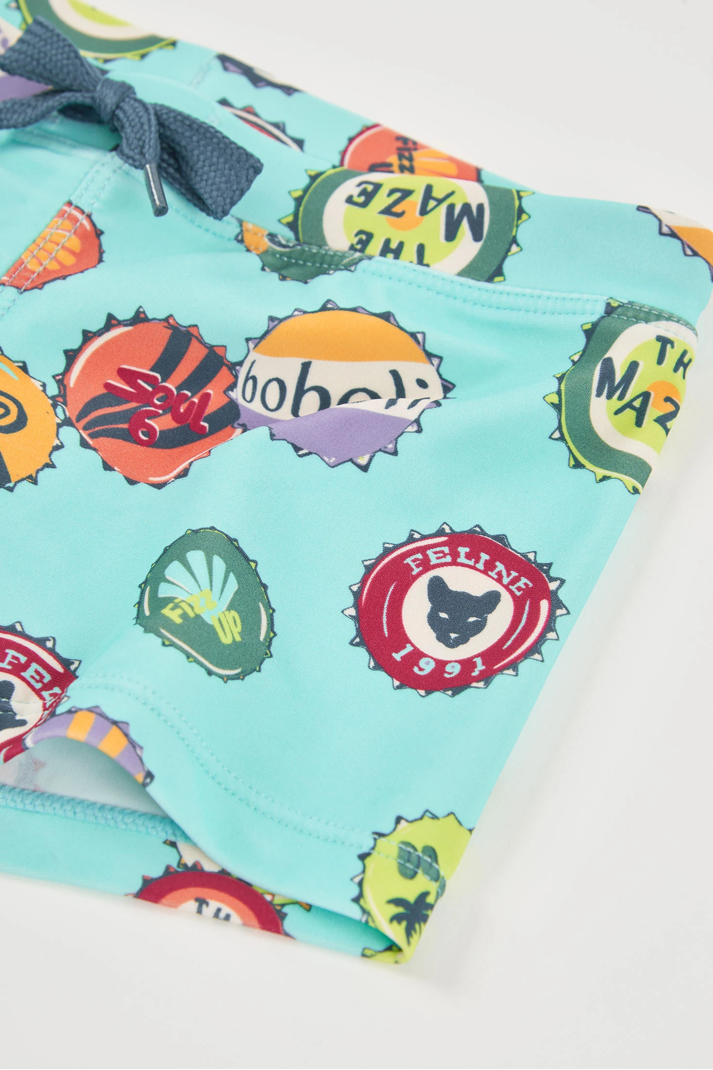 Fato de banho para criança com um design divertido e estampados coloridos de tampas de refrigerante. Fabricado em material elástico, oferece conforto e liberdade de movimento, ideal para atividades aquáticas. De cor azul-claro, perfeito para o verão. Disponível em tamanhos desde 12 meses até 10 anos, adaptando-se a diferentes idades. A sua cintura ajustável assegura um bom ajuste para a criança durante as suas aventuras na água. Peça com proteção solar UPF50.