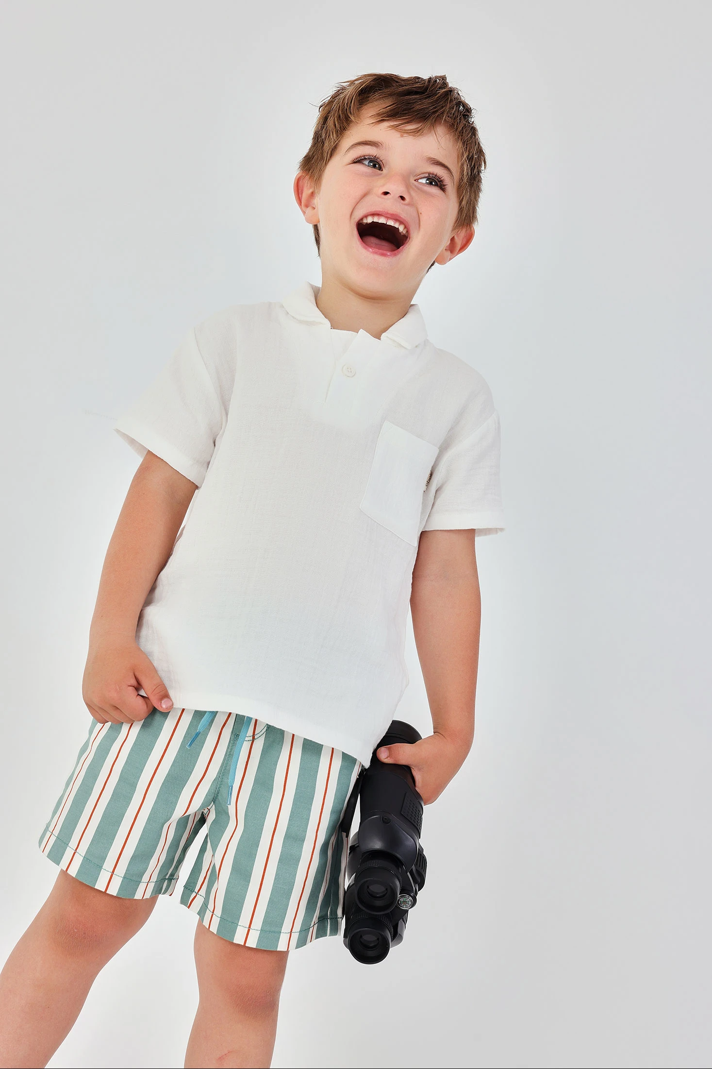 Bermuda de riscas para menino ideal para climas quentes. Com um design de riscas verticais em tons de verde, branco e vermelho, oferece um estilo fresco e moderno. Feita de um material leve que assegura conforto, é perfeita para o dia-a-dia. Dispõe de uma cintura elástica e cordão ajustável para um melhor ajuste. Disponível em tamanhos para idades desde 12 meses até 10 anos. Um par versátil e fácil de combinar com camisetas lisas ou estampadas, fazendo com que o seu menino tenha estilo e conforto.