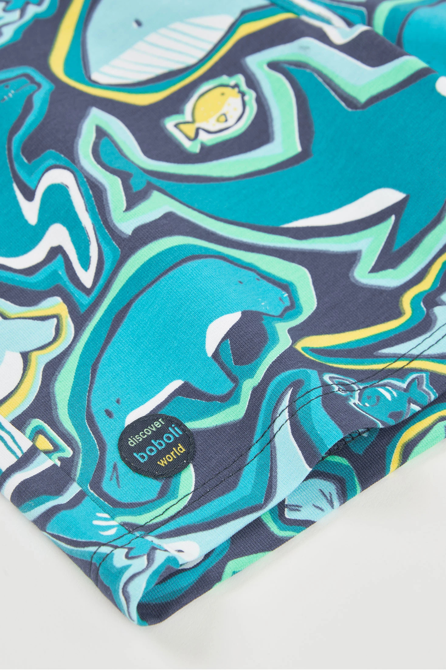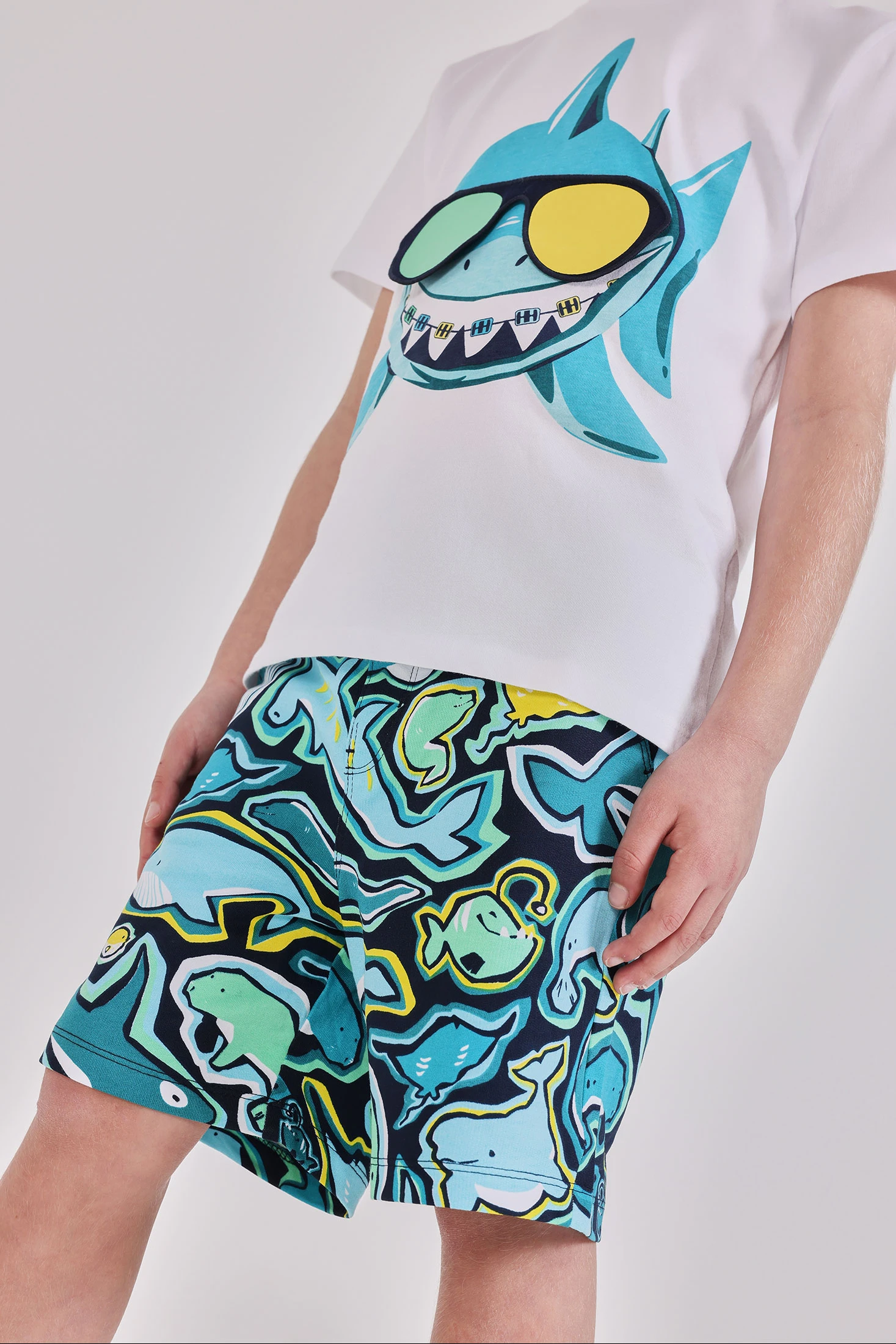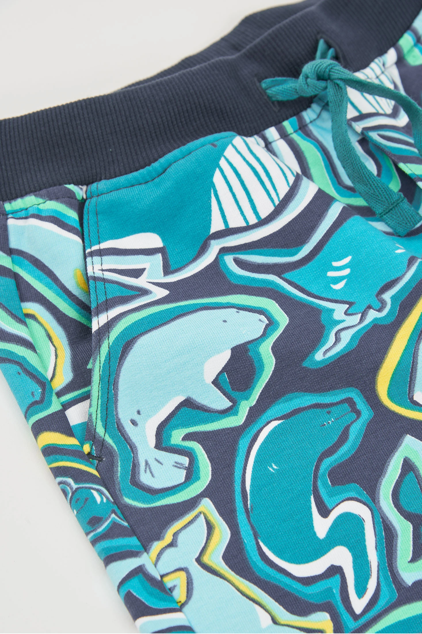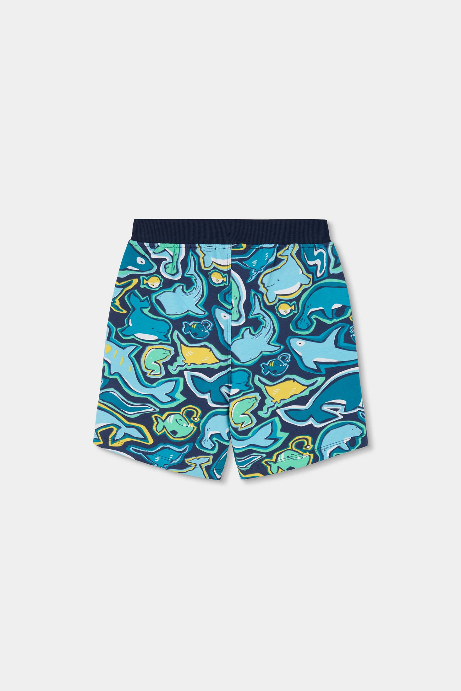 Bermuda de felpa com cintura canelada em contraste de cor marinho, com elástico interior e fita para ajustar, adaptando-se aos diferentes tamanhos. O design apresenta desenhos de animais marinhos, proporcionando um toque divertido e colorido. Disponível em tamanhos de 12 meses a 10 anos.