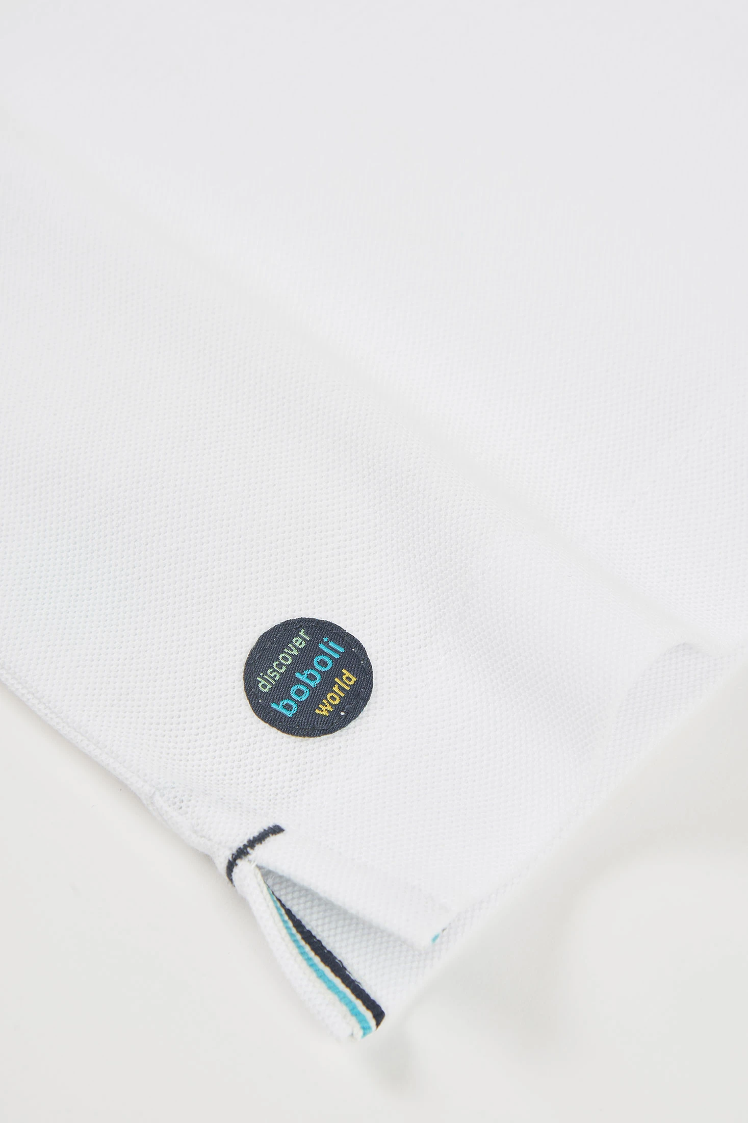 Polo de algodão branco para criança, fresco e versátil, apresenta um design de riscas horizontais em tons de azul e amarelo. Inclui uma gola tipo polo com debrum de riscas coloridas e uma ilustração de um animal marinho. Ideal para idades desde 12 meses até 10 anos. O seu tecido de algodão garante conforto para o uso diário. Os detalhes coloridos tornam-na uma peça divertida e fácil de combinar. Perfeita para um estilo casual com calções ou jeans.