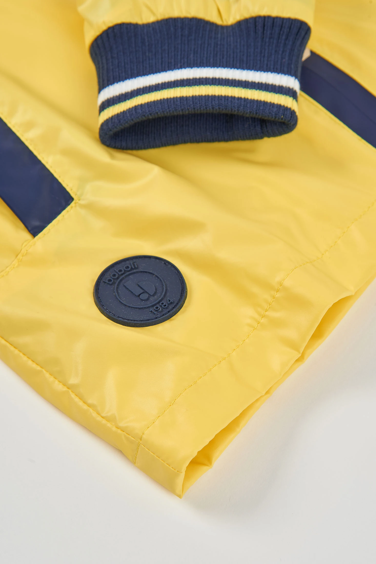 Parka amarela para menino, fabricada com tecido técnico, perfeita para a meia-estação. Oferece proteção e conforto, ideal para atividades ao ar livre. Concebida para idades desde 12 meses até 10 anos, esta peça destaca-se pelo seu capuz, fecho de correr e detalhes em azul-marinho. Mensagem no fecho de correr adiciona um toque aventureiro. O seu estilo versátil permite combiná-la facilmente no dia a dia.