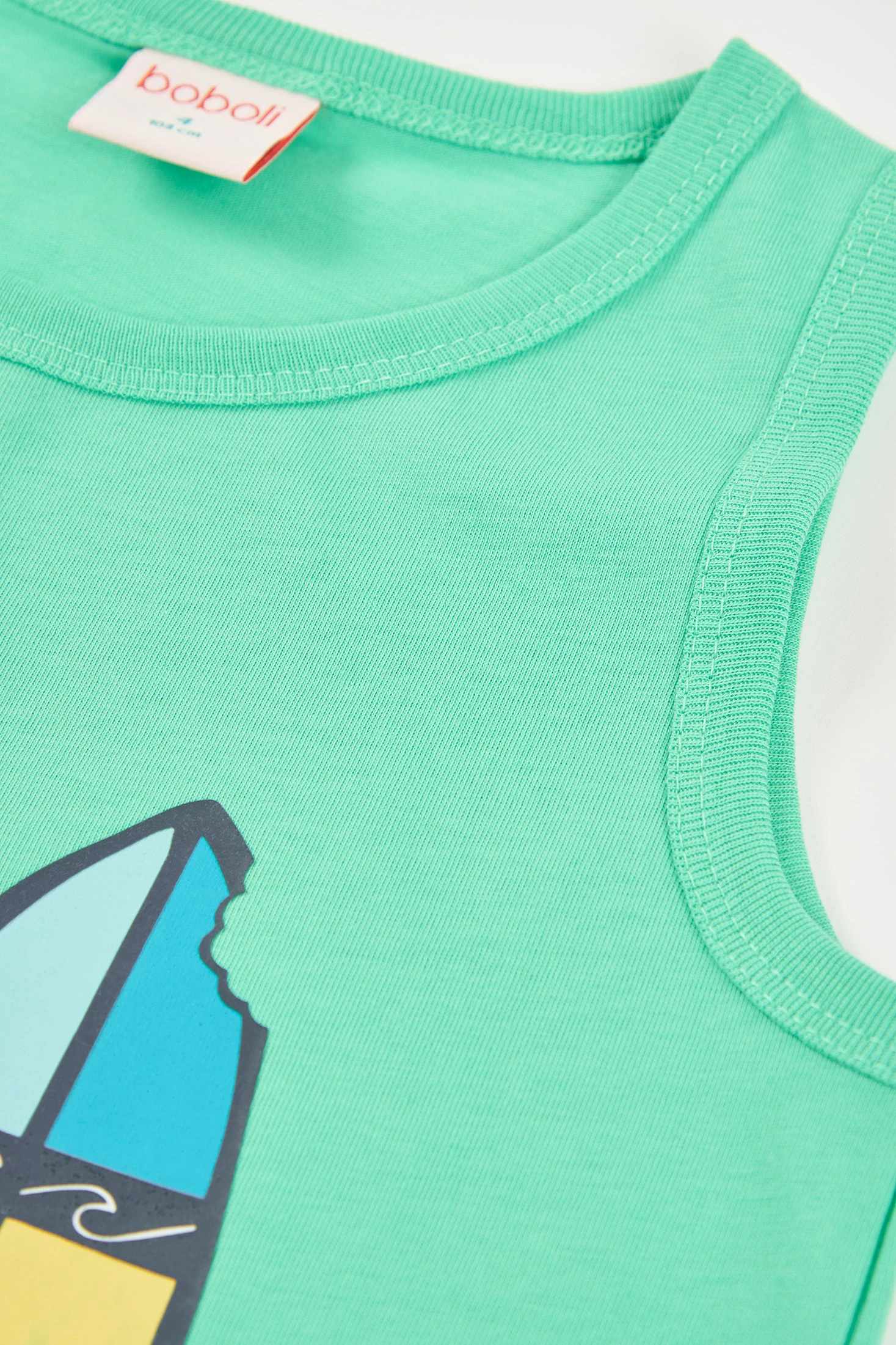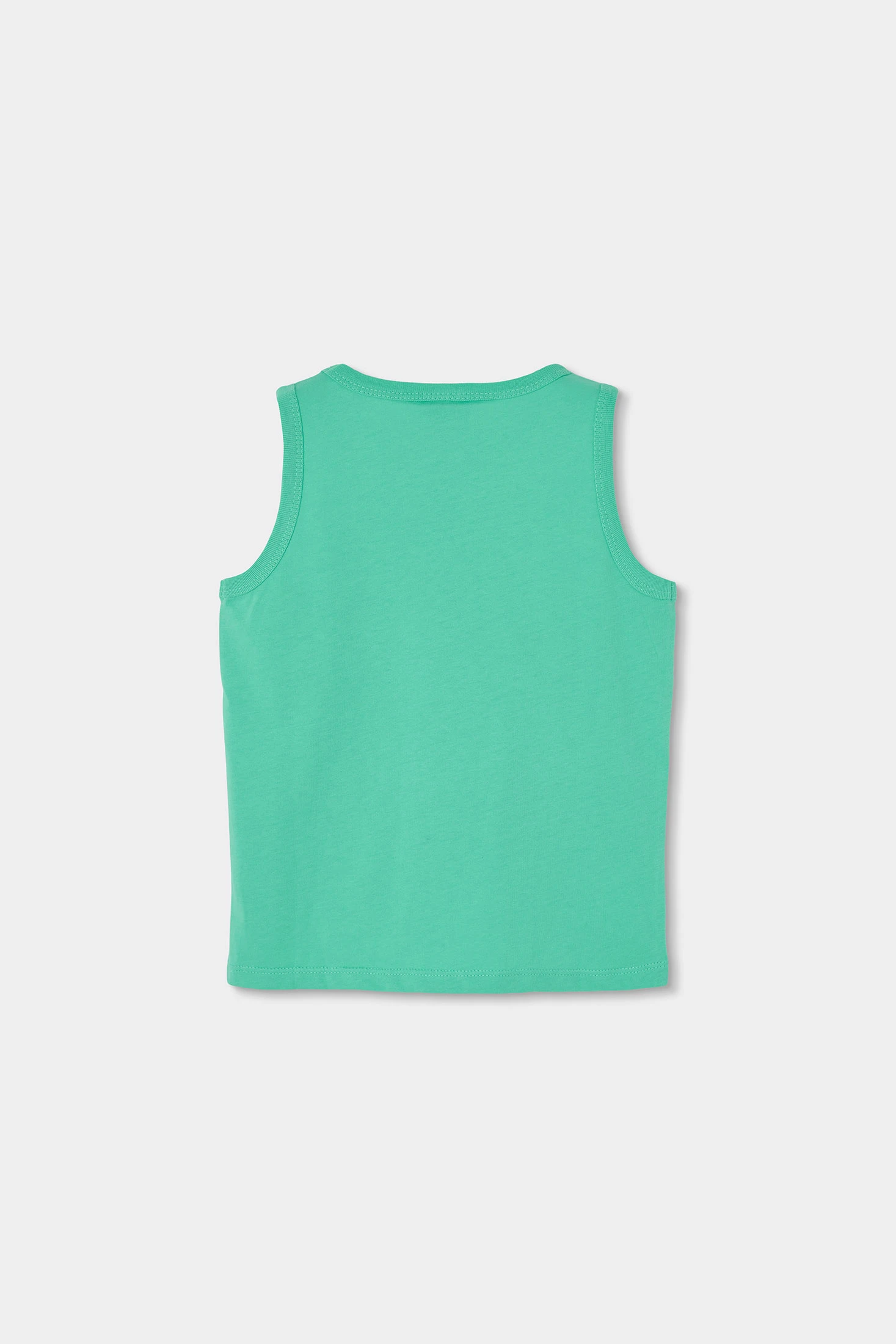Camiseta sem mangas de malha verde ideal para crianças em épocas quentes. O seu design divertido inclui lettering com motivos marinhos e pequenos detalhes de animais, conferindo um toque fresco e de verão. Fabricada em algodão, oferece conforto no uso diário. Disponível em tamanhos para idades de 12 meses até 10 anos. Perfeita para combinar com calções ou jeans, esta camiseta acrescenta estilo e cor a qualquer conjunto, sendo versátil e confortável para qualquer ocasião casual.
