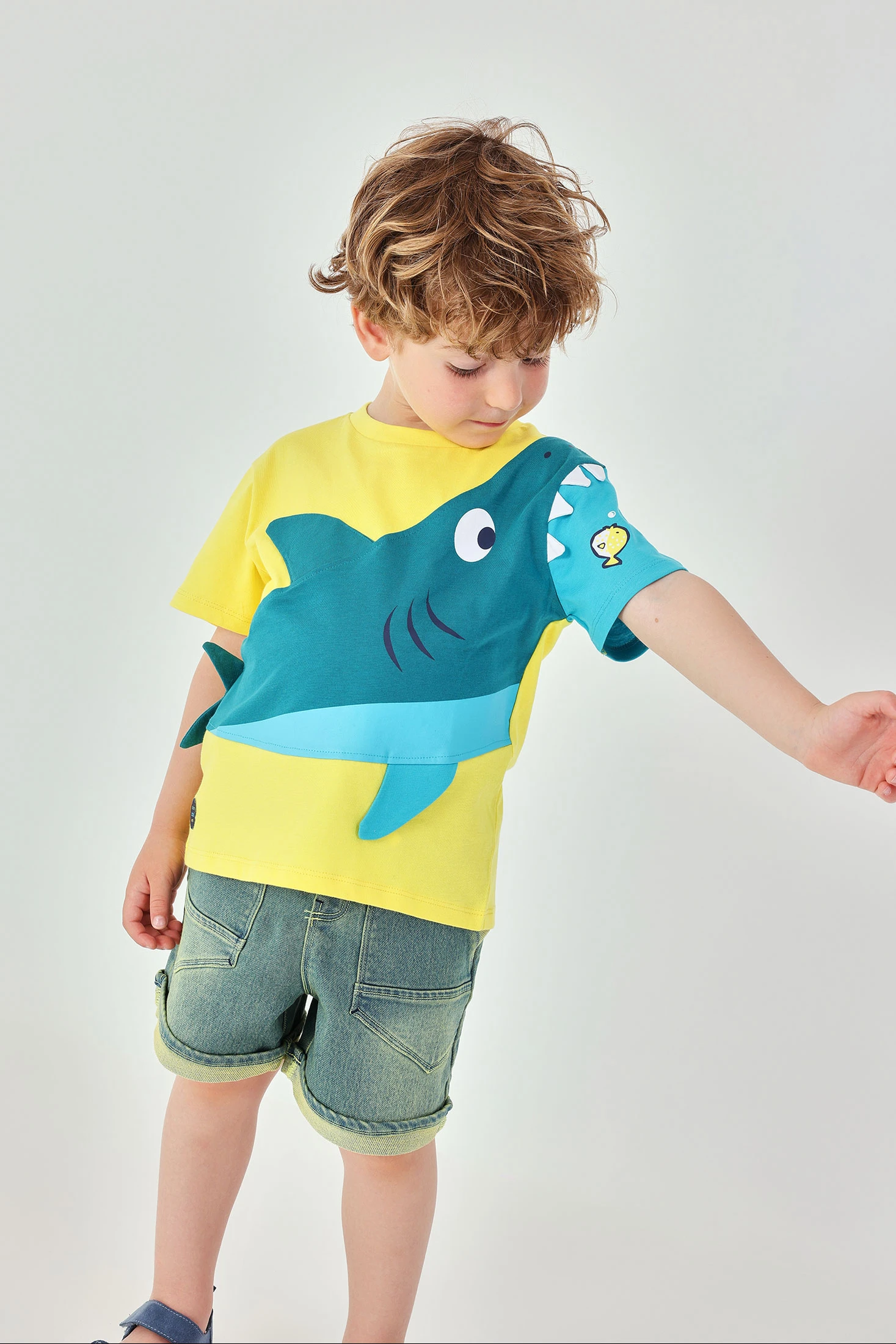 Camiseta de malha de algodão para criança com vibrante cor amarela, ideal para adicionar alegria ao guarda-roupa. Com um chamativo design de animal aquático, é perfeita para pequenos aventureiros. O decote redondo proporciona conforto e as mangas curtas facilitam a mobilidade. Disponível em tamanhos desde 12 meses até 10 anos, adapta-se ao crescimento da criança. O seu tecido suave é ideal para o uso diário, trazendo estilo e diversão a qualquer conjunto.