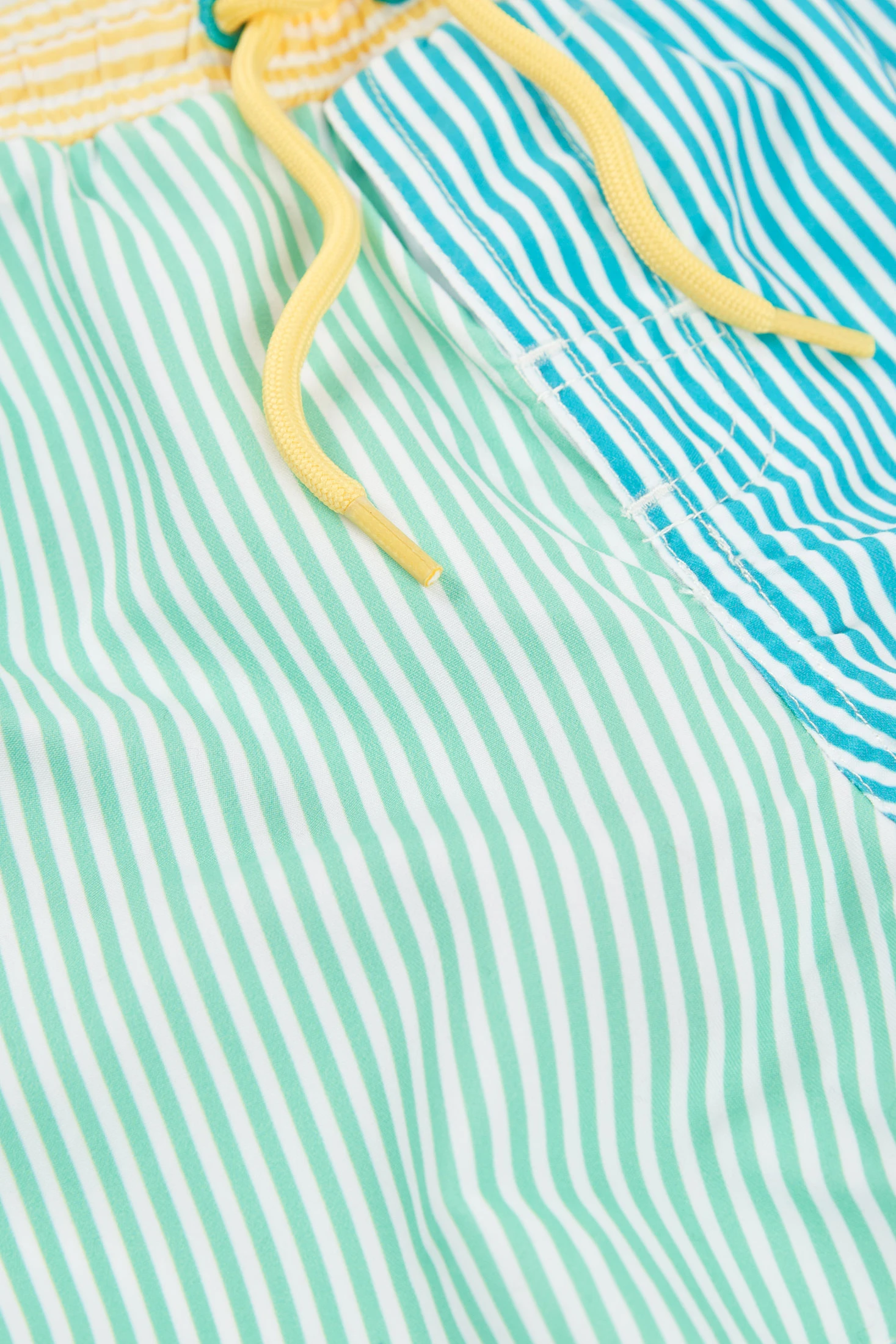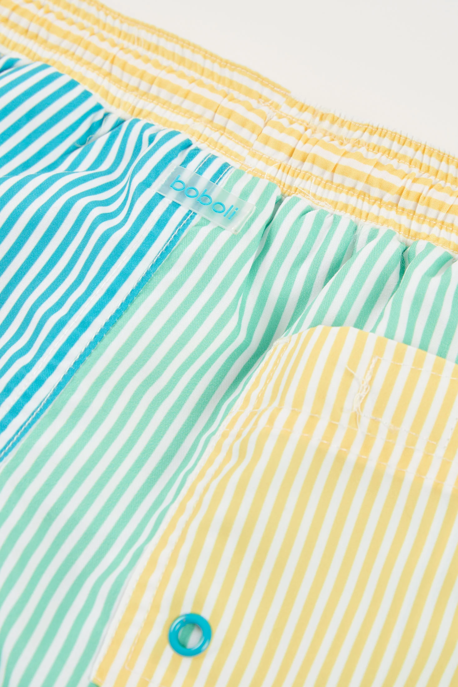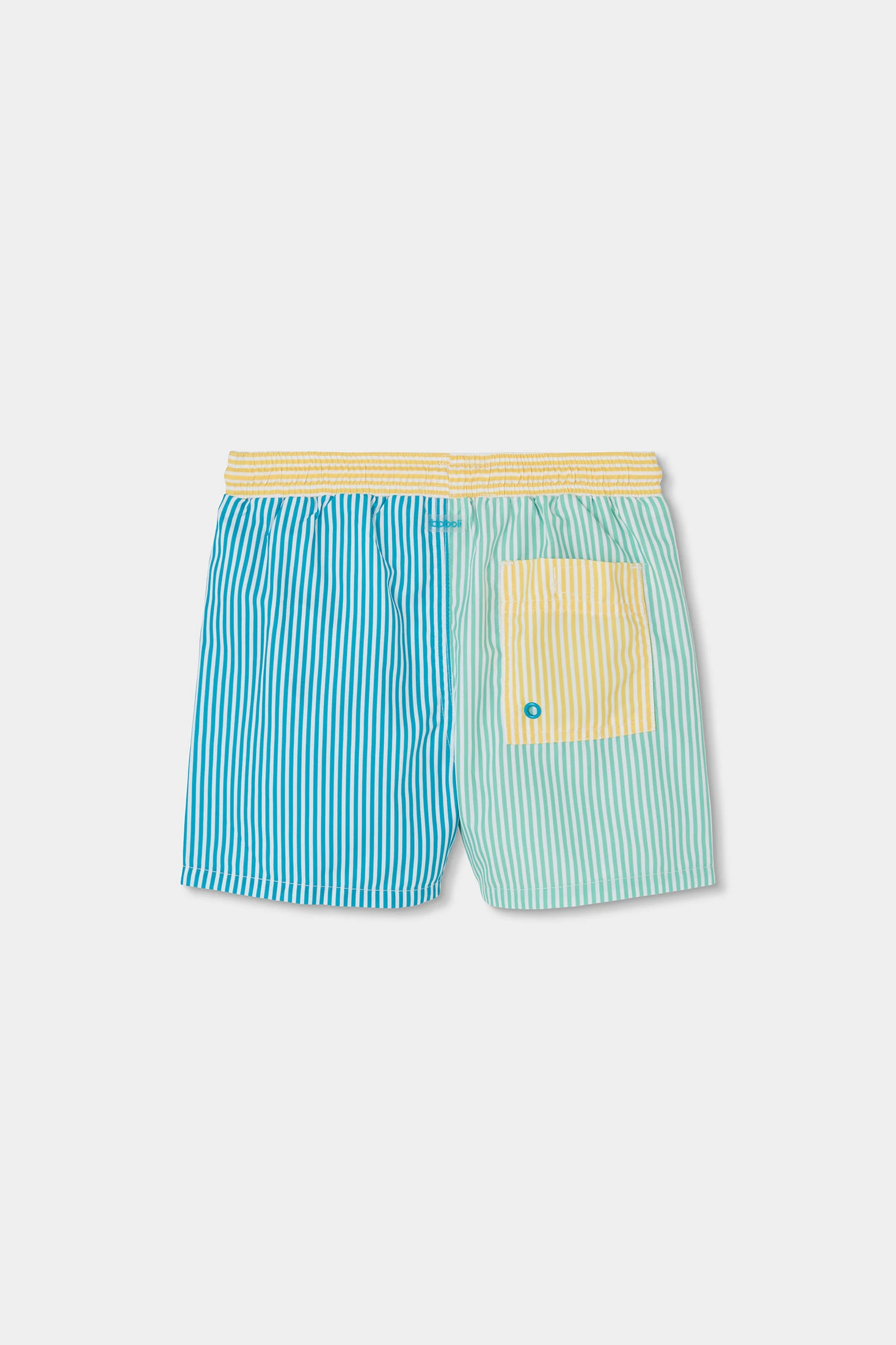 Boxe de tecido listado para os mais pequenos, confecionado com material 100% reciclado. Apresenta um design às riscas em tons azul, amarelo e verde, com um vibrante cordão amarelo que acrescenta um toque divertido. O seu ajuste elástico facilita o movimento, tornando-o ideal para as atividades diárias. Disponível em tamanhos desde os 12 meses até aos 10 anos, é uma opção versátil e sustentável que se combina facilmente com camisetas de cores sólidas para um look fresco e moderno.