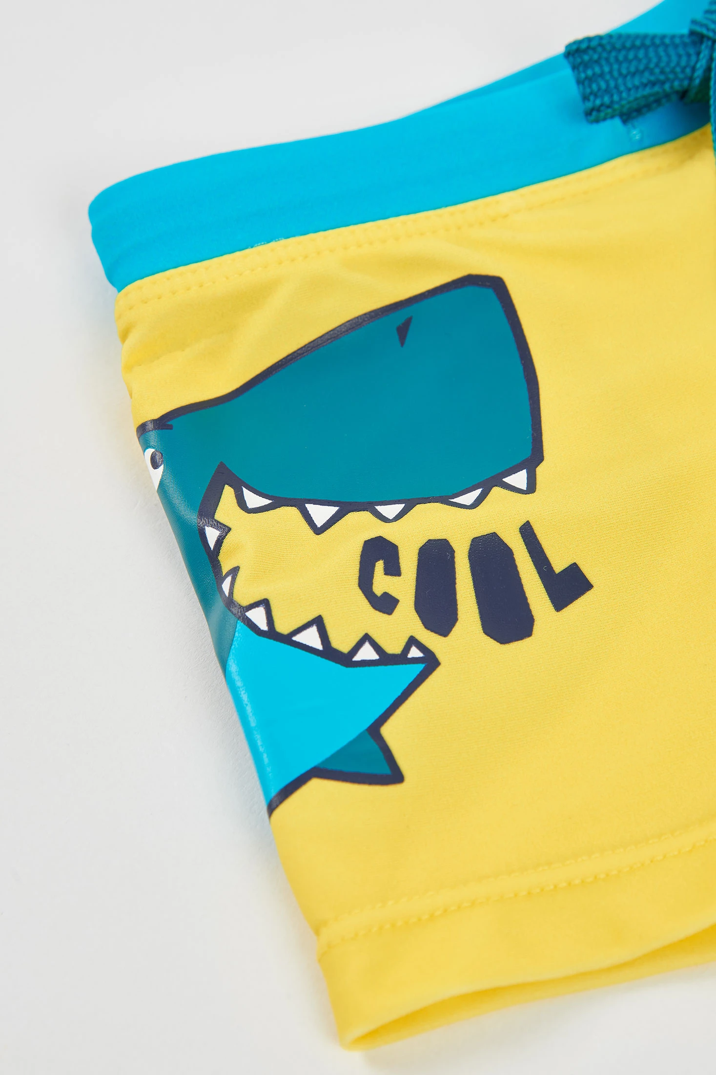 Fato de banho estampado amarelo, ideal para os mais pequenos. Apresenta um divertido design de animais marinhos, incluindo um tubarão e peixes, que acrescentam um toque brincalhão. Confeccionado com materiais resistentes à água, garante durabilidade e conforto durante o banho. Os tamanhos vão dos 12 meses aos 10 anos, adaptando-se a diferentes idades. A sua cor vibrante torna-o perfeito para se destacar na praia ou na piscina. A cintura azul contrastante, elástica e com cordão ajustável, proporciona um ajuste seguro e confortável, ideal para as aventuras aquáticas das crianças. Produto com proteção solar UPF 50+