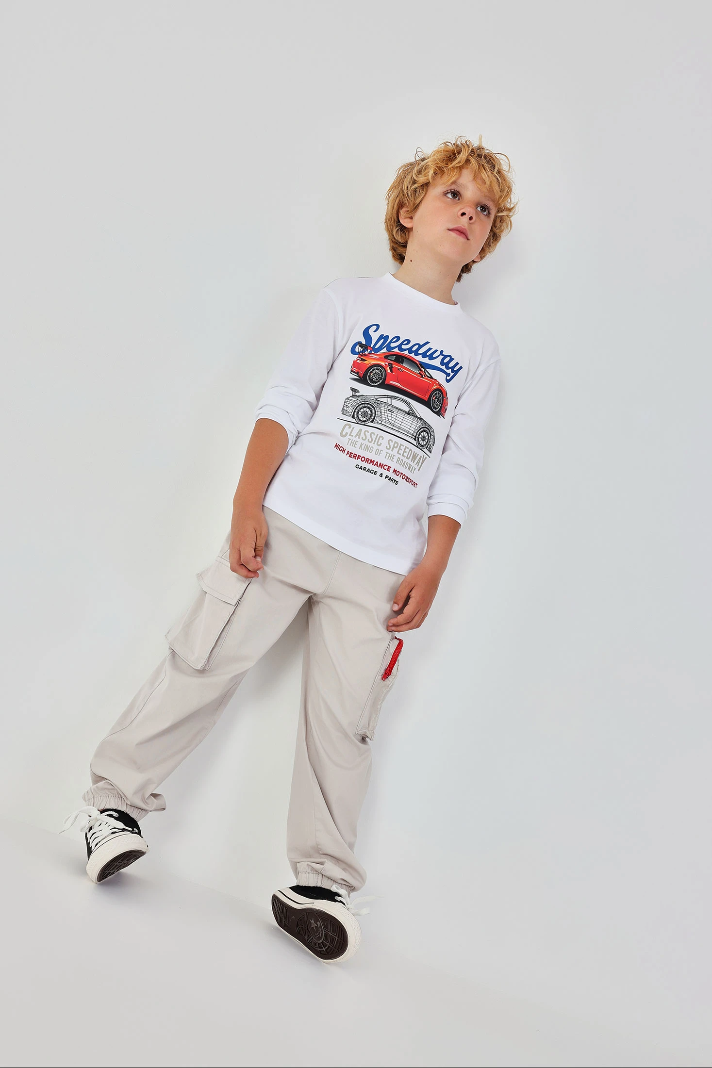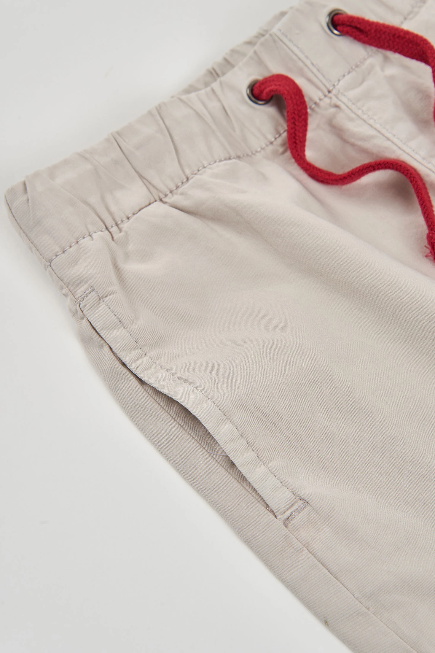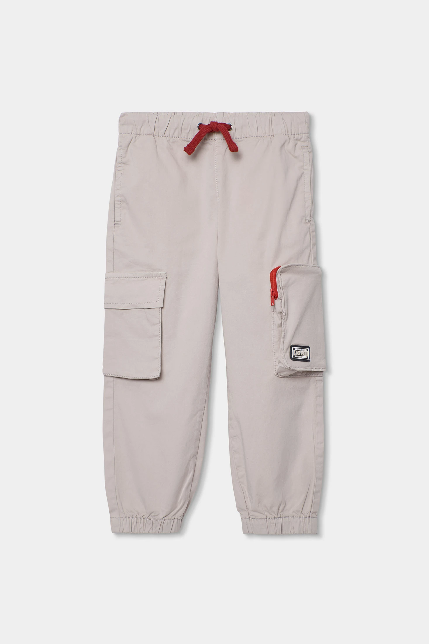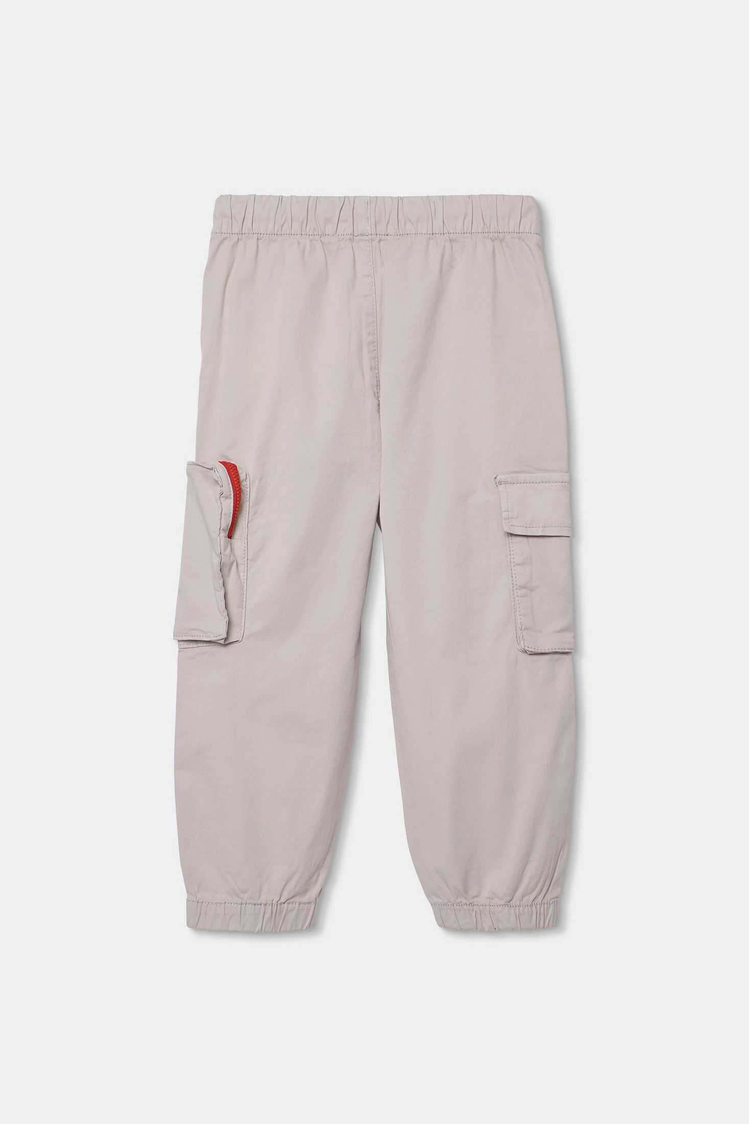 Calças elásticas para criança confeccionadas em suave algodão bege. Perfeitas para o dia a dia, combinam conforto e estilo. Apresentam um design cargo com práticos bolsos laterais e um fecho de cordão vermelho que adiciona um toque de cor. Os tamanhos disponíveis são dos 2 aos 14 anos. Ideais para combinar com camisetas ou sweatshirts, estas calças são versáteis e adequadas para diversas ocasiões. O seu tecido elástico permite liberdade de movimento, transformando-a numa peça funcional e moderna para os mais pequenos.