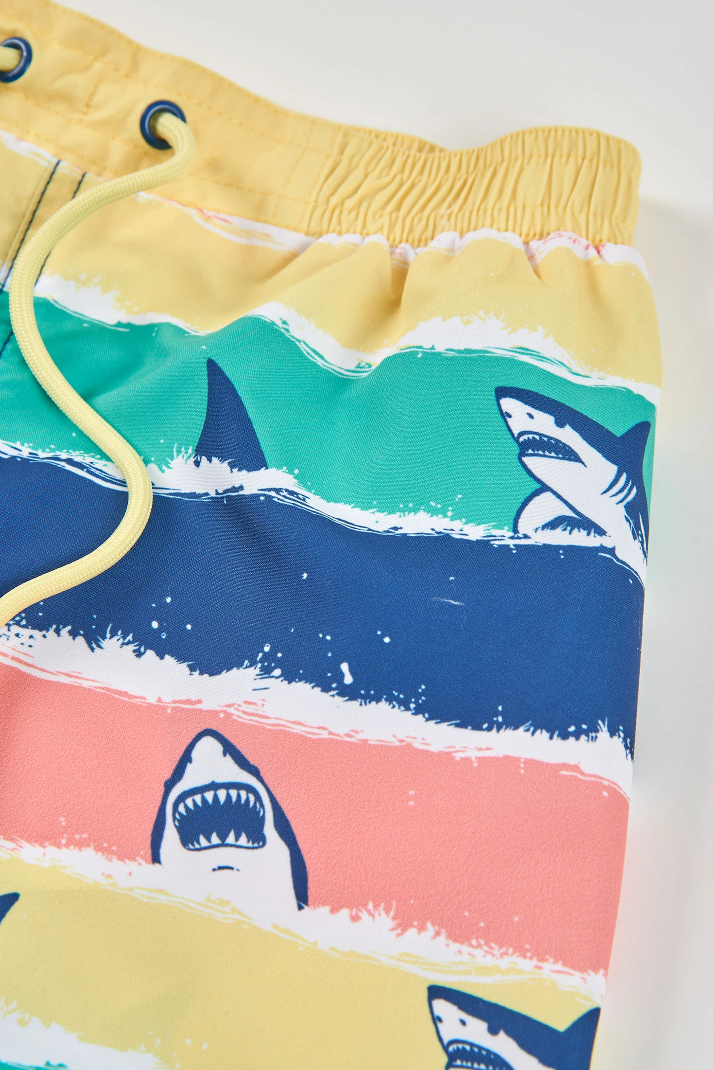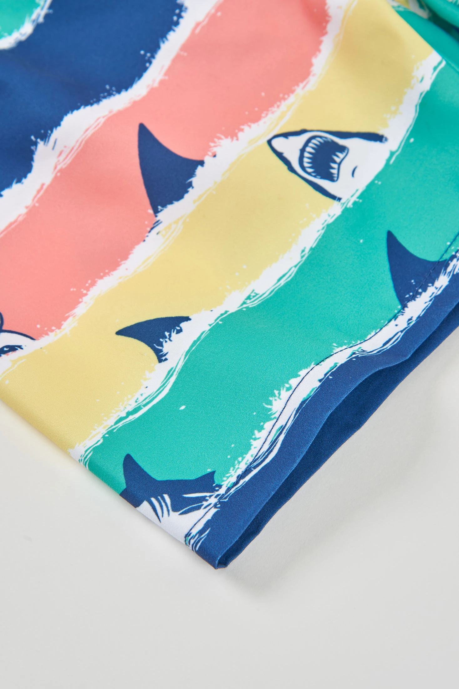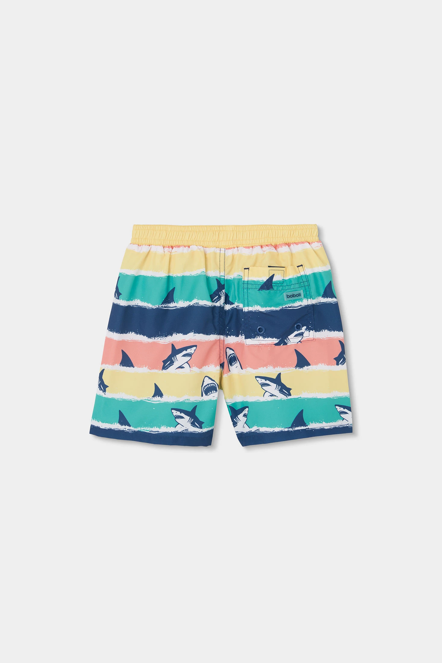 Fato de banho de tecido reciclado azul ideal para pequenos aventureiros na água. Apresenta um design colorido com ilustrações de tubarões em riscas horizontais de cores vibrantes. O seu material técnico garante uma secagem rápida e conforto durante o uso. Disponível em tamanhos desde 2 anos até 14 anos, adaptando-se a diferentes etapas de crescimento. A cintura elástica com cordão oferece um ajuste seguro e confortável. Perfeito para dias de piscina ou praia, este fato de banho combina estilo e funcionalidade para desfrutar ao máximo do verão.