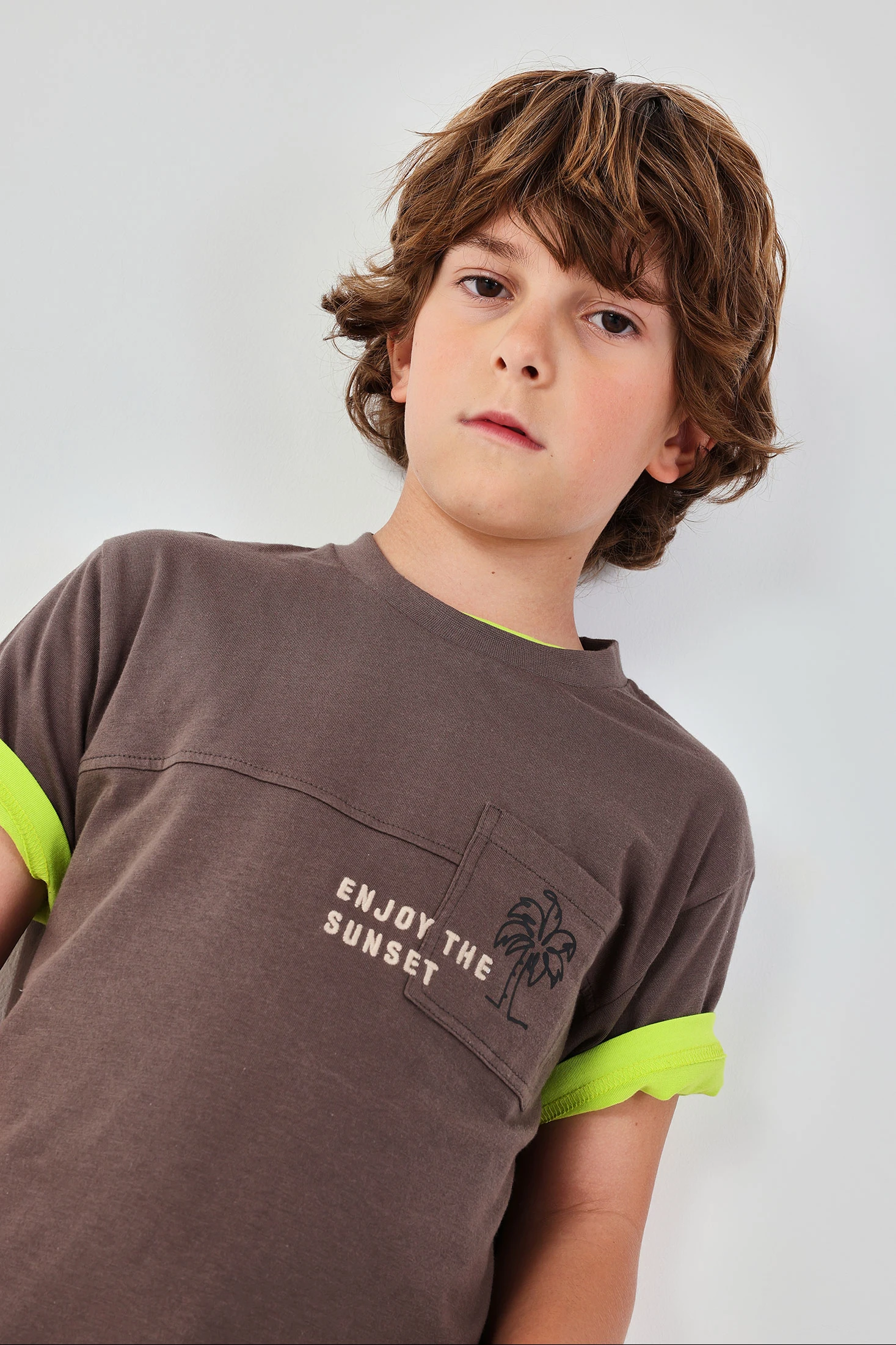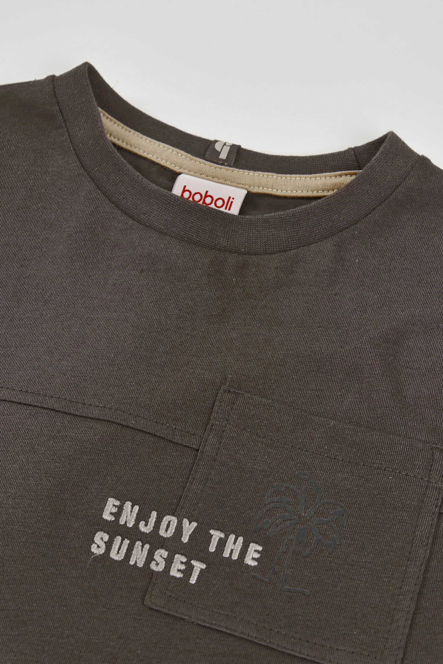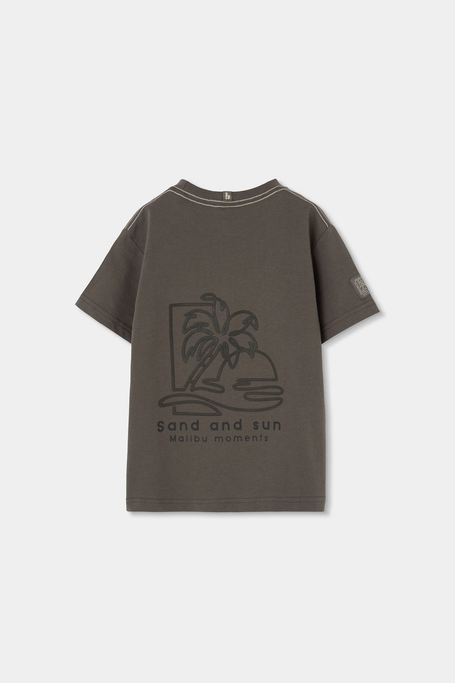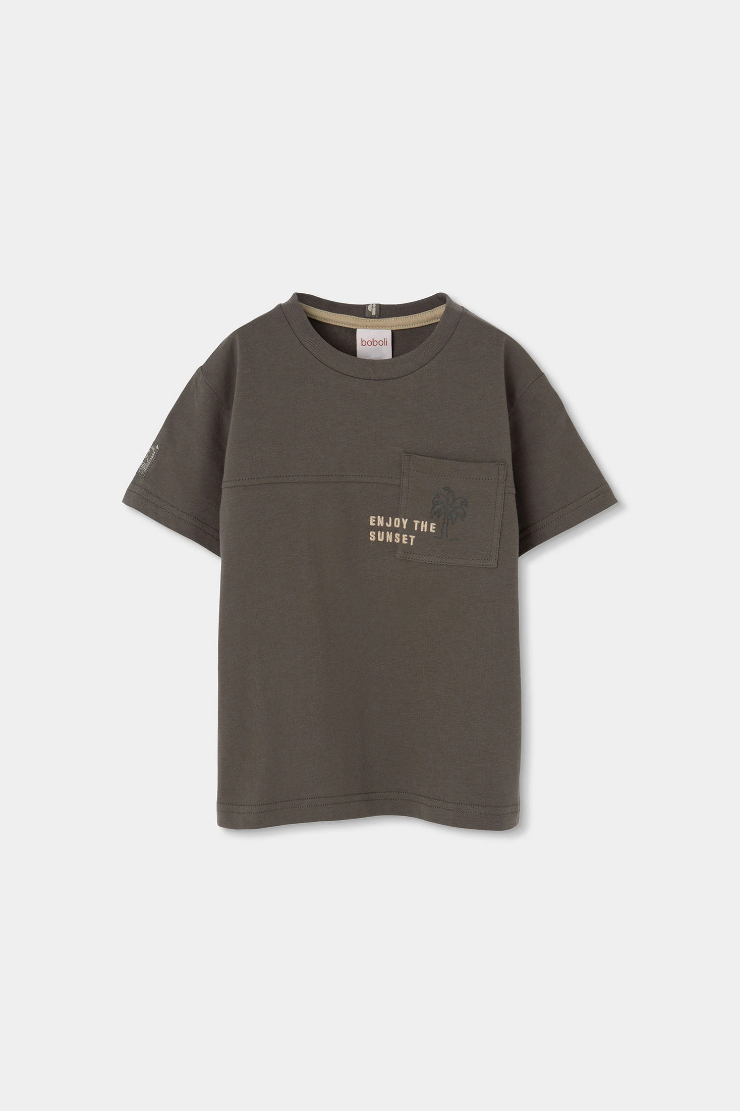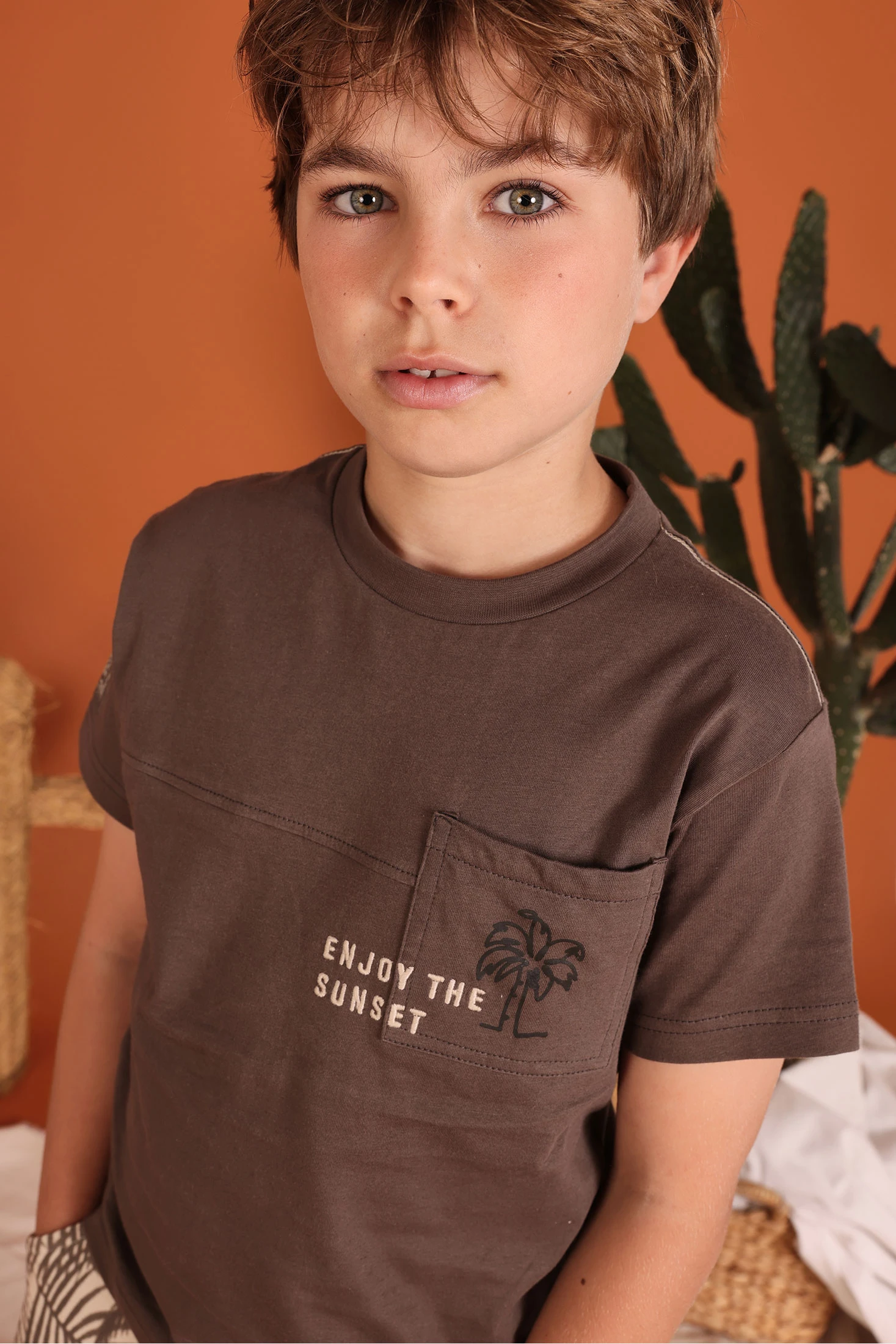 T-shirt de malha para criança, opção ideal para o dia a dia. Confeccionada num tecido suave e confortável, é perfeita para manter a frescura na primavera e verão. A sua cor castanha escura com um design simples torna-a fácil de combinar com diferentes estilos. Apresenta um bolso frontal com um pequeno detalhe de texto e palmeiras. Está disponível em tamanhos de 2 anos até 14 anos, adaptando-se a cada fase de crescimento. Uma peça versátil que adiciona um toque casual e moderno ao conjunto do seu pequeno.