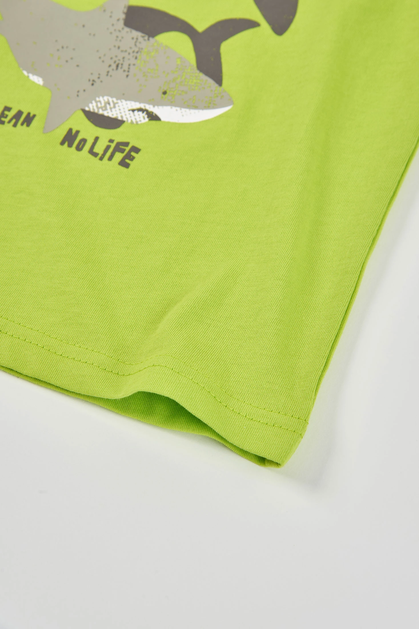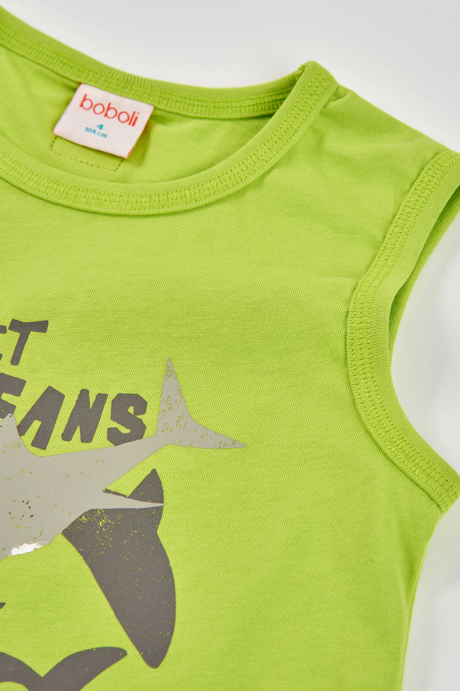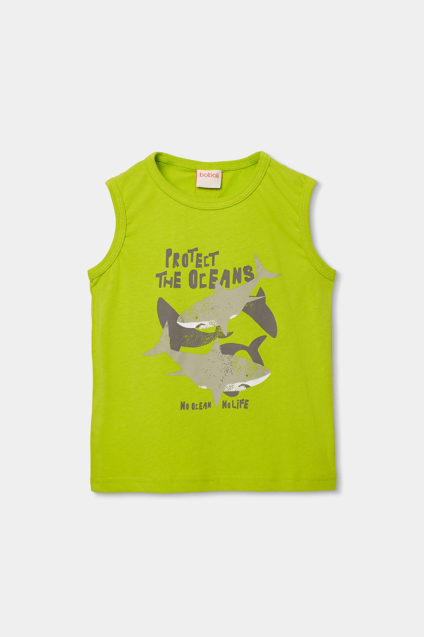 Camisola sem mangas para criança feita de malha de algodão, ideal para o verão. Apresenta uma cor verde vibrante com uma estampa de tubarões e mensagens sobre a proteção dos oceanos. É suave e respirável, perfeita para se manter fresco em dias quentes. Desenhada para idades de 2 a 14 anos, oferece conforto e estilo moderno. Peça versátil que pode ser combinada facilmente com calções ou jeans, ideal para aventuras ao ar livre.