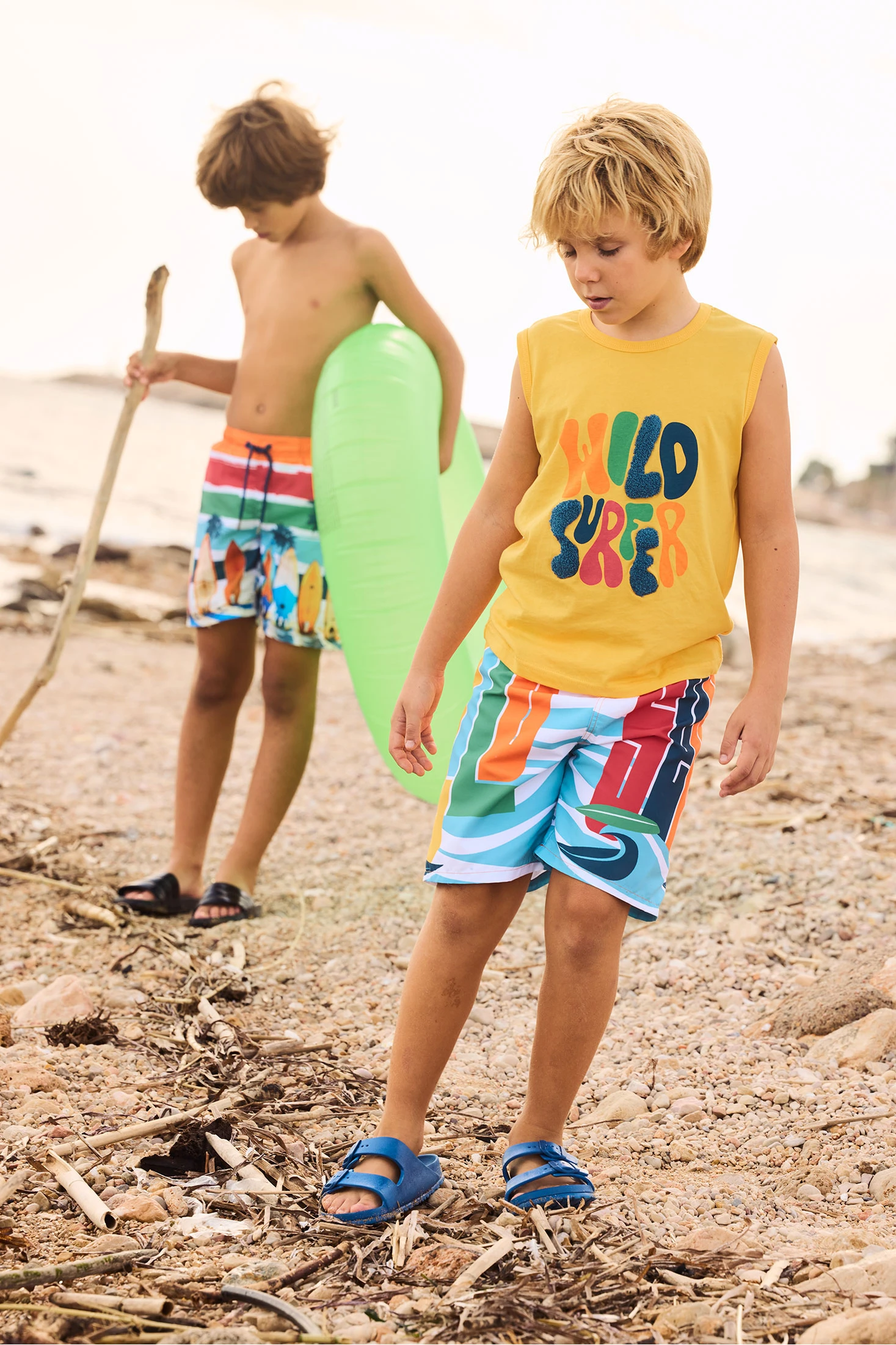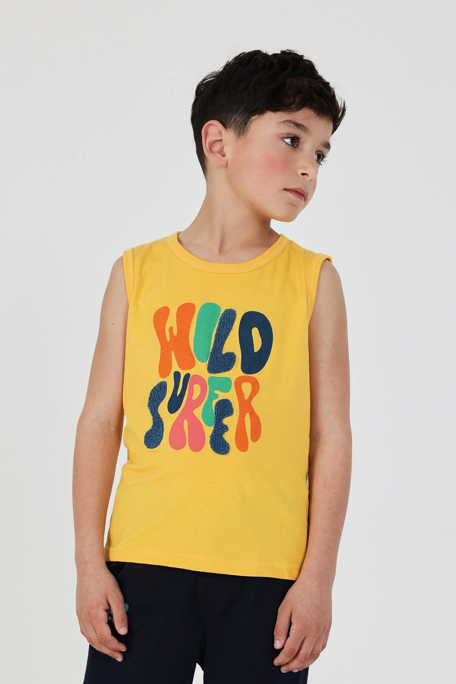 Camisola sem mangas para rapaz, ideal para dias ensolarados, confecionada em malha de algodão que proporciona suavidade e frescura. De cor amarela vibrante, destaca-se por um design com letras multicolores no centro. Disponível em tamanhos desde os 2 anos até aos 14 anos. Perfeita para combinar com calções ou jeans, traz um toque alegre e juvenil ao guarda-roupa de qualquer criança. O seu design sem mangas torna-a especialmente confortável para o jogo e a diversão ao ar livre.