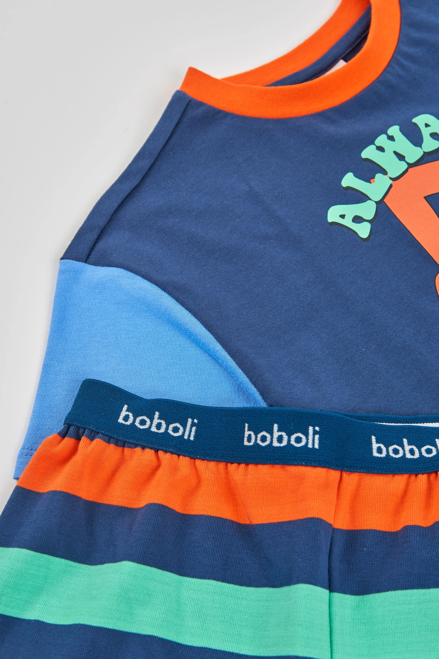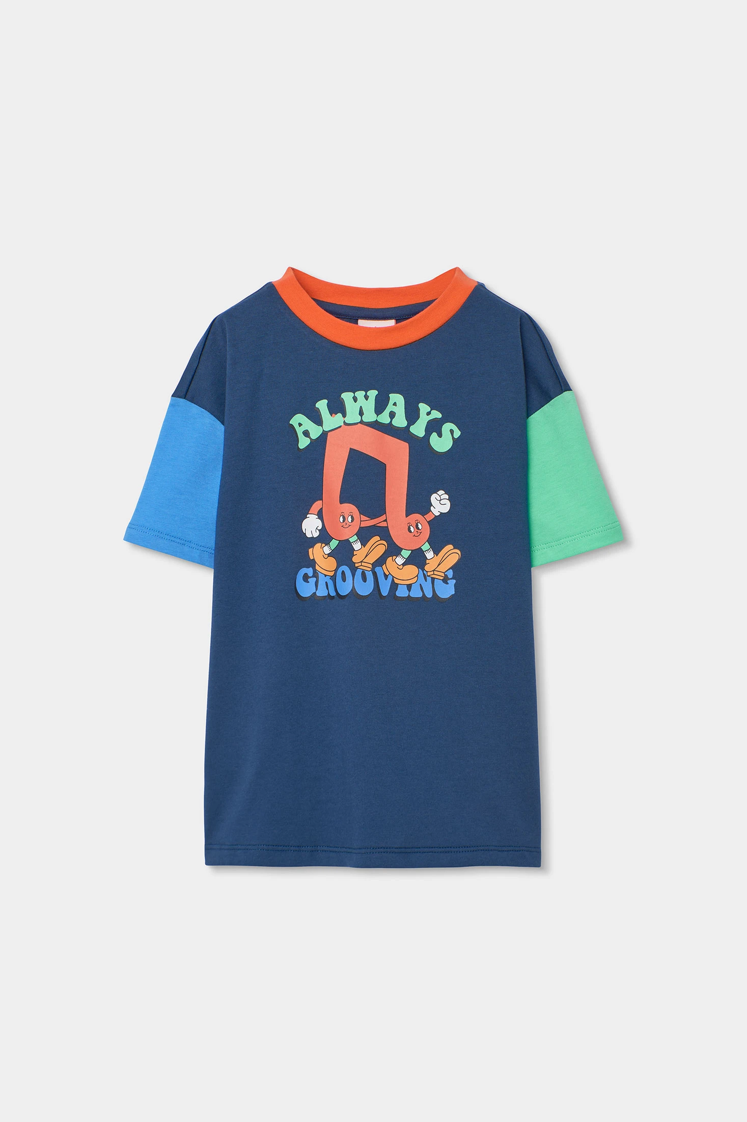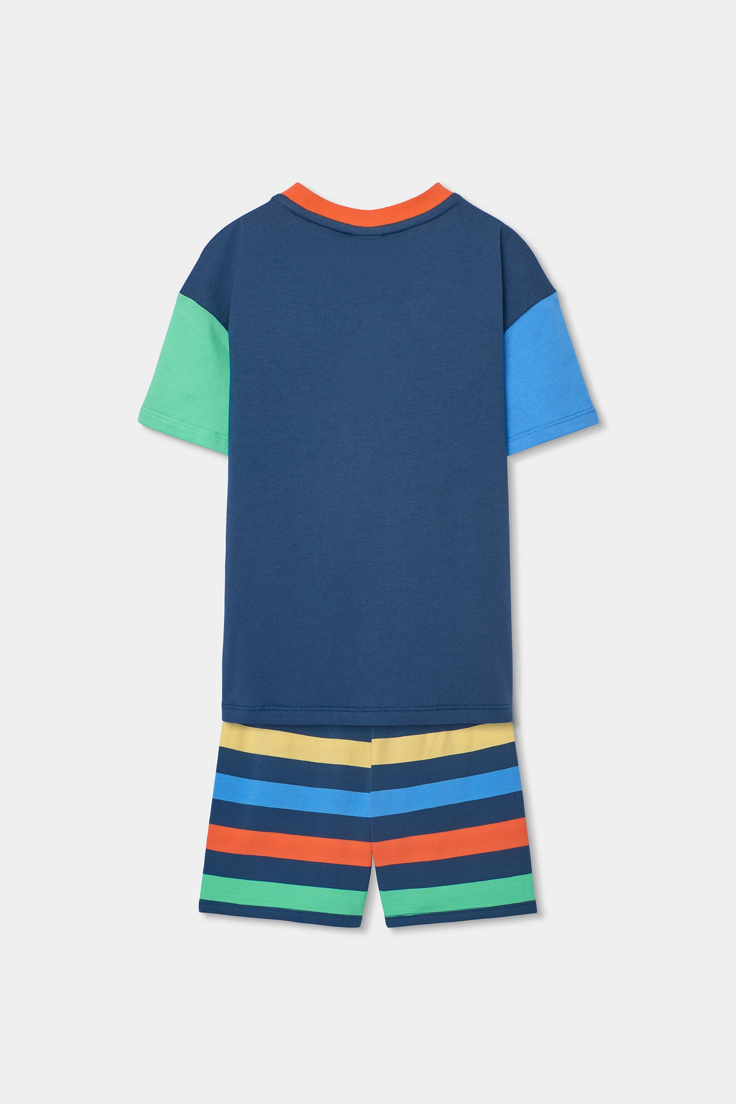 Pijama azul para criança confeccionado em suave algodão, garantindo conforto durante toda a noite. Apresenta um design divertido com notas musicais e texto, além de mangas de cores distintas. A parte inferior é às riscas multicoloridas, adicionando um toque alegre. Disponível em tamanhos desde 2 até 14 anos, oferecendo um ajuste adequado à medida que a criança cresce. Perfeito para proporcionar estilo e conforto na hora de dormir.