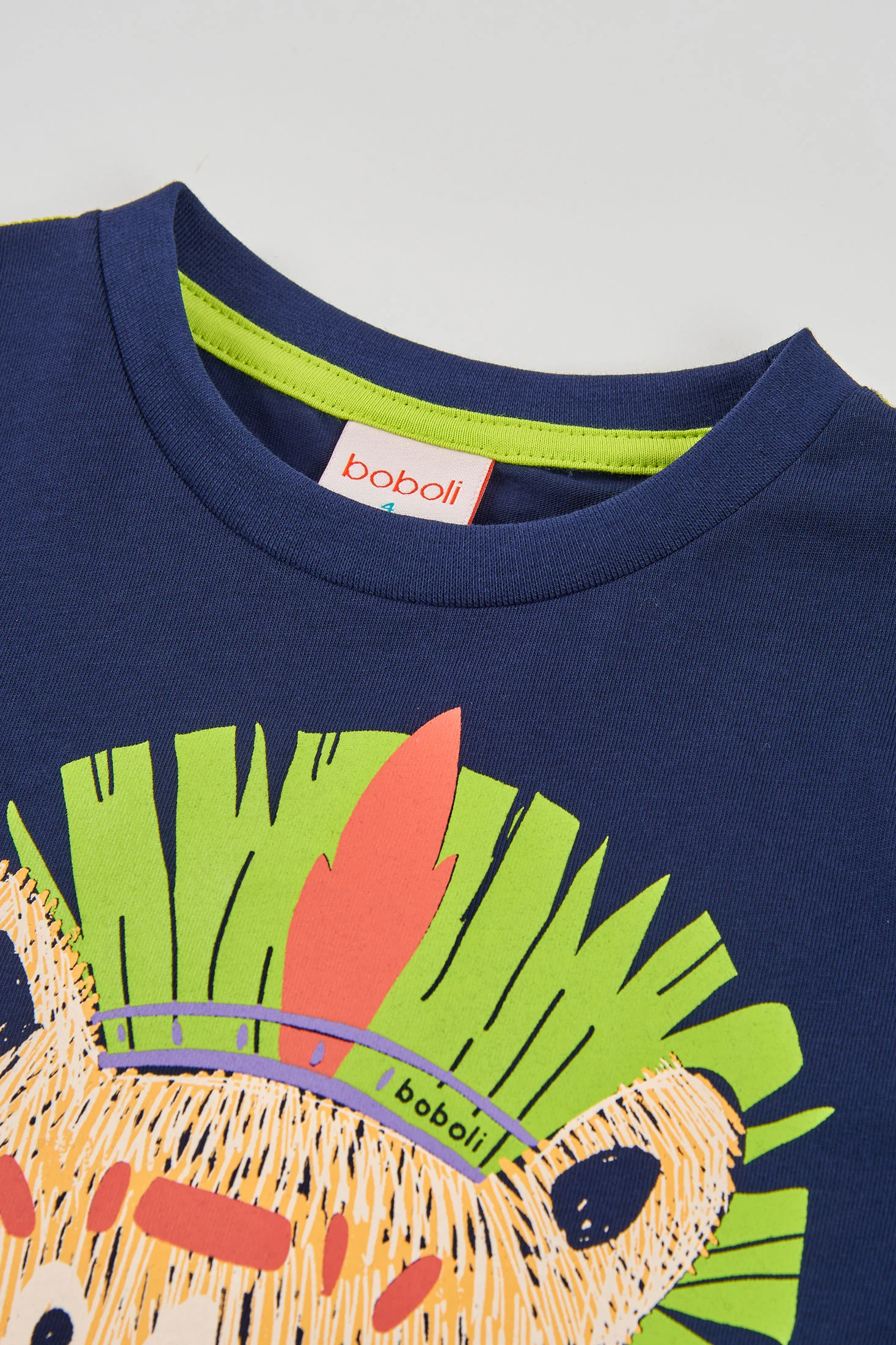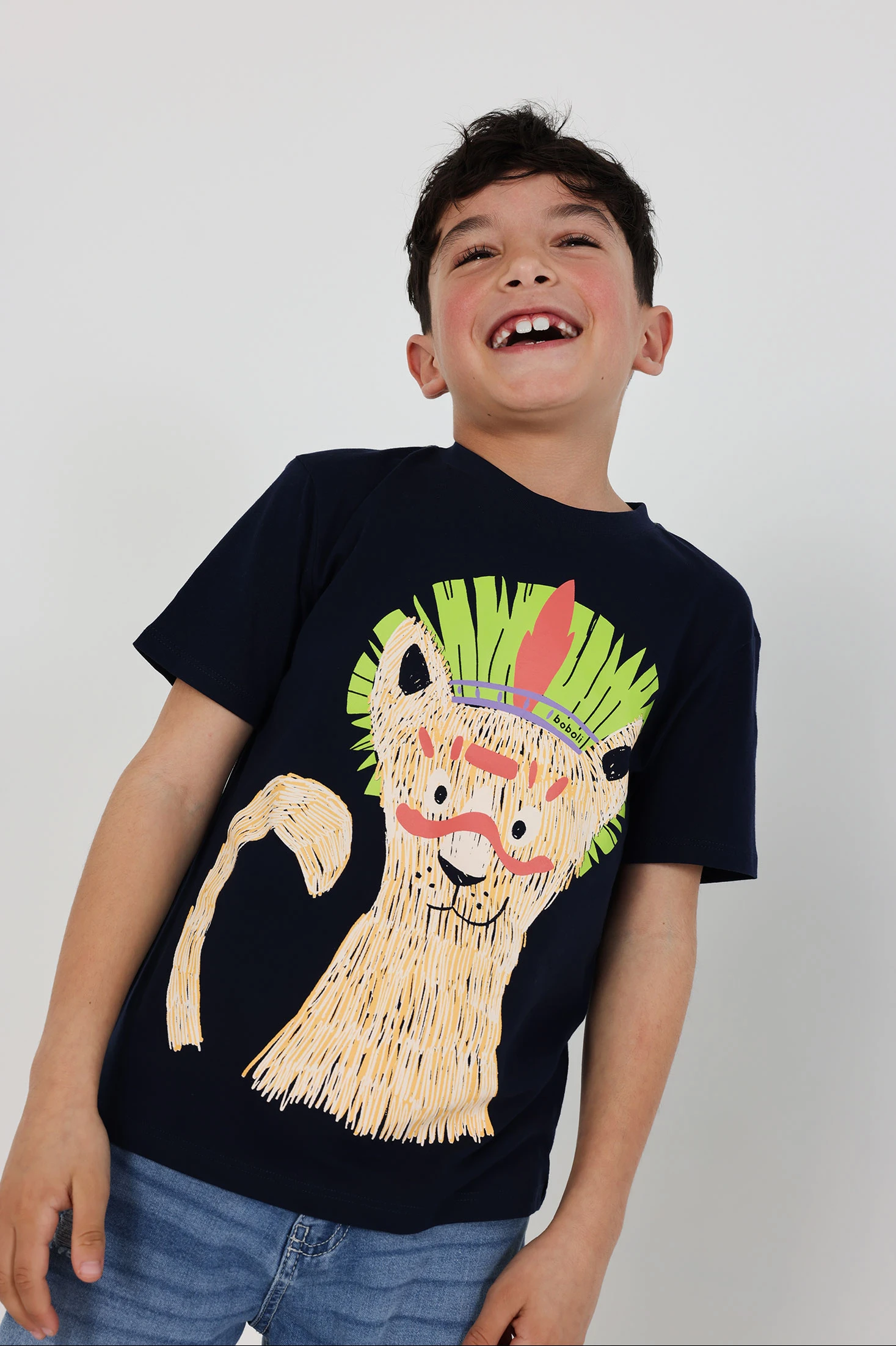 T-shirt de algodão de malha para menino com um divertido design de animal na parte frontal, de cor azul marinho, oferece um estilo versátil e moderno para a temporada. O material é suave e confortável, ideal para uso diário. Disponível em tamanhos desde 12 meses até 14 anos, garantindo um ajuste perfeito à medida que cresce. Com gola redonda, esta t-shirt combina facilmente com calças ou calções, oferecendo uma opção funcional e elegante para qualquer ocasião.
