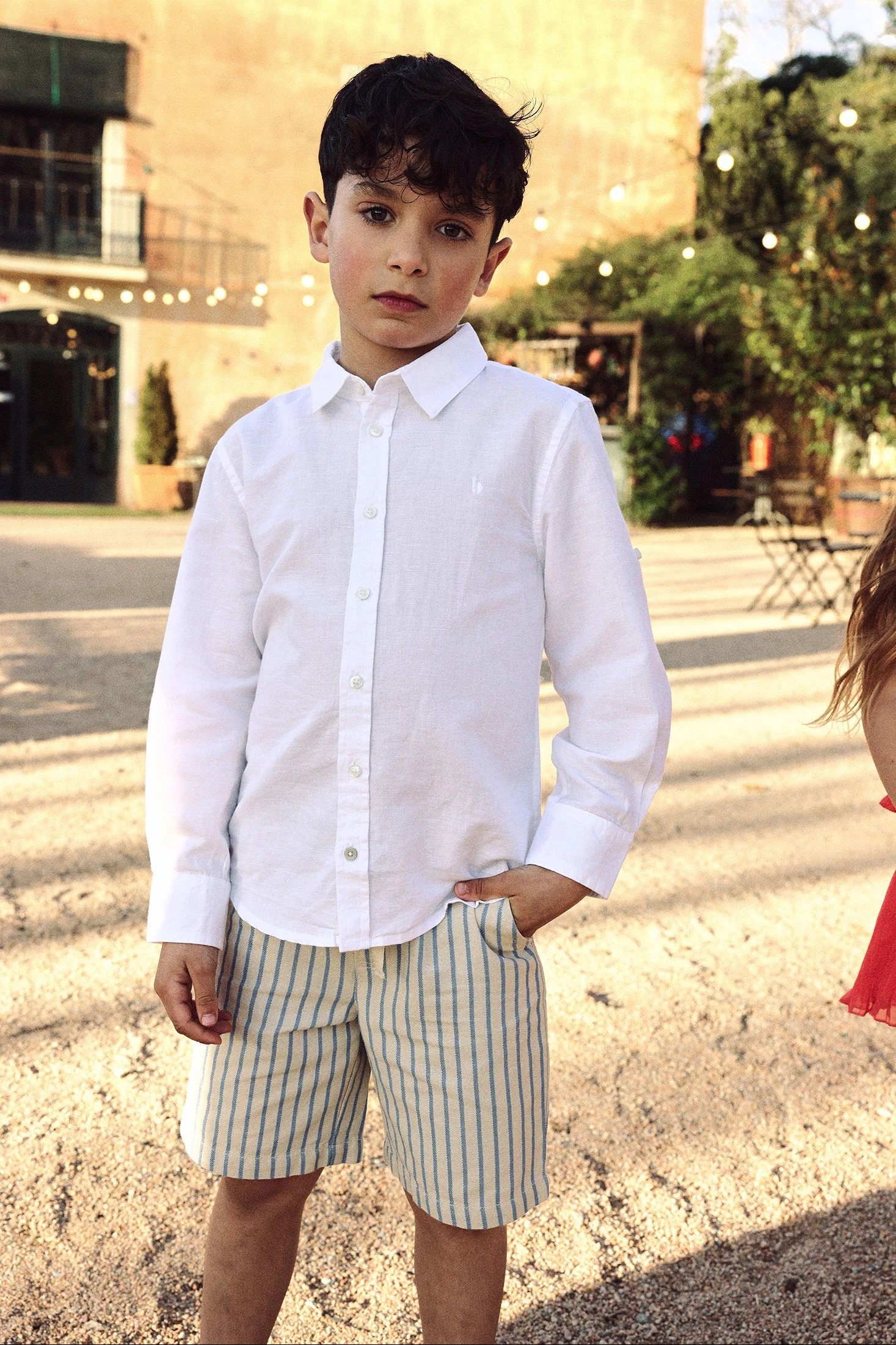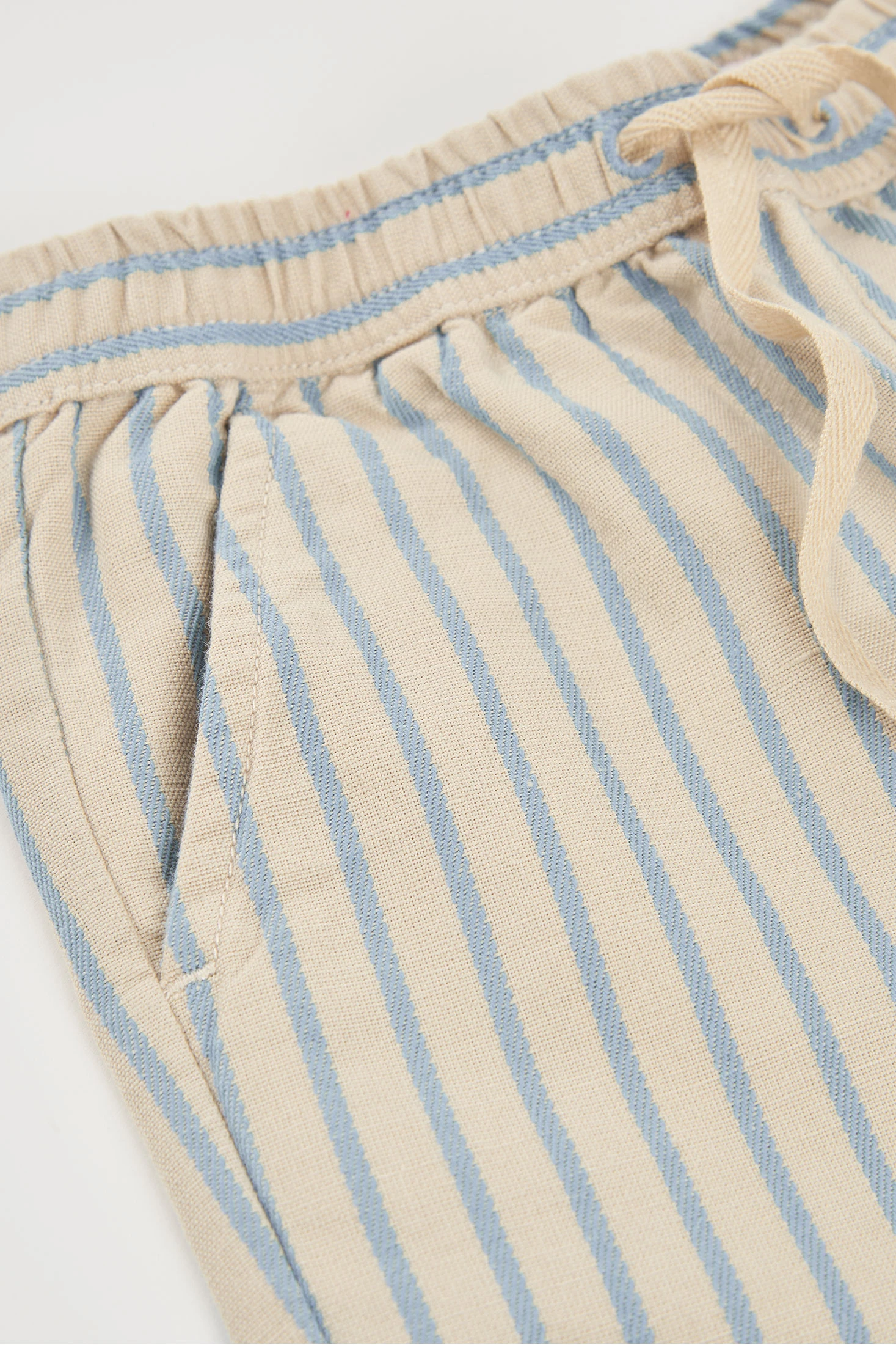 Calções de linho para menino apresentam um design às riscas em tons de bege e azul, ideais para o verão. Fabricados num tecido suave e confortável, são perfeitos para que os mais pequenos brinquem com liberdade. A cintura elástica com cordão ajustável garante um ajuste perfeito. Disponíveis em tamanhos desde 12 meses até 10 anos. São uma opção fresca e versátil que combina facilmente com camisetas e polos de cores neutras para um look casual e agradável durante os dias quentes.