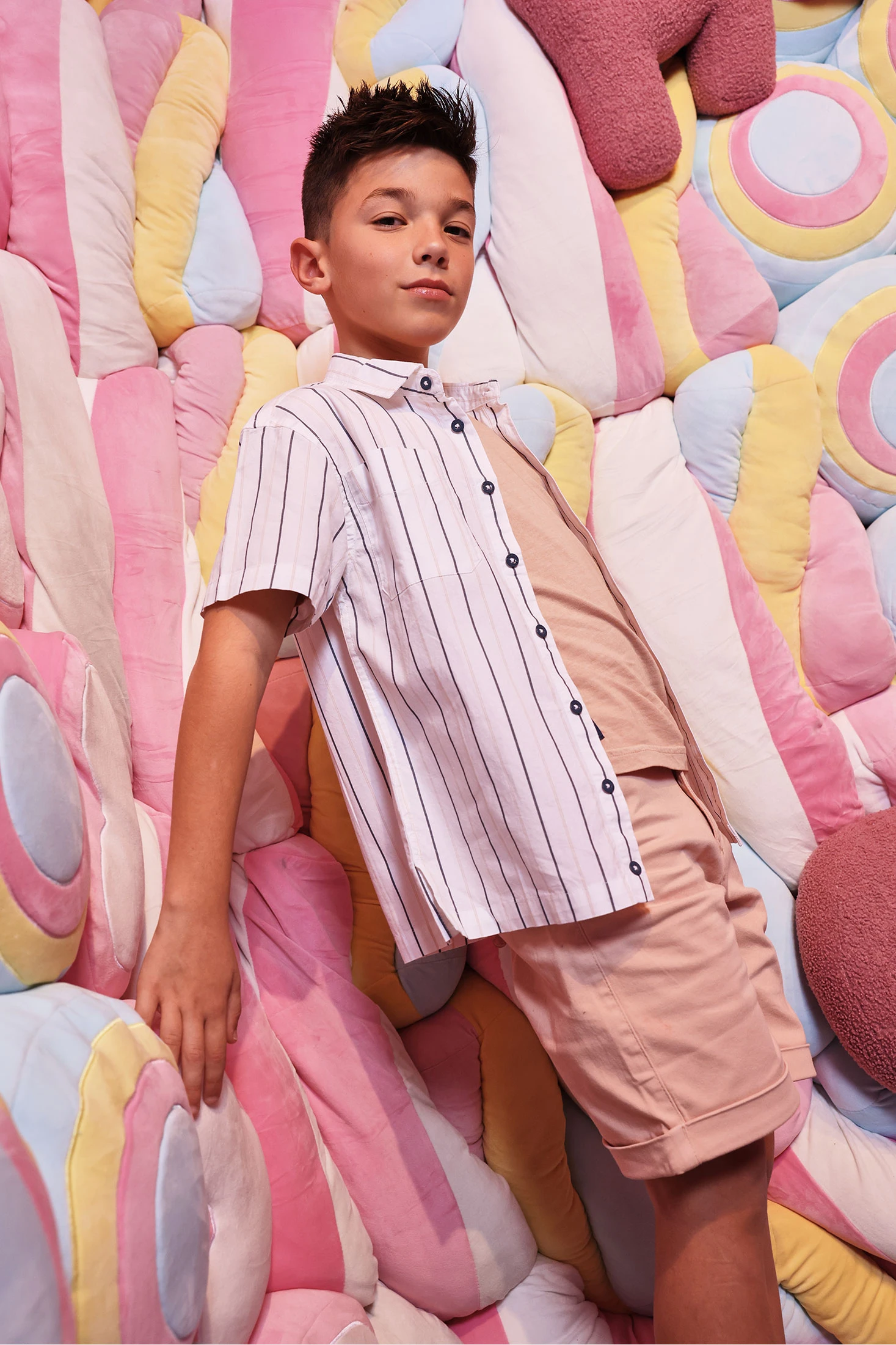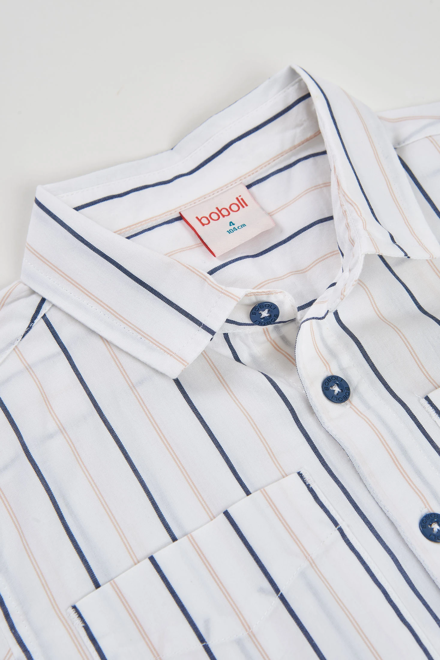 Camisa de popelina listada para criança, perfeita para um estilo elegante e confortável. Com finas riscas azuis sobre um fundo branco, apresenta uma gola clássica e mangas curtas, ideal para os dias mais quentes. Inclui botões azuis na parte frontal e dois bolsos dianteiros que adicionam funcionalidade. Disponível em tamanhos de 2 a 14 anos, adapta-se a diferentes tamanhos. A sua composição em popelina torna-a leve e respirável. Perfeita para ocasiões formais ou casuais, combinando facilmente com calças ou calções para um look moderno.