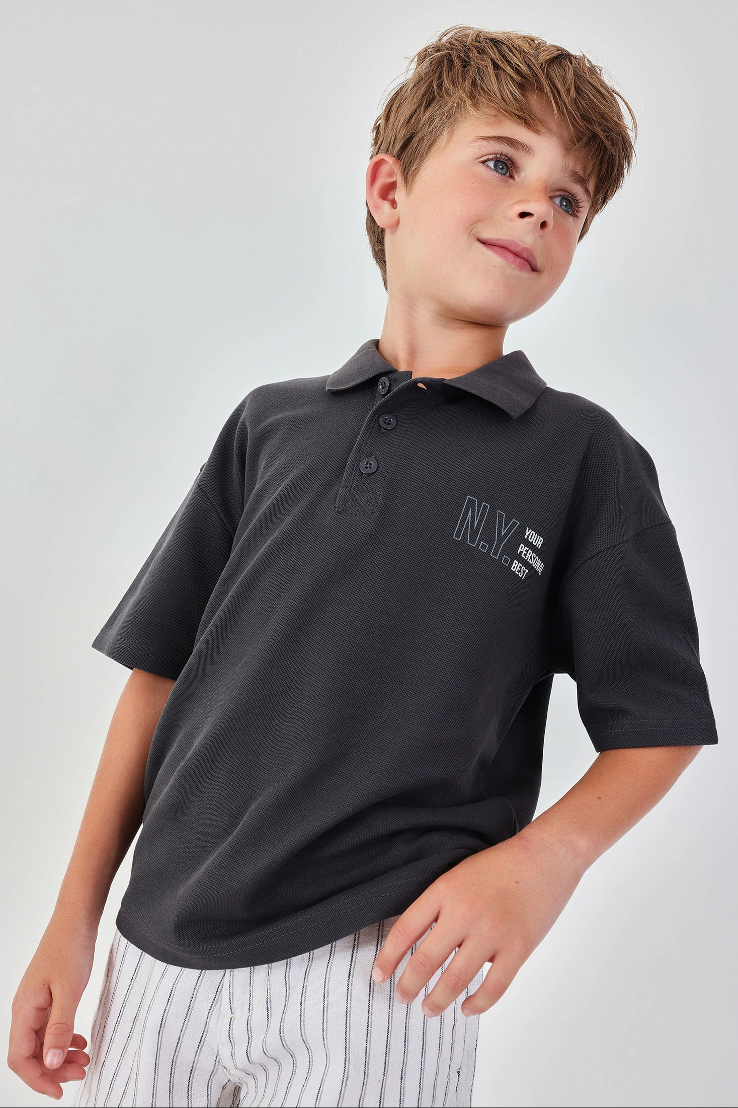 Polo para criança confeccionado em algodão cinza, um material suave e confortável, ideal para a pele sensível dos mais pequenos. O design clássico inclui uma gola tipo polo e botões frontais, o que facilita a sua colocação. Perfeito para idades de 2 a 14 anos, é versátil para ocasiões casuais ou um pouco mais formais. A sua cor cinza facilita as combinações com diferentes estilos e peças de roupa. Um detalhe discreto no peito acrescenta um toque de interesse sem ser excessivo, tornando-o numa opção elegante para qualquer guarda-roupa.