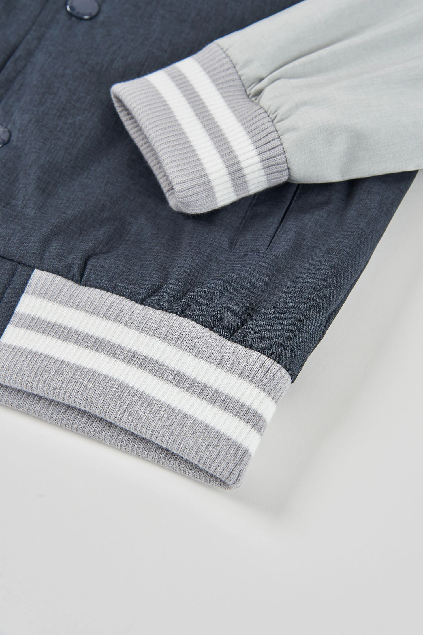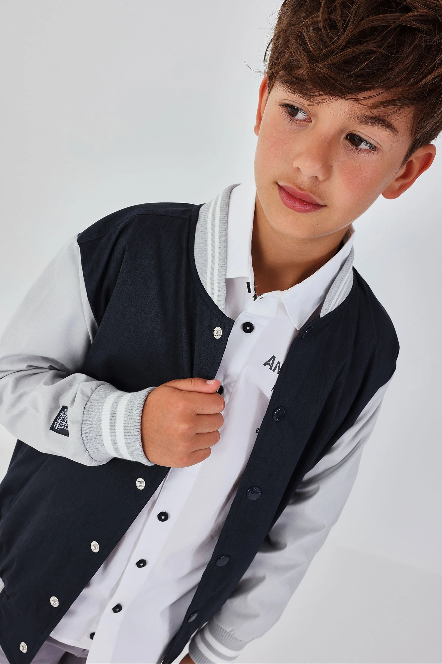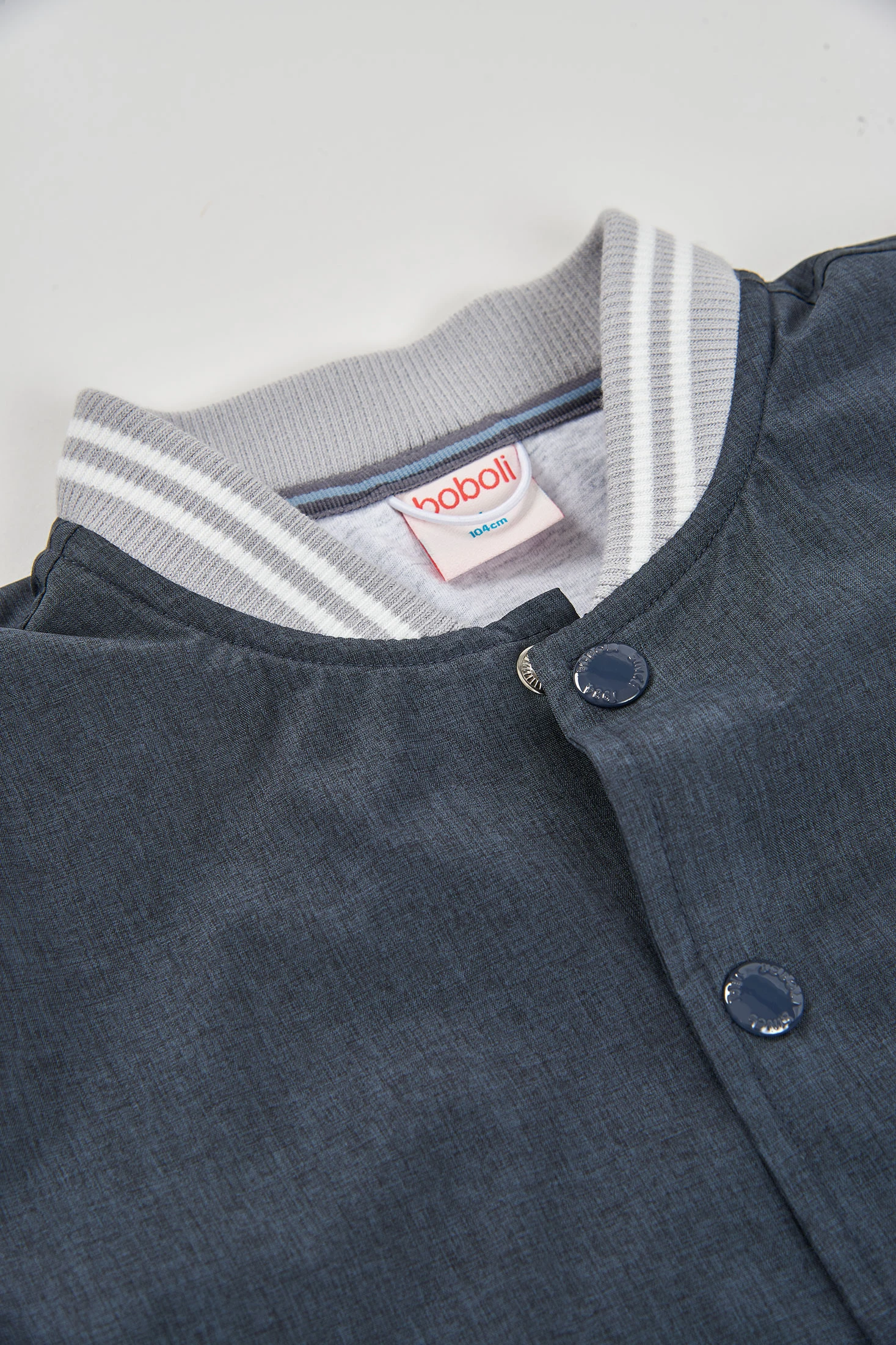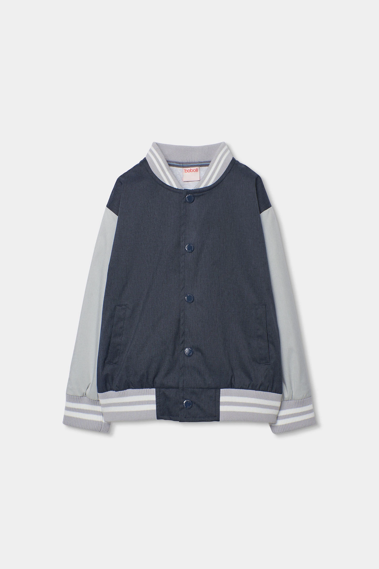 Bomber de tecido técnico para menino, ideal para meia-estação. De cor cinza escuro, apresenta um design clássico com fecho de botões. As mangas compridas e a gola redonda com punhos canelados oferecem calor e conforto. Está disponível dos 2 aos 14 anos. O seu estilo versátil torna-a perfeita para combinar com jeans ou calças casuais, proporcionando uma aparência moderna e aconchegante para os dias quentes.