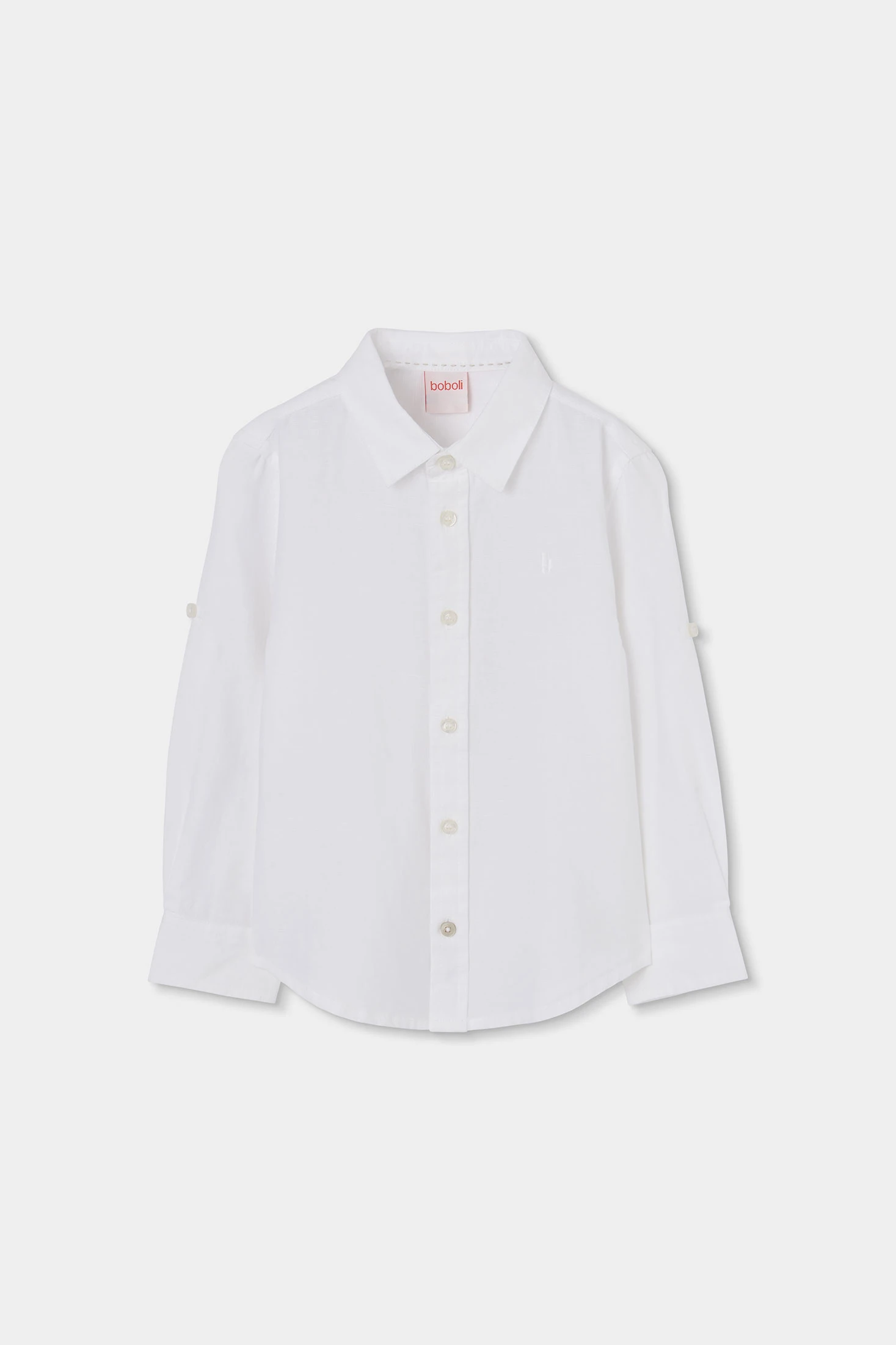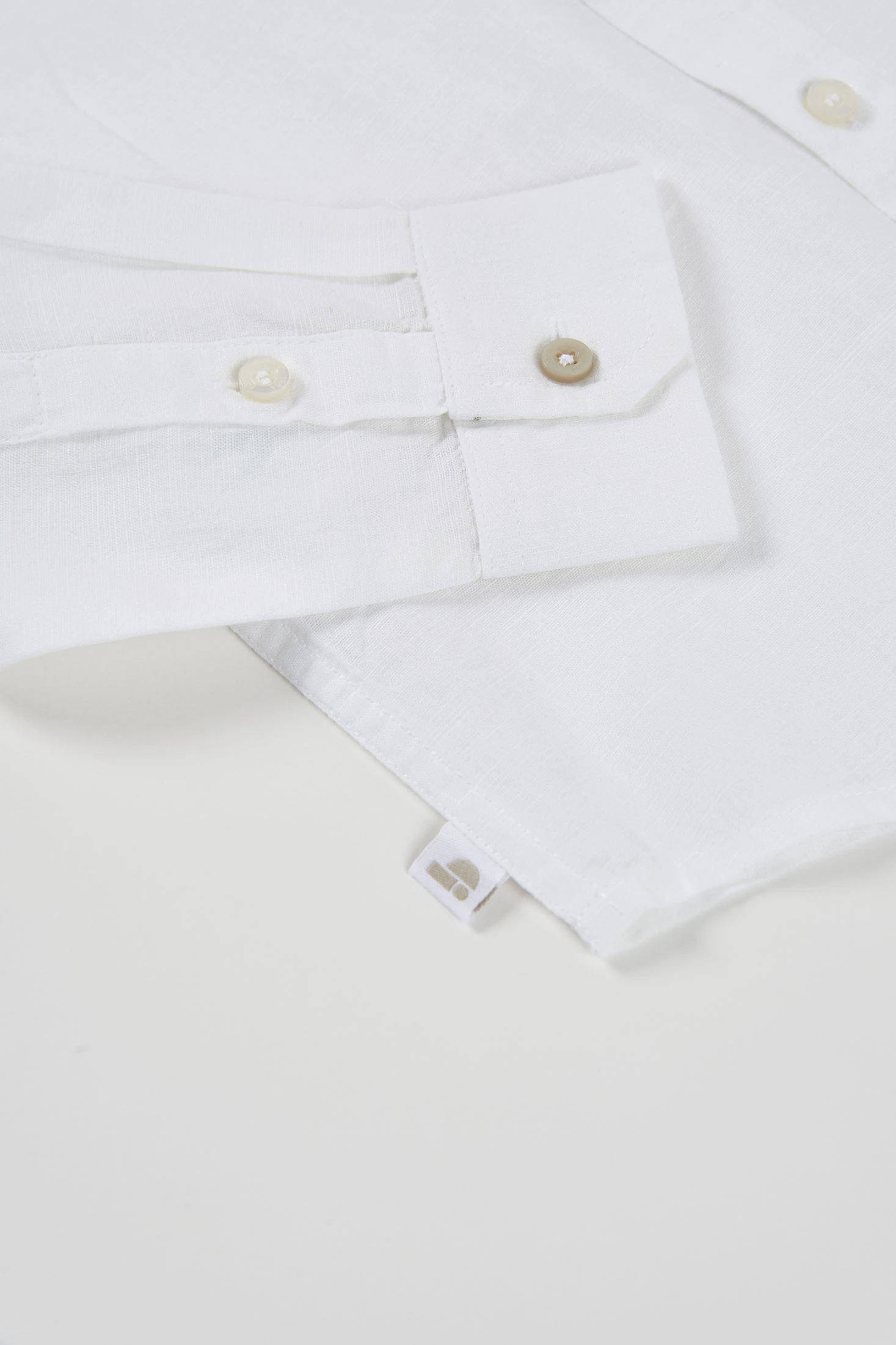 Camisa de linho branca para menino, elegante e fresca, ideal para ocasiões especiais ou para o dia a dia. O seu design liso e clássico apresenta uma gola tradicional e botões frontais, oferecendo um estilo impecável. As mangas compridas podem ser ajustadas para maior conforto. Disponível em tamanhos desde 12 meses até 14 anos, adapta-se ao crescimento das crianças. A sua cor neutra facilita a combinação com calças ou calções de diversas cores, adicionando um toque sofisticado a qualquer roupa.