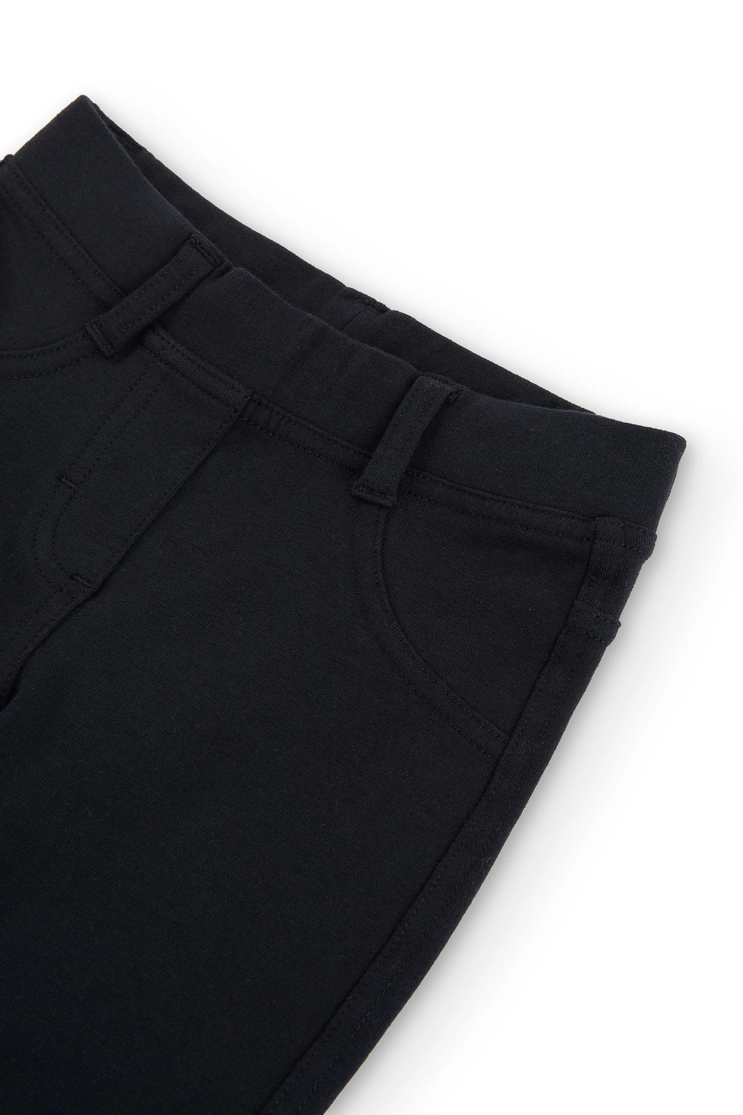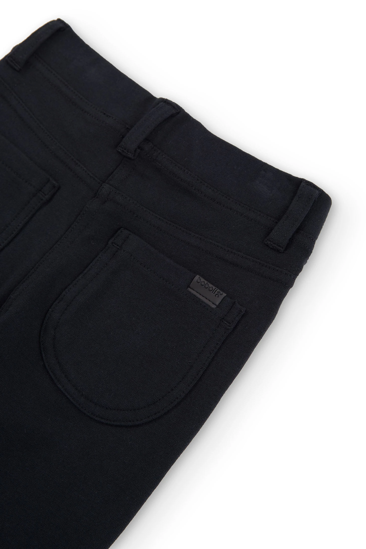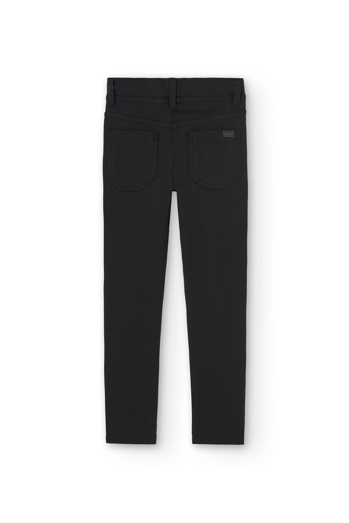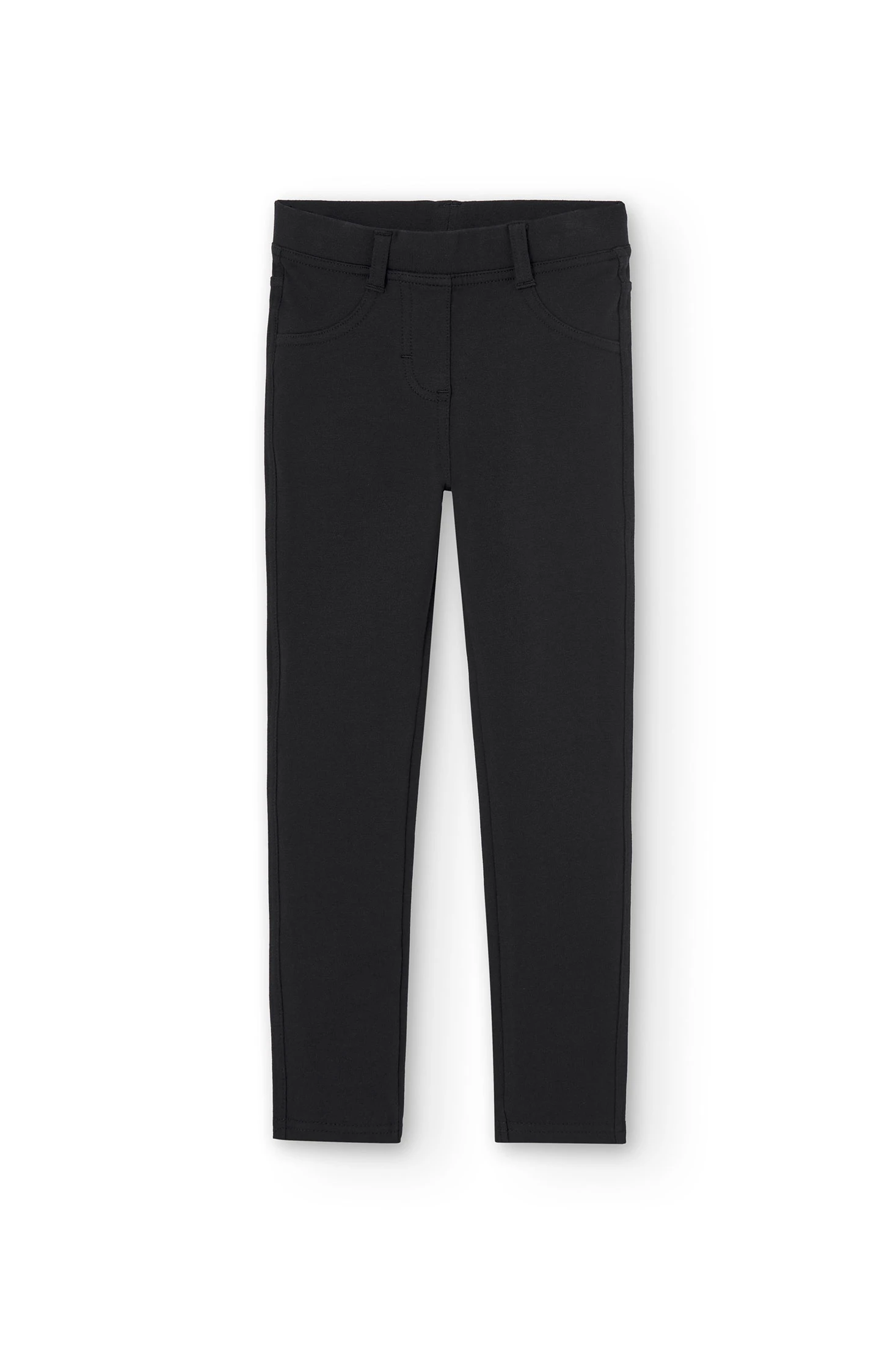 Calças em felpo elástico de menina na cor preta, ajustam-se com elástico, os bolsos à frente e a braguilha são de adorno. Decoração de etiqueta com detalhe da marca. Disponível do tamanho 4 anos aos 16 anos.