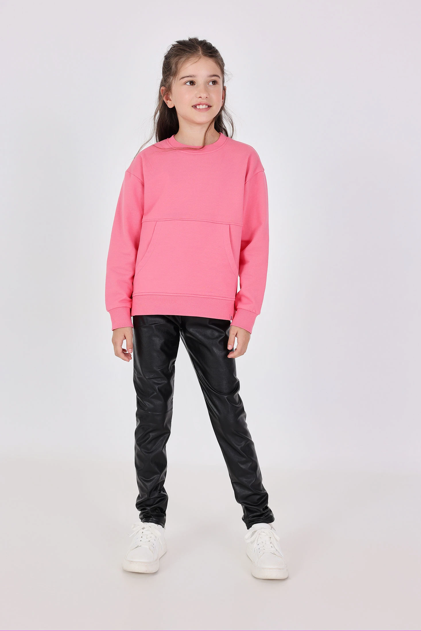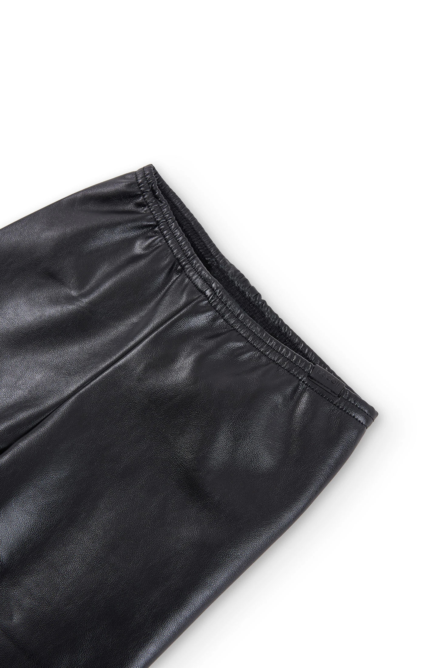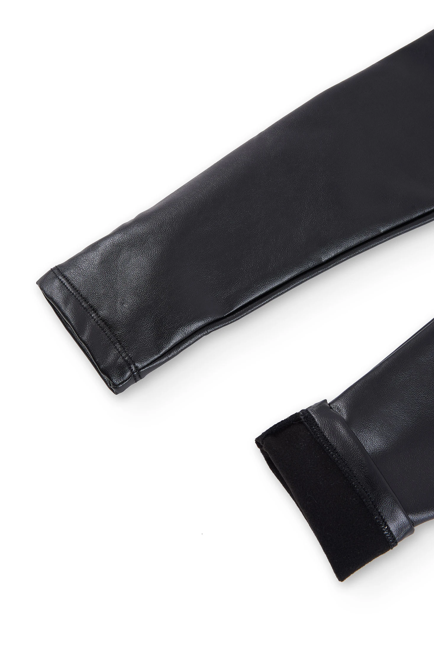 Leggings em pele sintética de menina em preto, ajustam-se com elástico. A decoração é um pequeno padrão com detalhe da marca. Disponível desde o tamanho 4 anos até ao 16 anos.