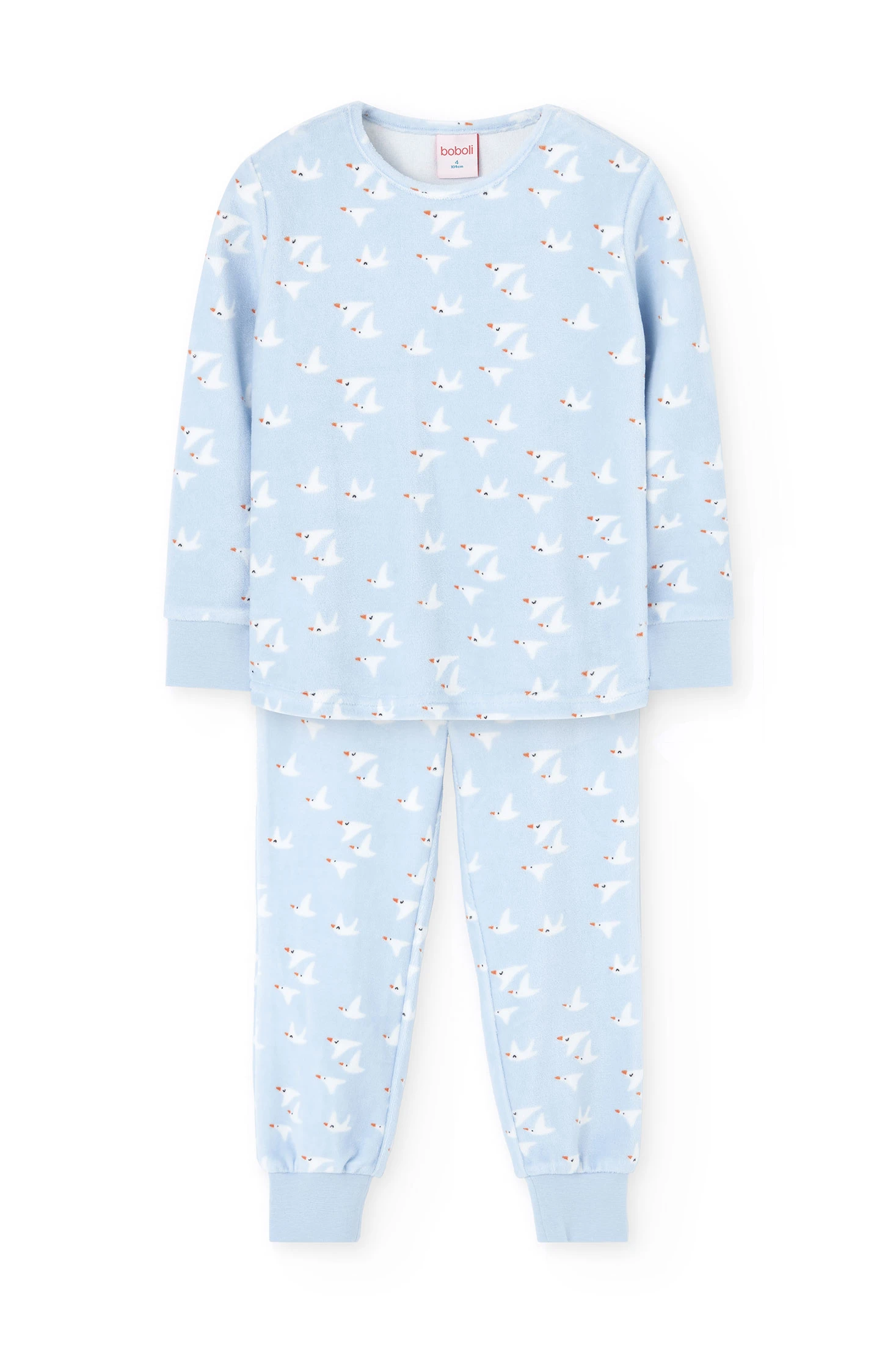 Pijama para menina perfeito para noites frescas, assegurando conforto e calor. Confeccionado em veludo suave de cor azul, a parte superior apresenta um encantador design de aves brancas, com calças a condizer. As mangas compridas garantem proteção adicional contra o frio. Disponível em tamanhos desde bebés até aos 14 anos, este conjunto é ideal para combinar estilo e conforto em temporadas mais frias. Certifica-te de que a tua pequena desfruta de sonhos doces com este acolhedor pijama.