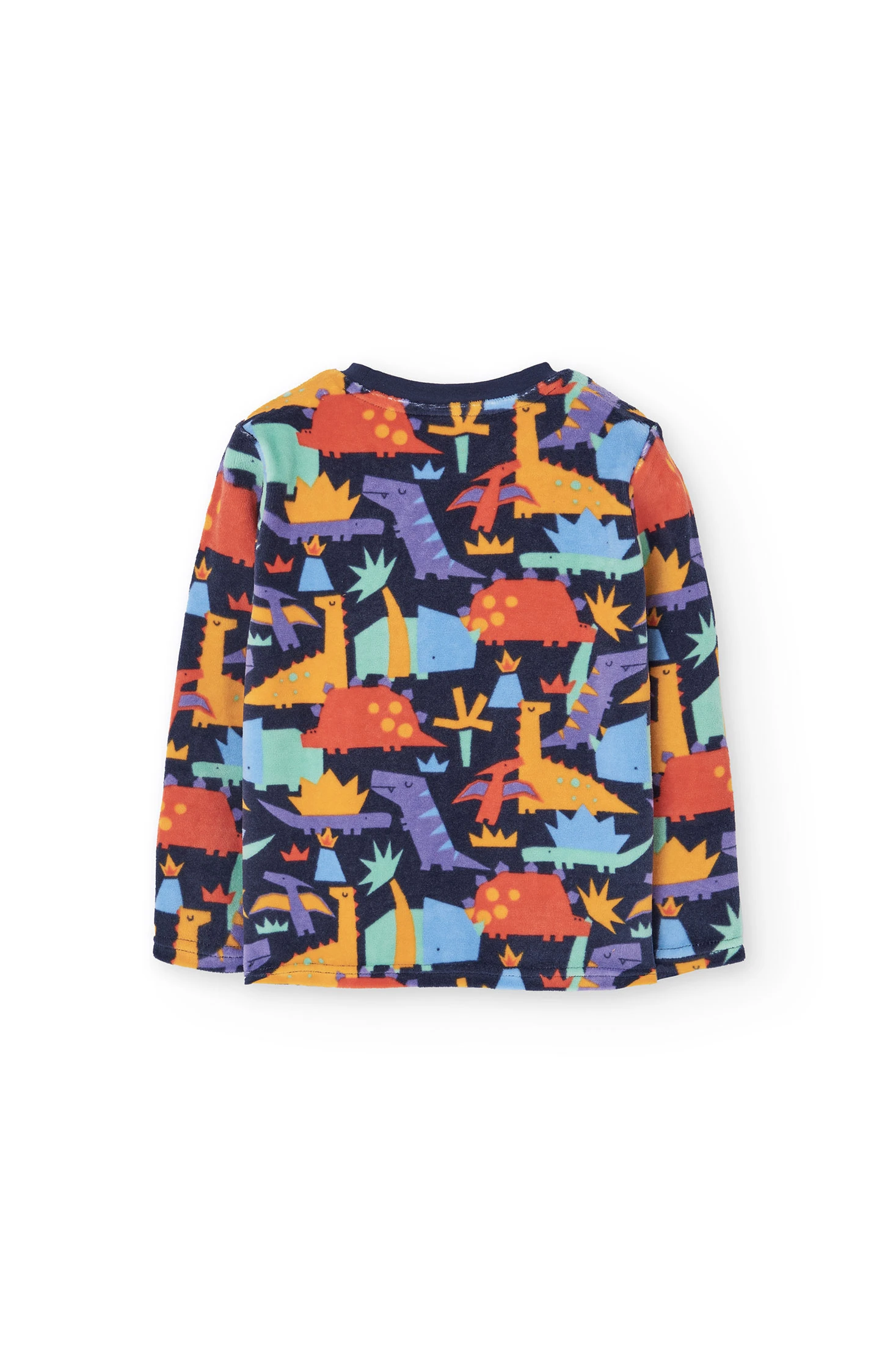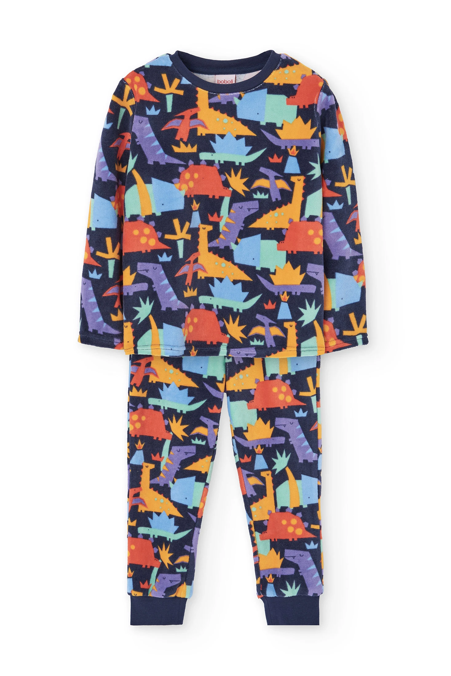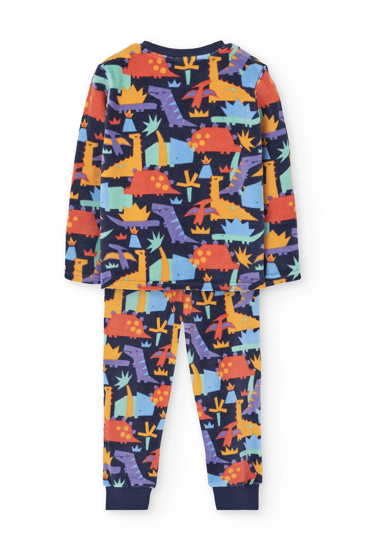 Pijama de veludo para menino com uma encantadora estampa de dinossauros em cores vibrantes sobre um fundo escuro, perfeito para as estações mais frias como outono e inverno. Confeccionado em um veludo suave e acolhedor, oferece um conforto inigualável durante o sono. Consiste numa parte superior com decote redondo e mangas compridas, e umas calças ajustadas ao tornozelo, garantindo liberdade de movimento e calor. Disponível dos 2 aos 14 anos, este pijama é ideal para que os mais pequenos descansem com estilo.