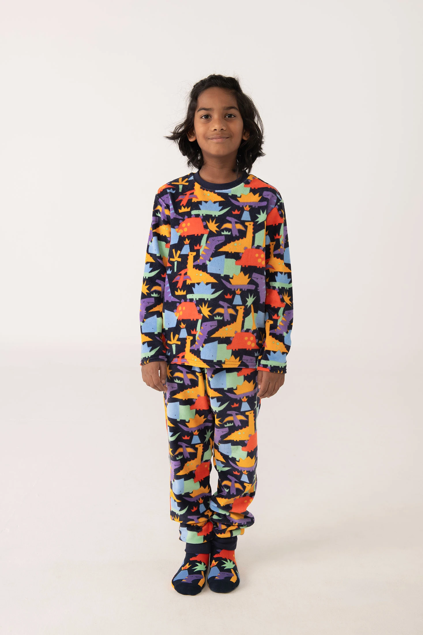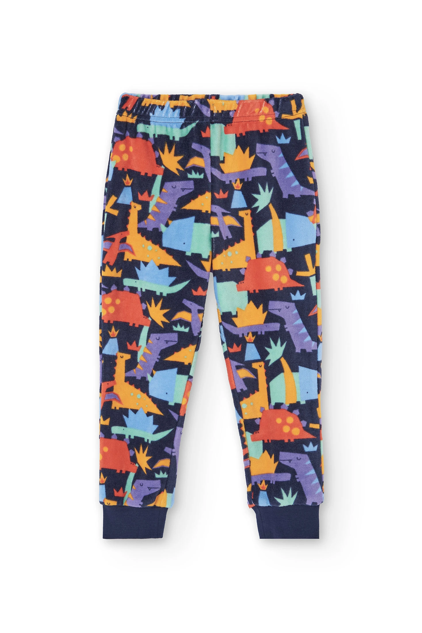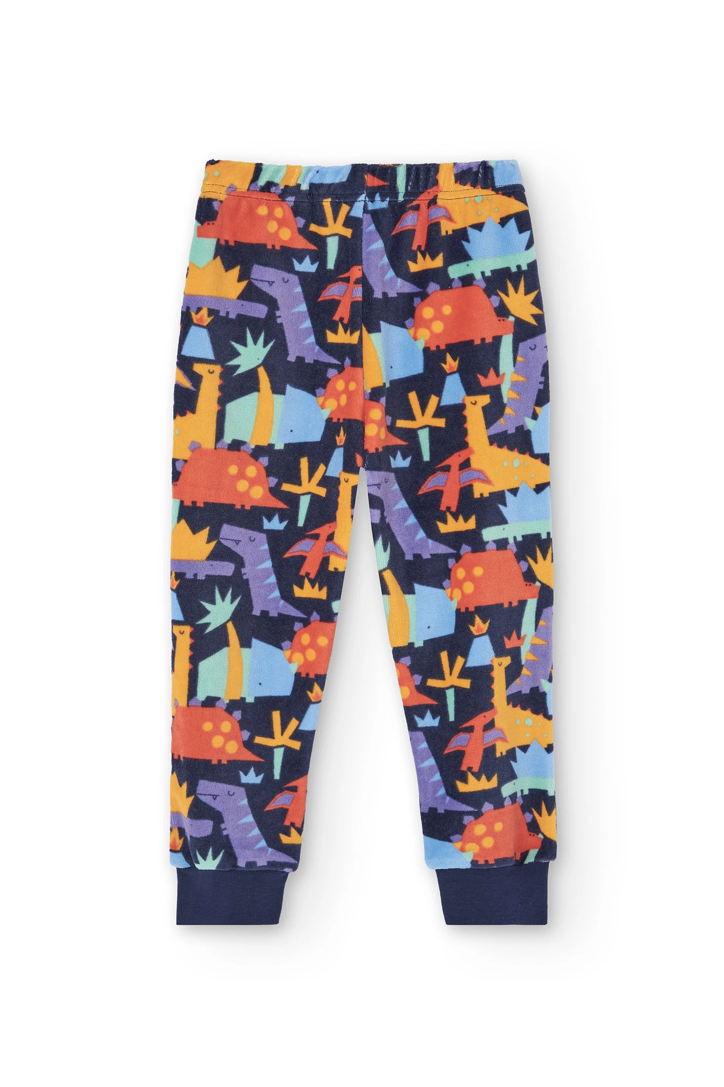 Pijama de veludo para menino com uma encantadora estampa de dinossauros em cores vibrantes sobre um fundo escuro, perfeito para as estações mais frias como outono e inverno. Confeccionado em um veludo suave e acolhedor, oferece um conforto inigualável durante o sono. Consiste numa parte superior com decote redondo e mangas compridas, e umas calças ajustadas ao tornozelo, garantindo liberdade de movimento e calor. Disponível dos 2 aos 14 anos, este pijama é ideal para que os mais pequenos descansem com estilo.