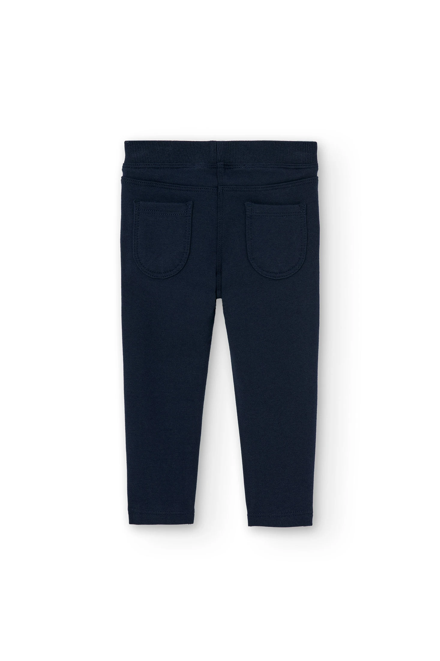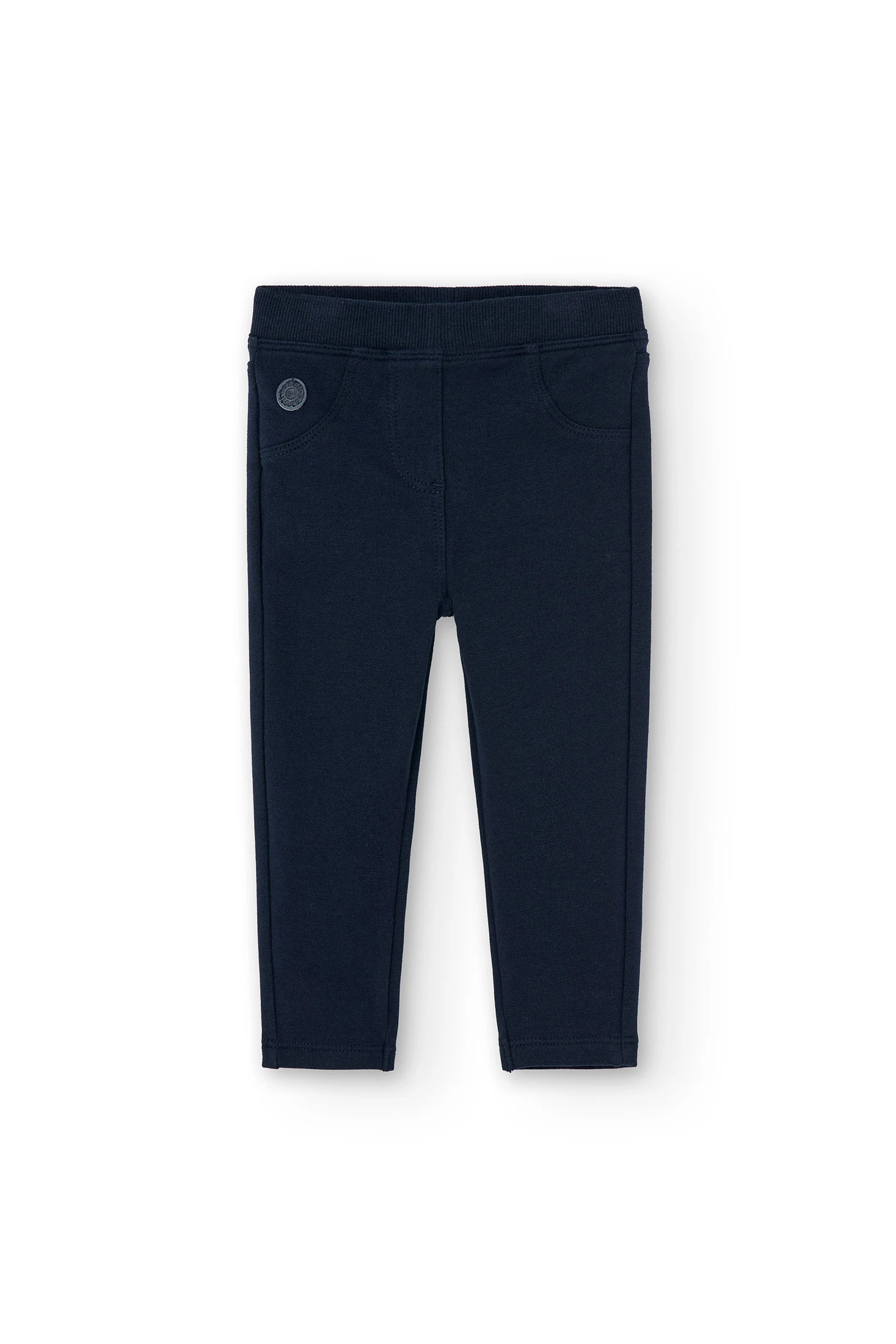 Calças de felpo elástico de menina na cor azul-marinho, ajustam-se com elástico, os bolsos à frente e a braguilha são de adorno. Decoração de etiqueta com detalhe da marca. Disponível do tamanho 6 meses aos 6 anos.
