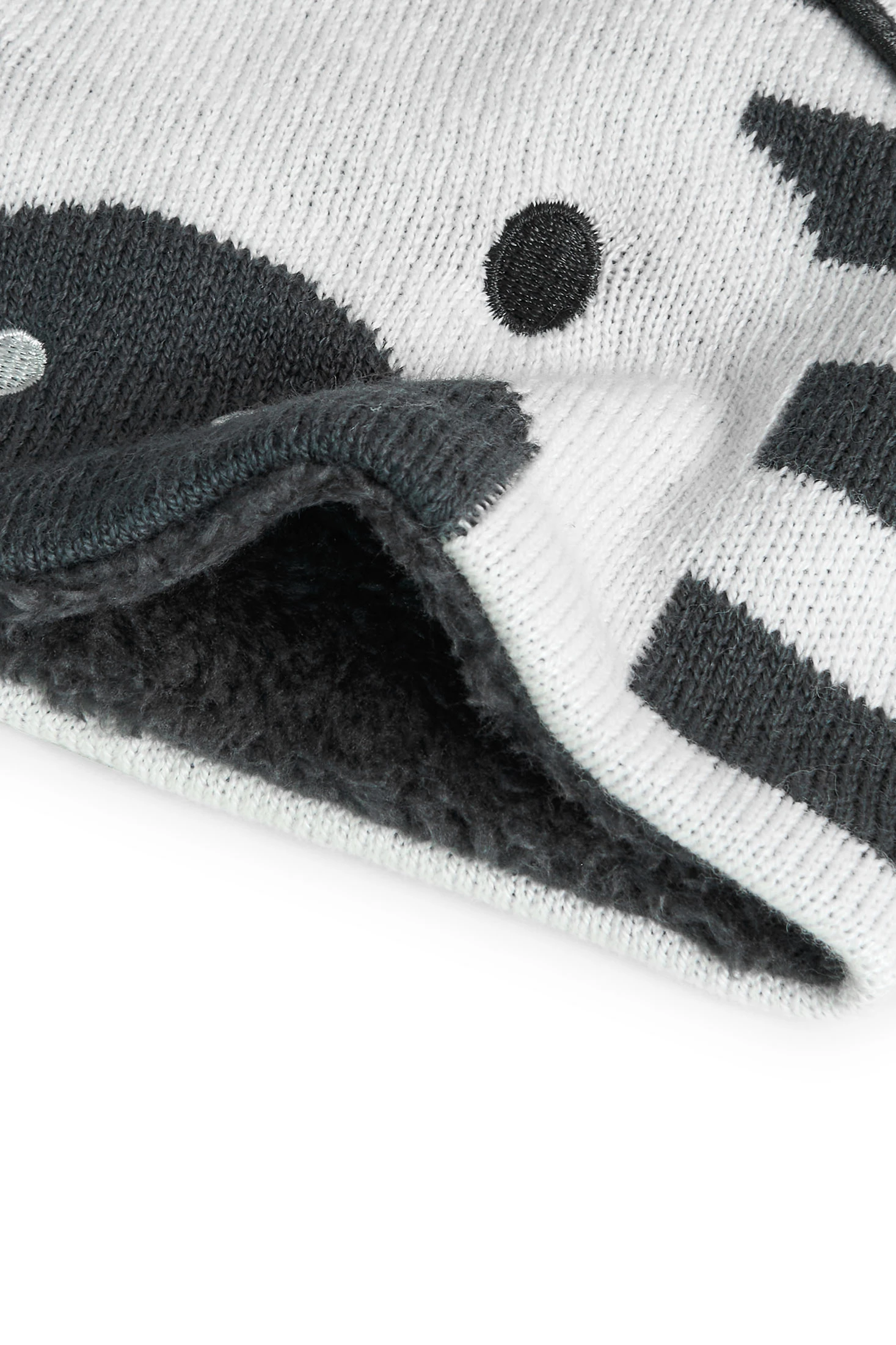 Esta é uma cachecol de tricô para bebé com um design de zebra. É unissexo, perfeito para recém-nascidos. Os tamanhos disponíveis são XXS, XS, S e M, cobrindo desde os primeiros meses até aos primeiros anos de vida. O padrão de riscas e a carinha de zebra dão-lhe um toque divertido e original. É feito de malha, um tecido quente e suave, ideal para o inverno. A sua cor é cinzento escuro, um tom neutro que combina com tudo. Este cachecol de tricô não só manterá o seu bebé aquecido, como também lhe dará um estilo único.