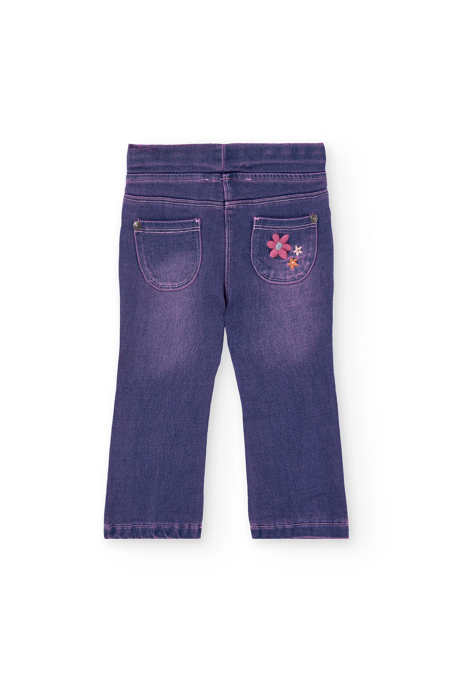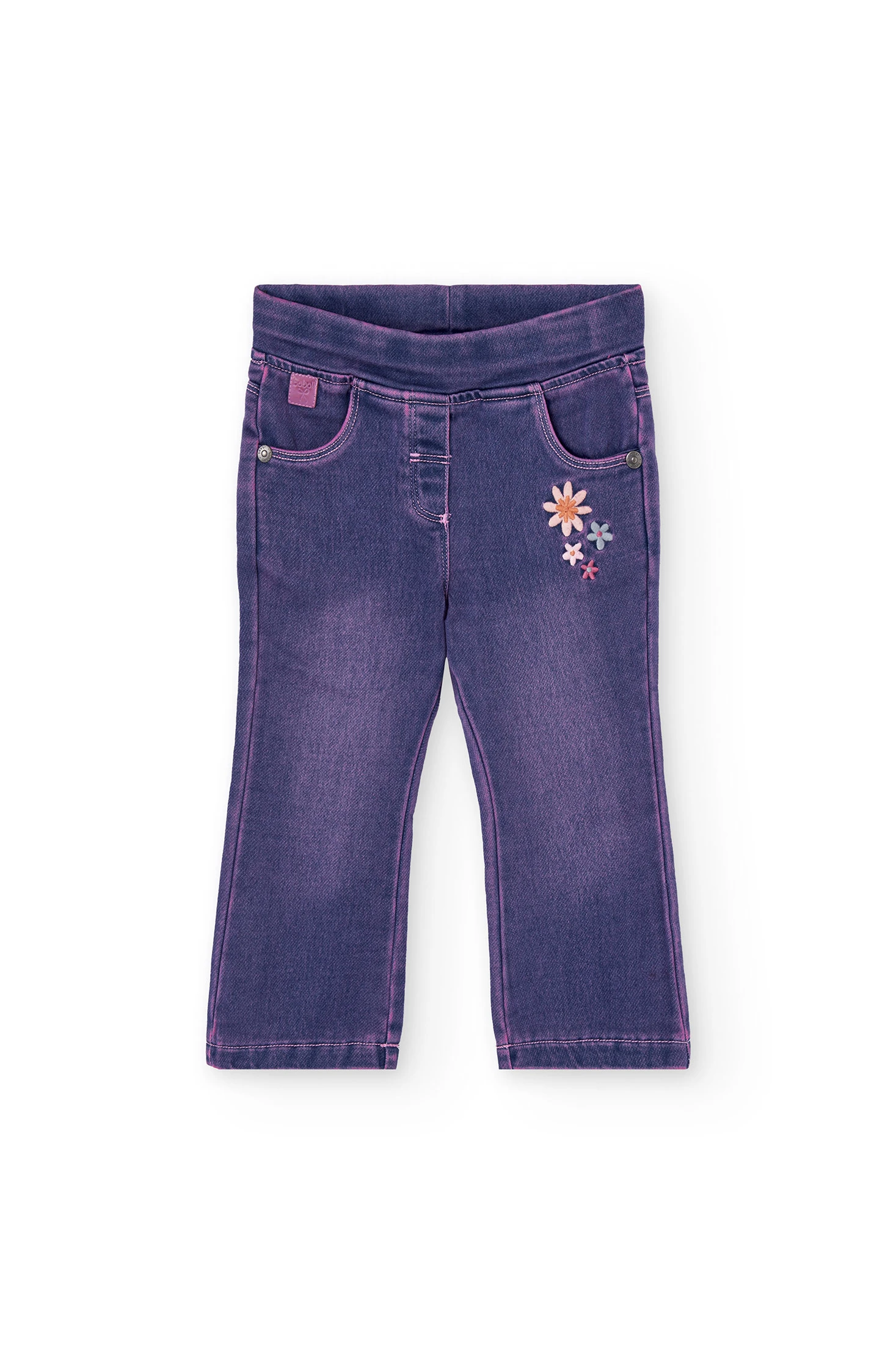 Calças de ganga de malha para menina em azul decoradas com flores, ideal para as estações de outono e inverno. Fabricadas num tecido suave e elástico, garantem conforto e liberdade de movimentos para o uso diário. Disponíveis em tamanhos que se adaptam a bebés de 12 meses a 10 anos, é uma peça versátil que combina facilmente com camisas e suéteres para um estilo moderno e alegre. Perfeito para pais que procuram uma opção prática e com estilo para os seus pequenos.
