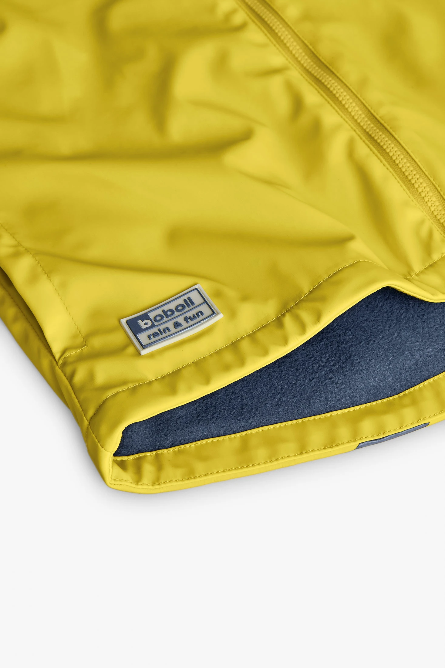Impermeável com capuz em amarelo para criança, ideal para dias chuvosos no outono e inverno, oferece uma excelente proteção contra a água. Confeccionado com material resistente à água, combina funcionalidade e estilo com um design alegre que se destaca. O capuz integrado e o fecho de correr garantem um ajuste confortável e prático, enquanto as mangas compridas oferecem proteção adicional contra o frio. Disponível em tamanhos de 2 a 12 anos, este impermeável é a escolha perfeita para um look infantil vibrante e seguro.