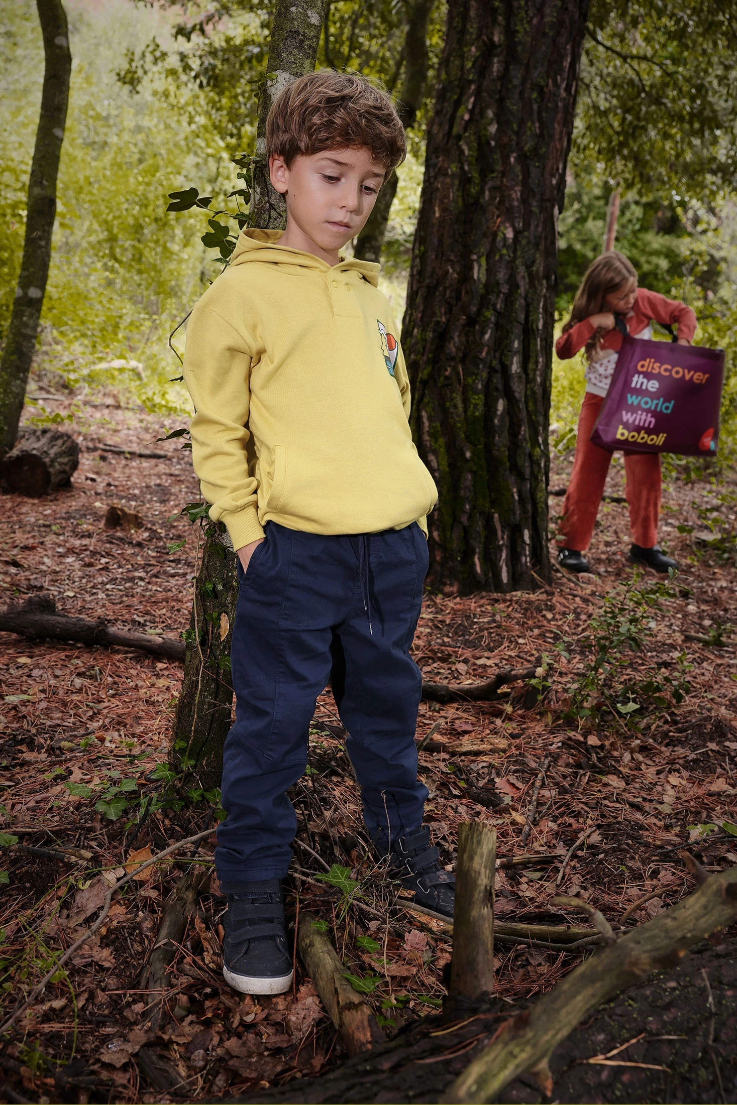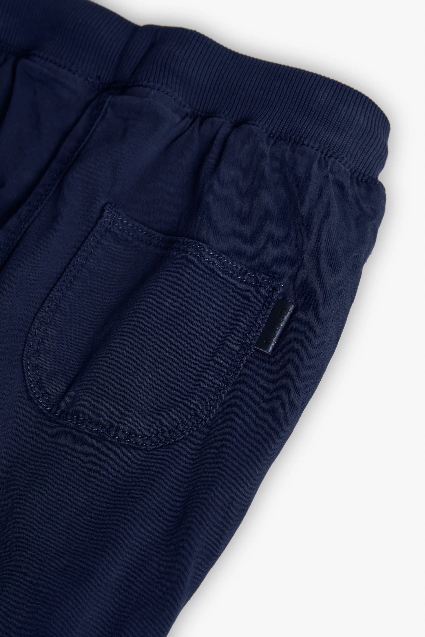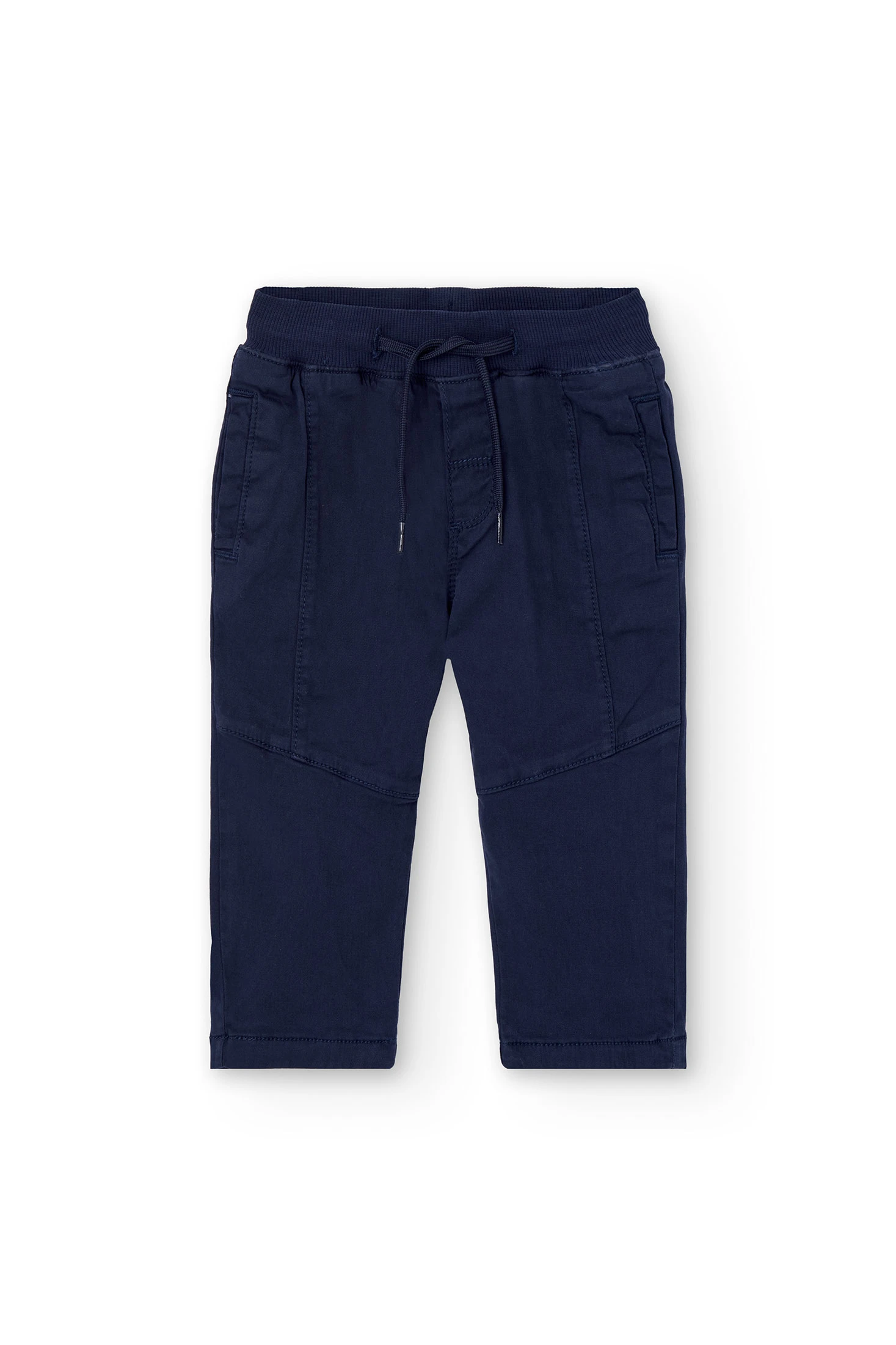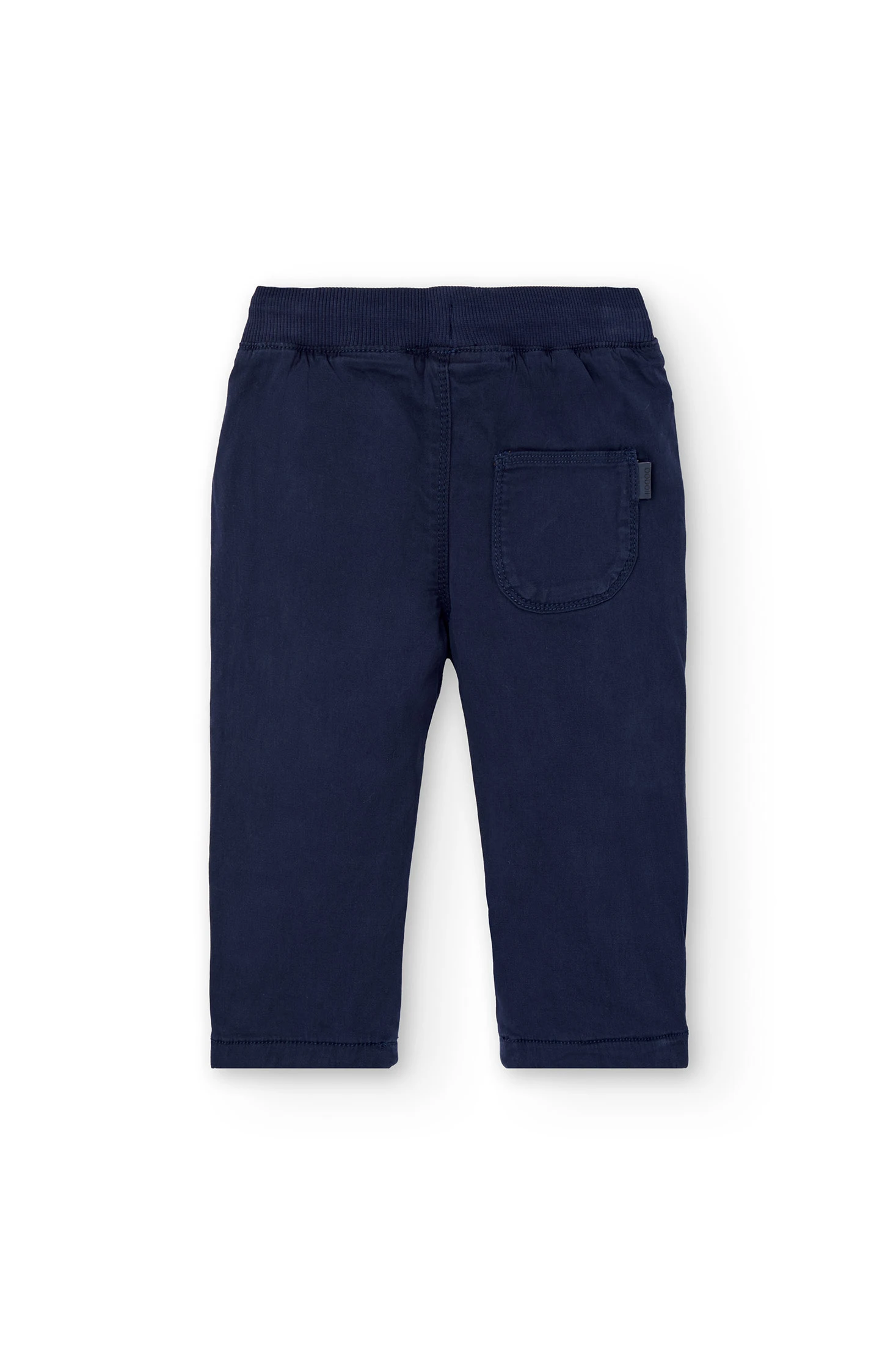 Calças de malha elástica azul-marinho para menino, ideal para o uso diário, proporcionando tanto estilo como conforto. Confeccionadas em gabardina elástica de alta qualidade, são perfeitas para as temporadas de outono e inverno, oferecendo liberdade de movimento com um ajuste seguro. Disponíveis em tamanhos de 12 meses a 10 anos, o seu design clássico combina perfeitamente com camisetas ou suéteres em tons neutros. Uma adição prática e moderna para o guarda-roupa do seu pequeno.